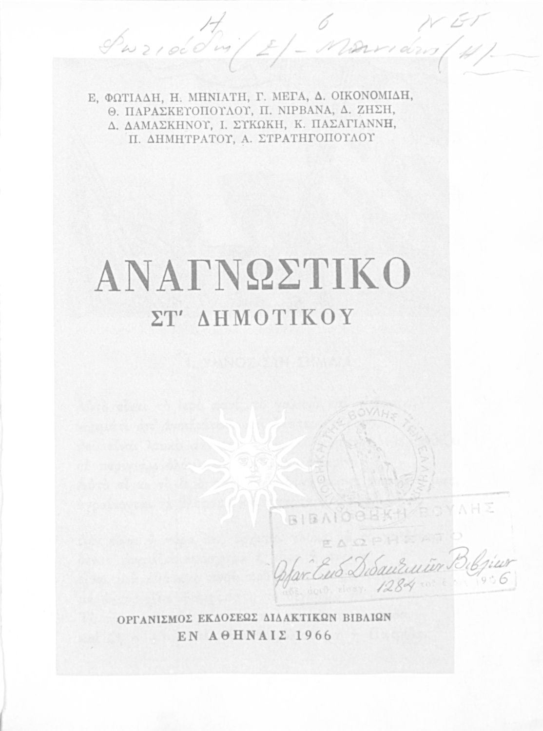 Εκδότης: Οργανισμός Εκδόσεως Διδακτικών Βιβλίων Έτος έκδοσης: 1966 Τόπος έκδοσης: Αθήνα Έκδοση: 2η Υπουργική απόφαση / Σύμβαση: 1341/30-6-1966, 1351/5-4-1966 Έτος έγκρισης: 1966 |