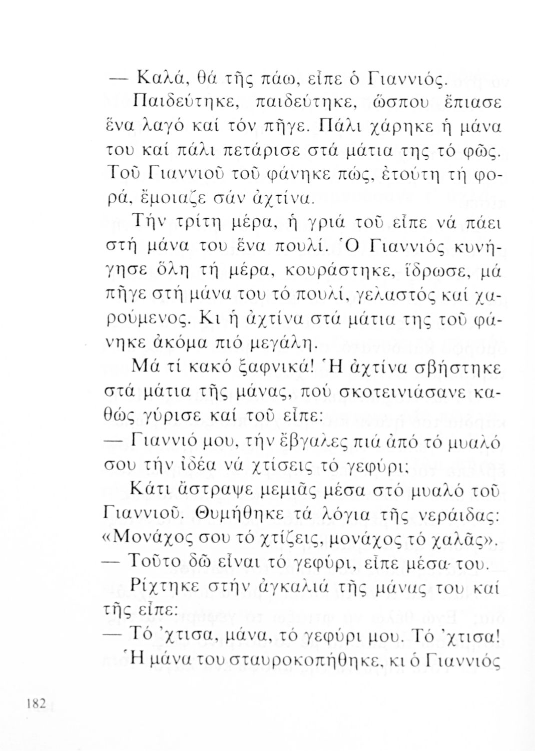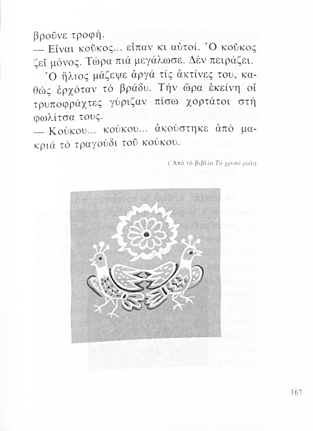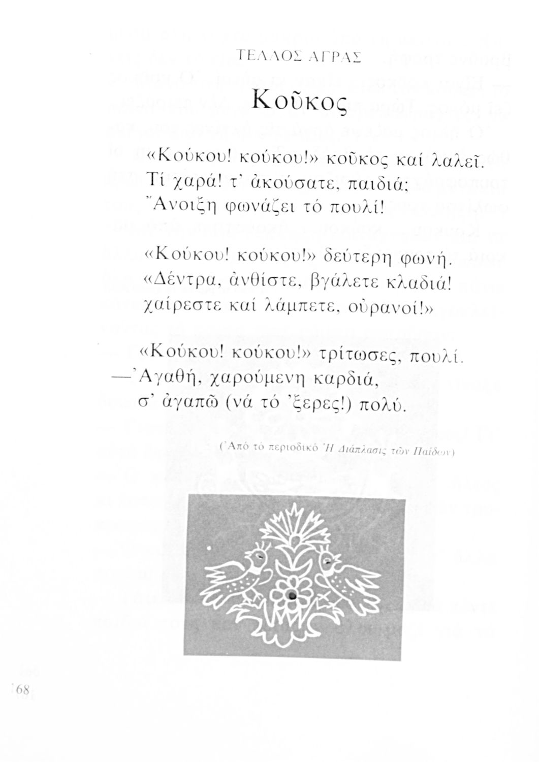 Αναγνωστικό που περιλαμβάνει πεζά και ποιήματα της νέας ελληνικής λογοτεχνίας για τους μαθητές του Δημοτικού. Το βιβλίο είναι αφιερωμένο στη μνήμη του Ζαχαρία Παπαντωνίου και αναδημοσιεύει αρκετά κείμενα από τα αναγνωστικά των εκπαιδευτικών μεταρρυθμίσεων του Ελευθερίου Βενιζέλου.