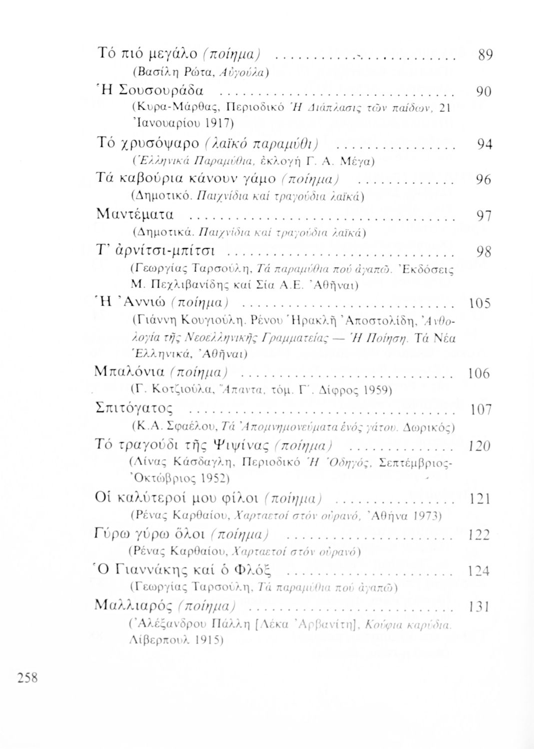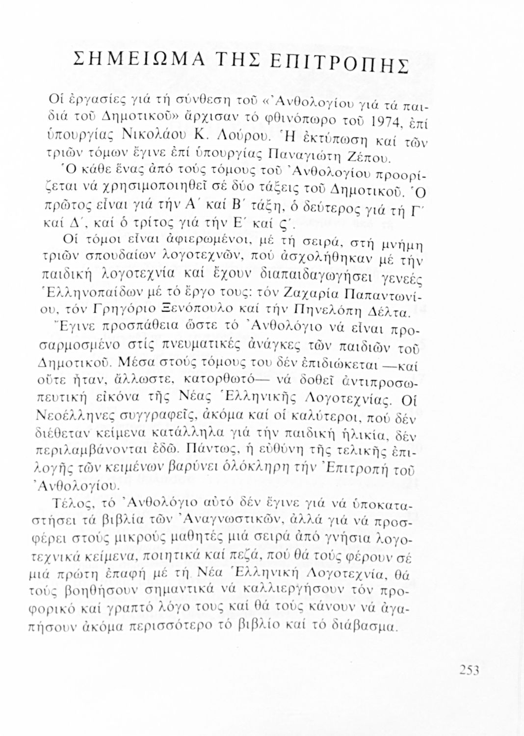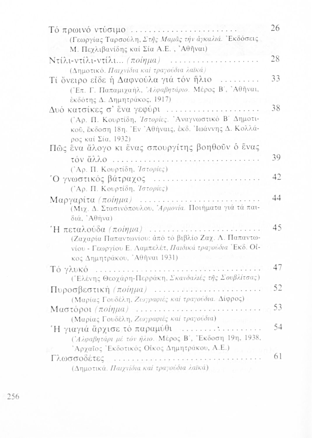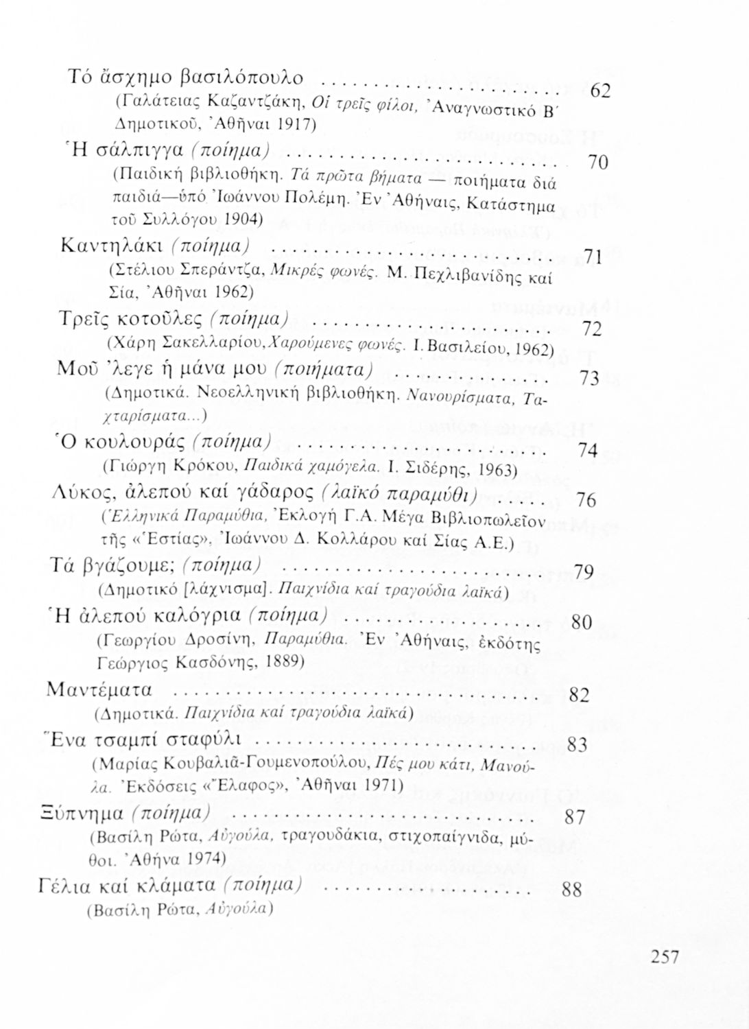 Αναγνωστικό που περιλαμβάνει πεζά και ποιήματα της νέας ελληνικής λογοτεχνίας για τους μαθητές του Δημοτικού. Το βιβλίο είναι αφιερωμένο στη μνήμη του Ζαχαρία Παπαντωνίου και αναδημοσιεύει αρκετά κείμενα από τα αναγνωστικά των εκπαιδευτικών μεταρρυθμίσεων του Ελευθερίου Βενιζέλου.