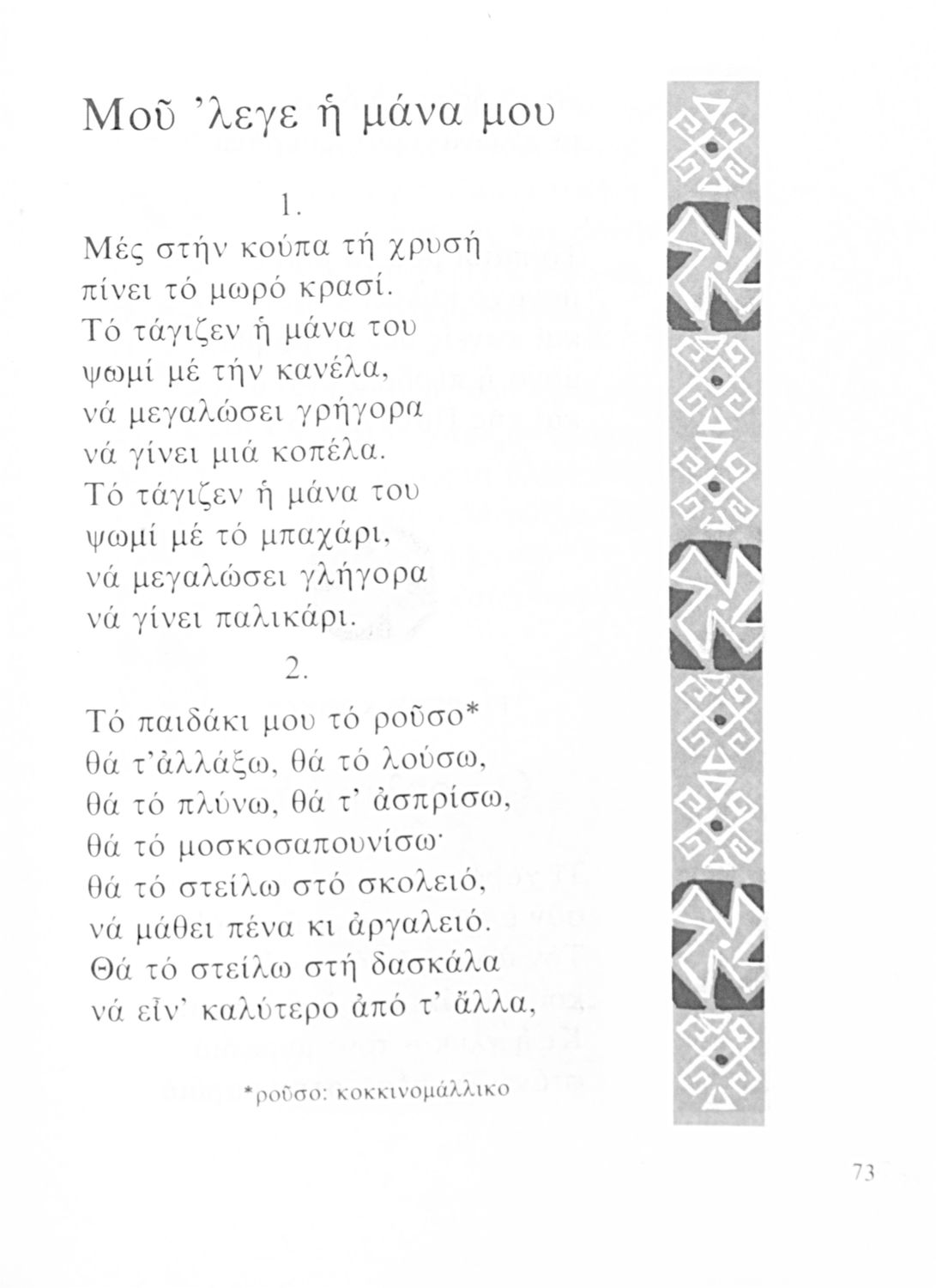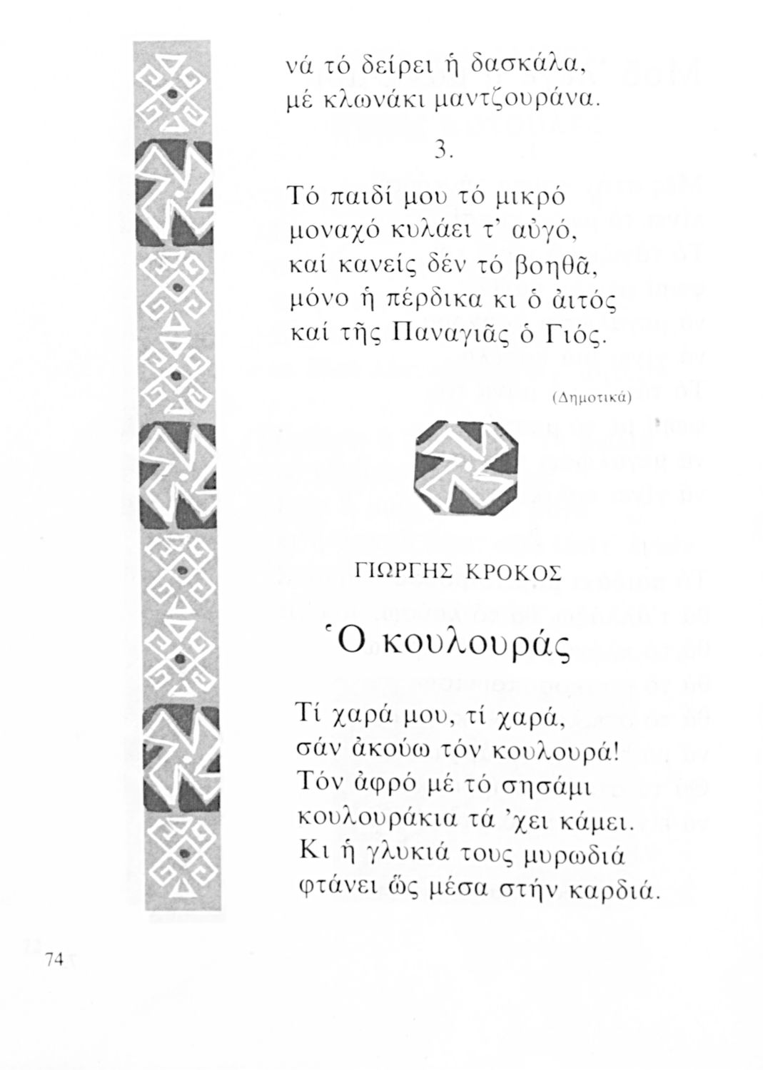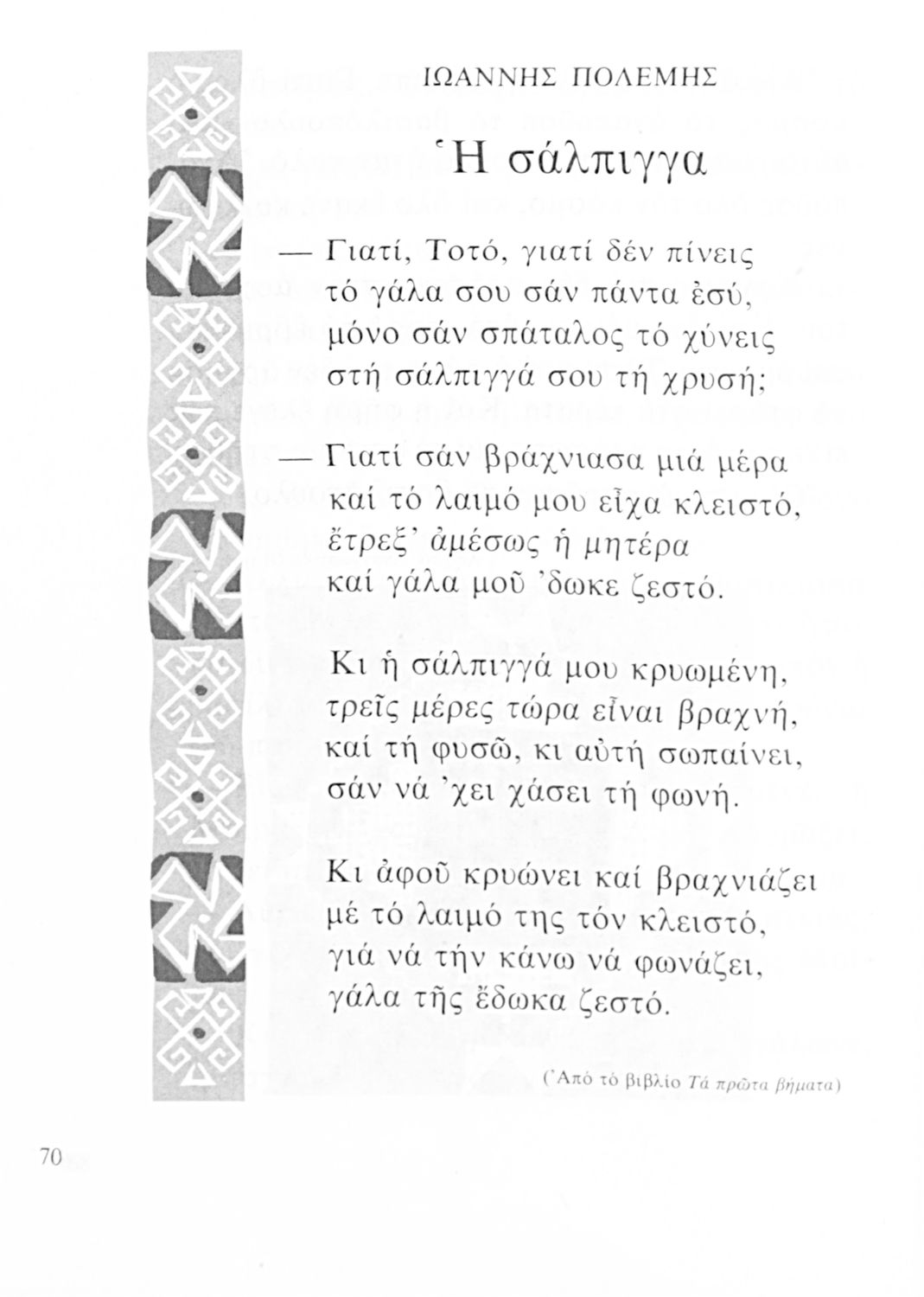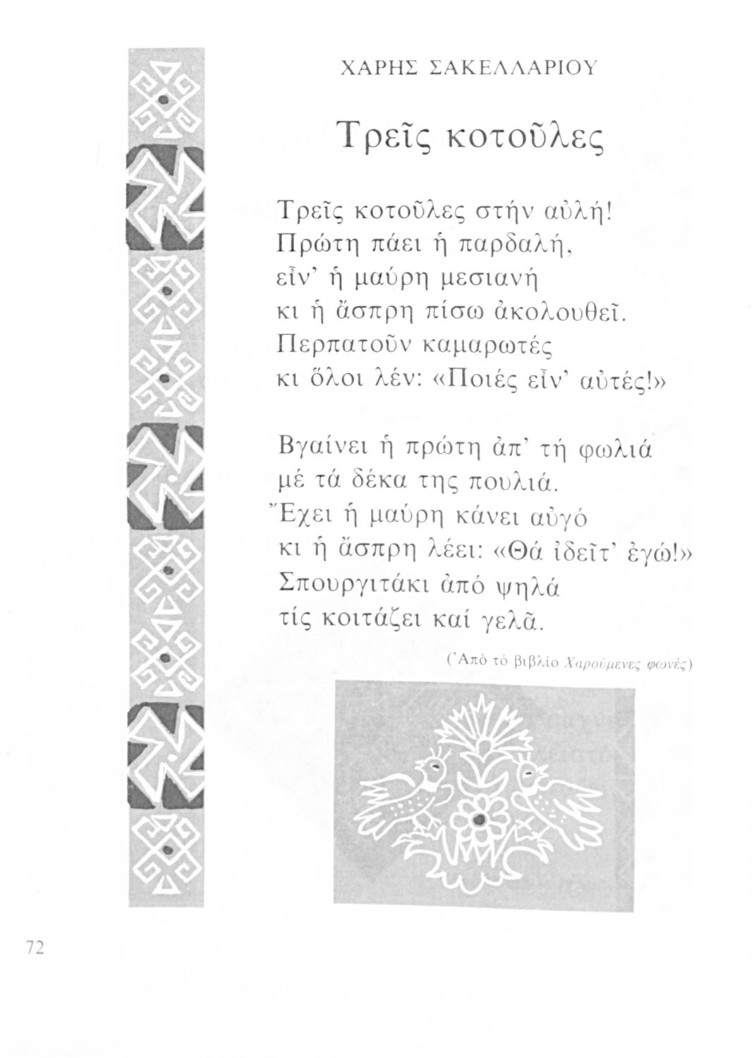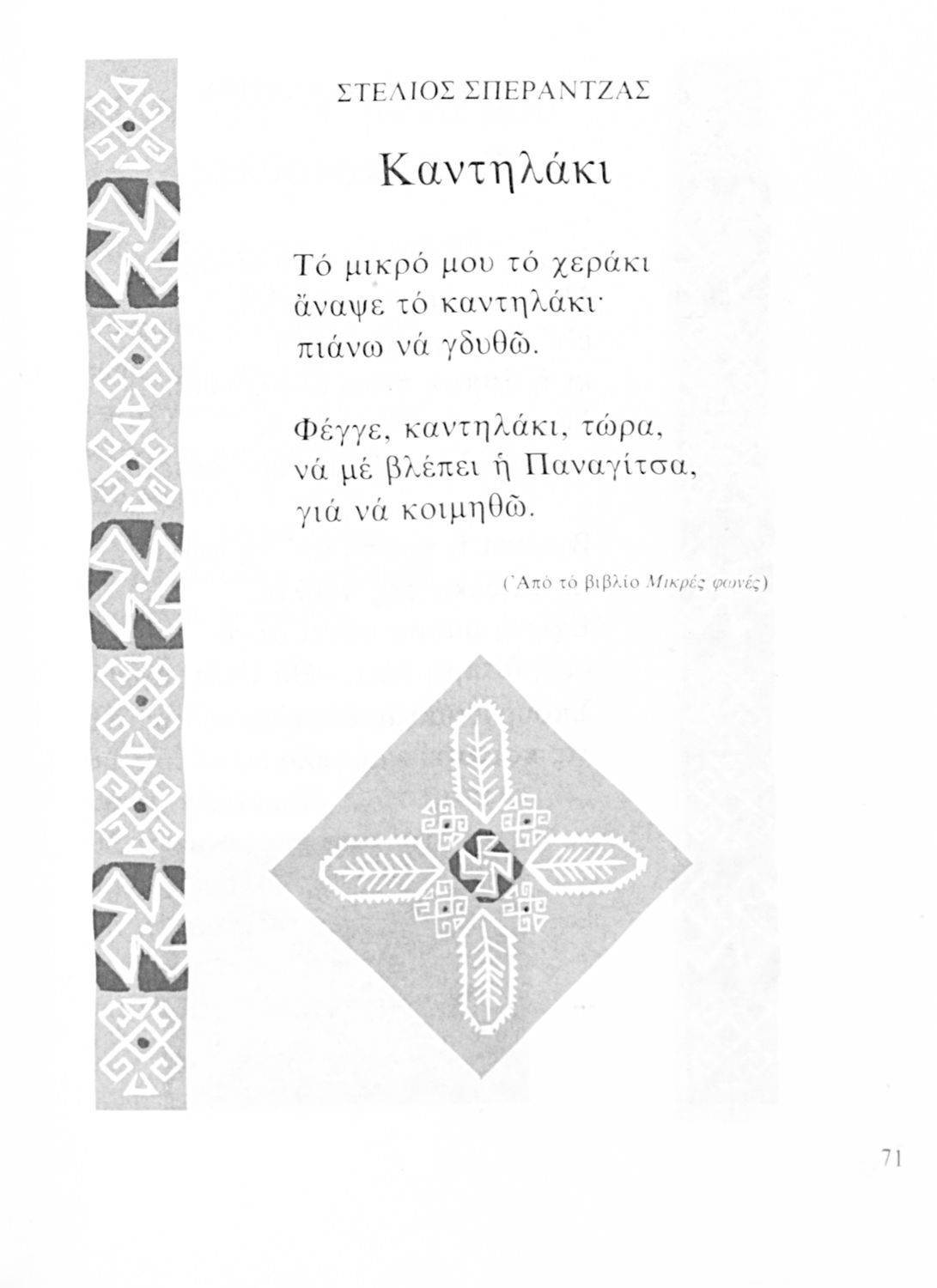 Αναγνωστικό που περιλαμβάνει πεζά και ποιήματα της νέας ελληνικής λογοτεχνίας για τους μαθητές του Δημοτικού. Το βιβλίο είναι αφιερωμένο στη μνήμη του Ζαχαρία Παπαντωνίου και αναδημοσιεύει αρκετά κείμενα από τα αναγνωστικά των εκπαιδευτικών μεταρρυθμίσεων του Ελευθερίου Βενιζέλου.