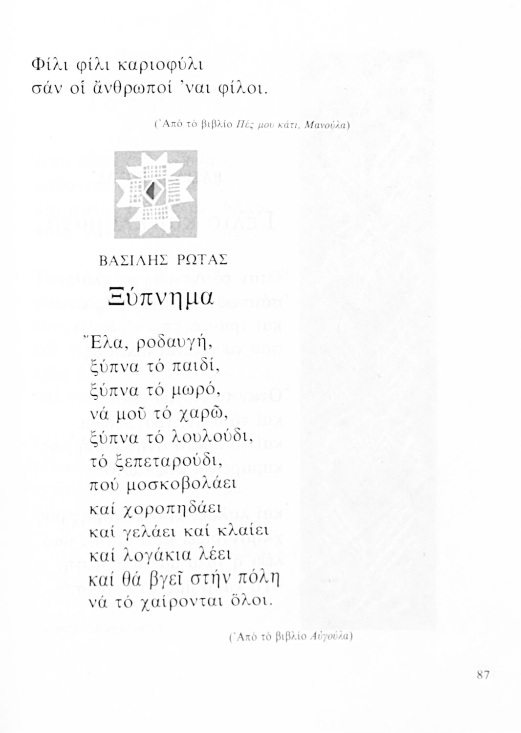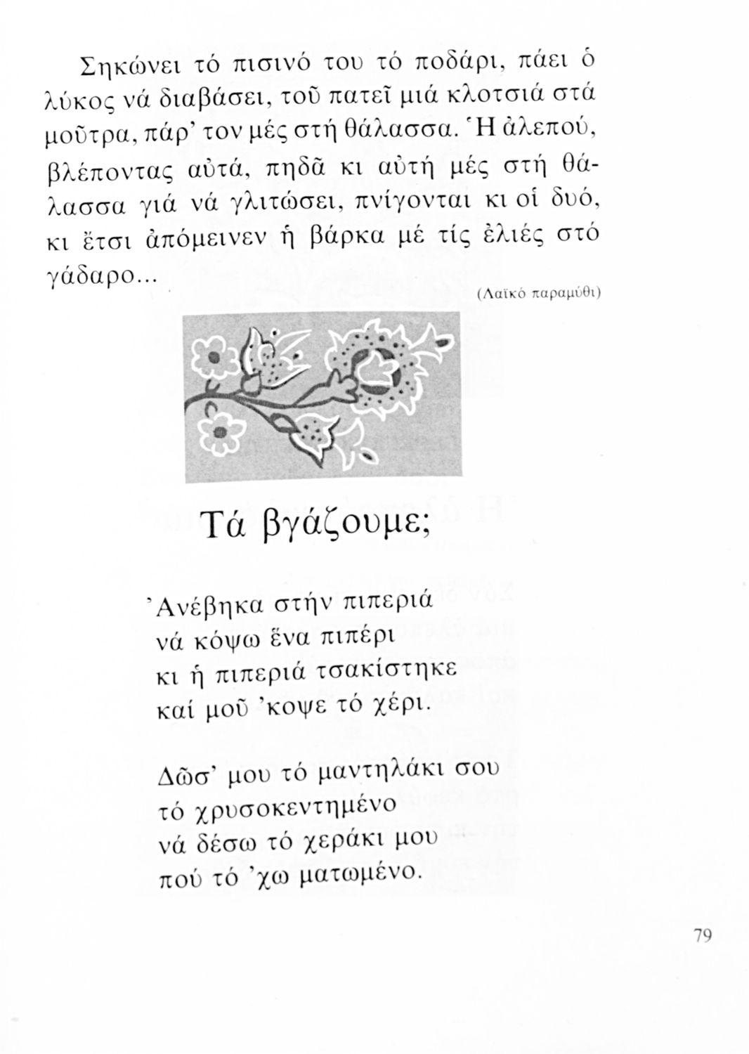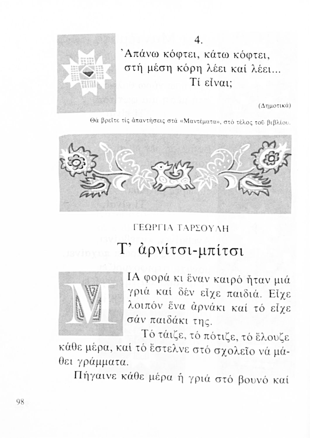 Αναγνωστικό που περιλαμβάνει πεζά και ποιήματα της νέας ελληνικής λογοτεχνίας για τους μαθητές του Δημοτικού. Το βιβλίο είναι αφιερωμένο στη μνήμη του Ζαχαρία Παπαντωνίου και αναδημοσιεύει αρκετά κείμενα από τα αναγνωστικά των εκπαιδευτικών μεταρρυθμίσεων του Ελευθερίου Βενιζέλου.