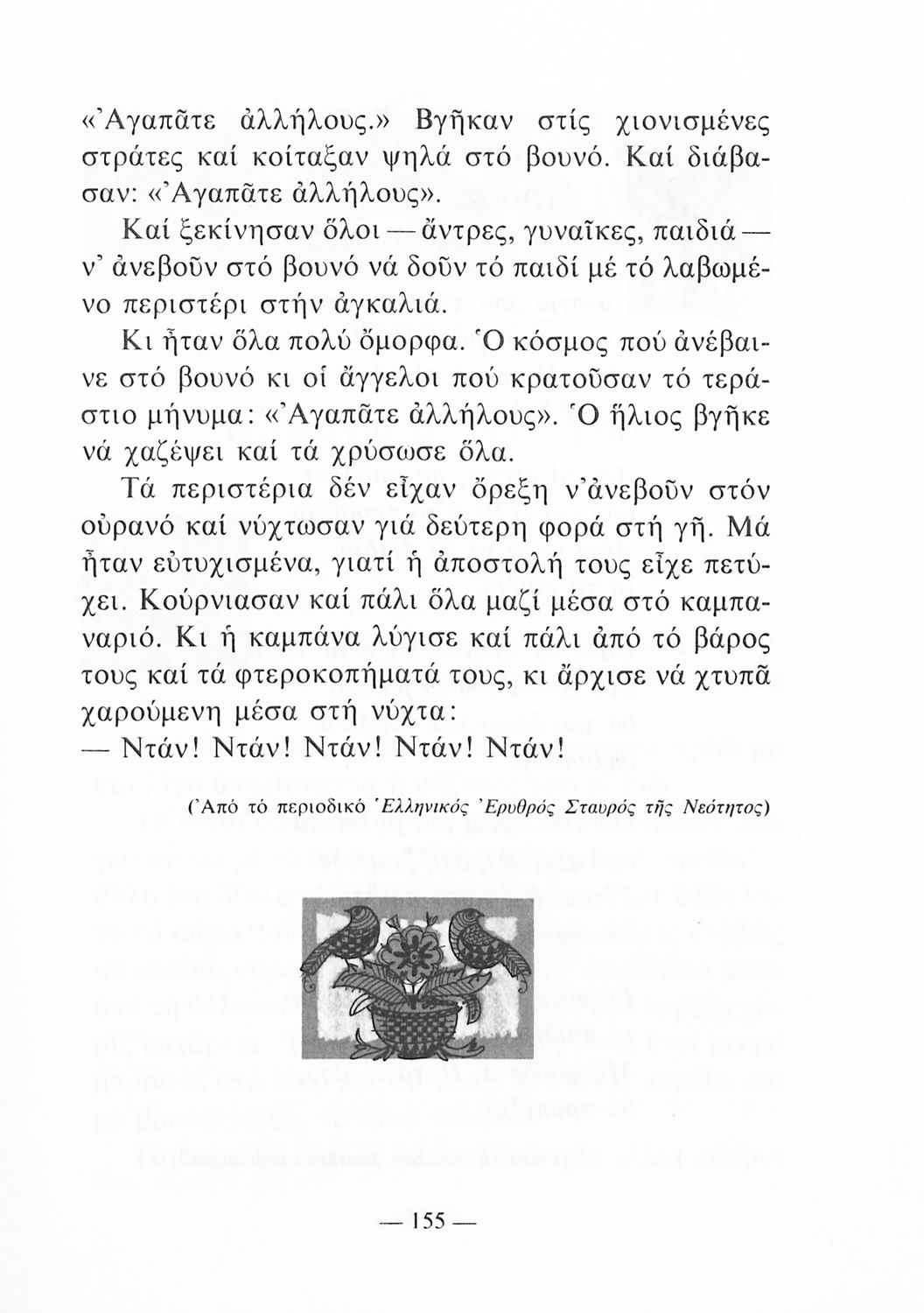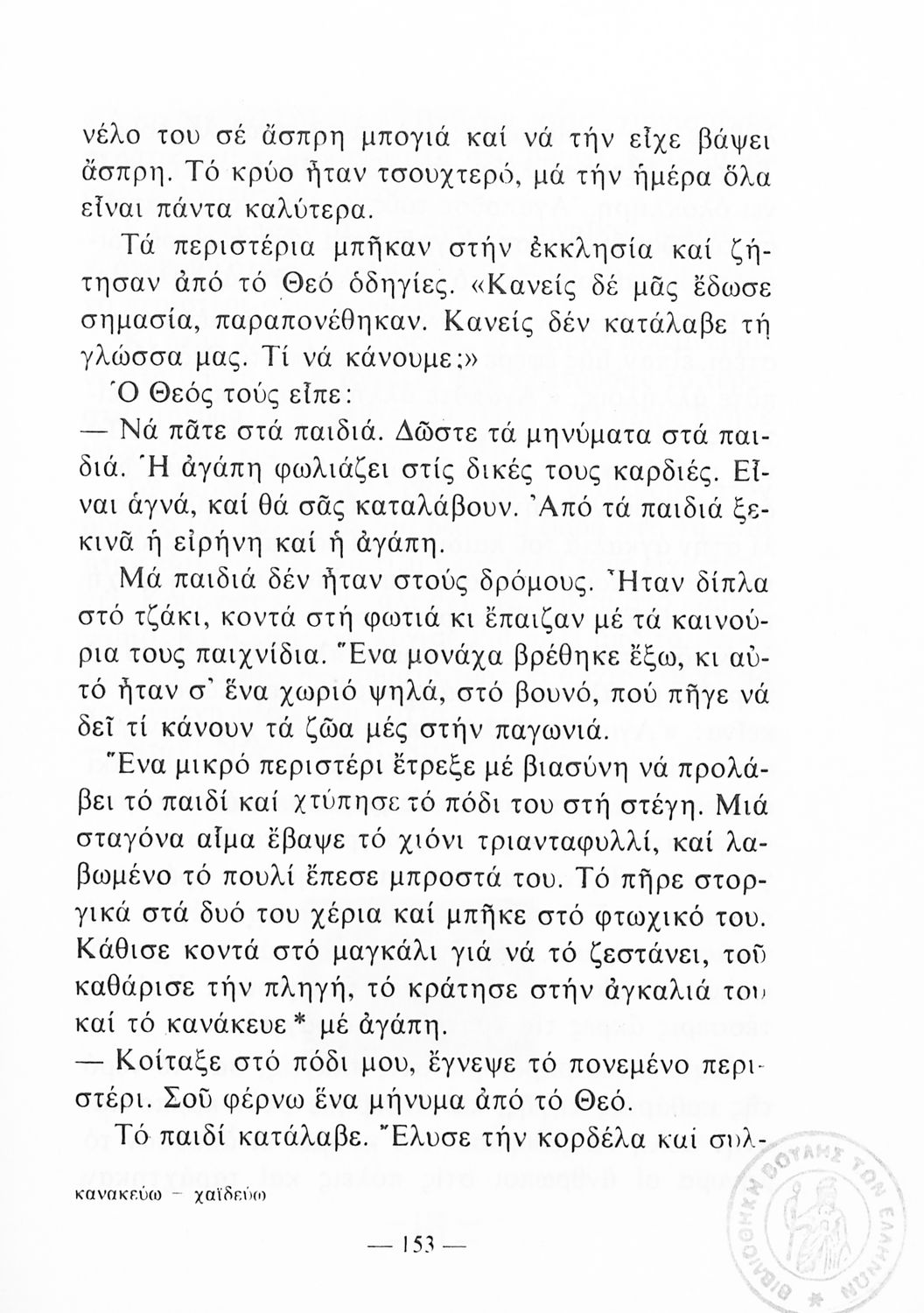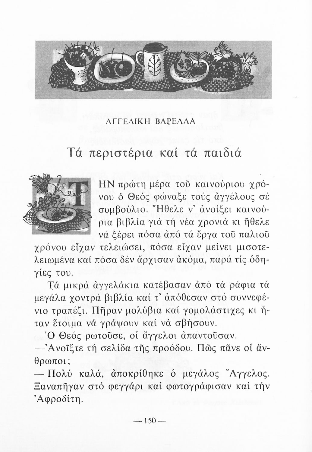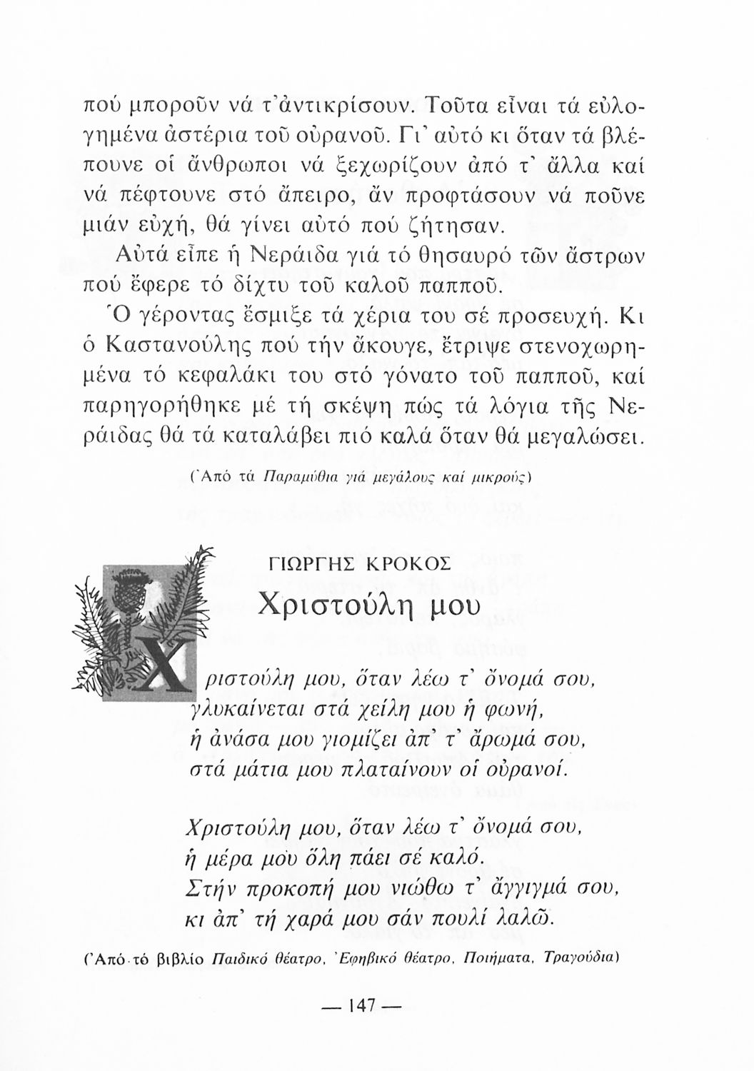 Αναγνωστικό για τους μαθητές της Γ΄ και Δ΄ Δημοτικού που περιλαμβάνει με πεζά και ποιήματα της νέας ελληνικής λογοτεχνίας εμπνευσμένα από την καθημερινότητα των παιδιών και των οικογενειών τους, την ελληνική ιστορία, τις οικογενειακές στιγμές και εορτές, το παιχνίδι, τα επαγγέλματα και τις ασχολίες των ανθρώπων. Το βιβλίο είναι αφιερωμένο στη μνήμη του Γρηγορίου Ξενόπουλου.