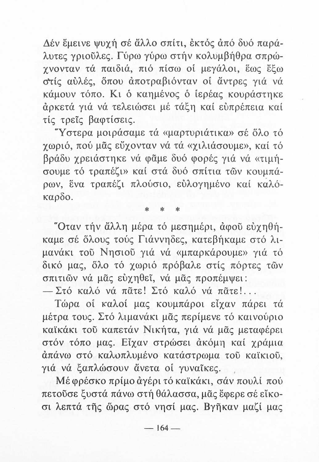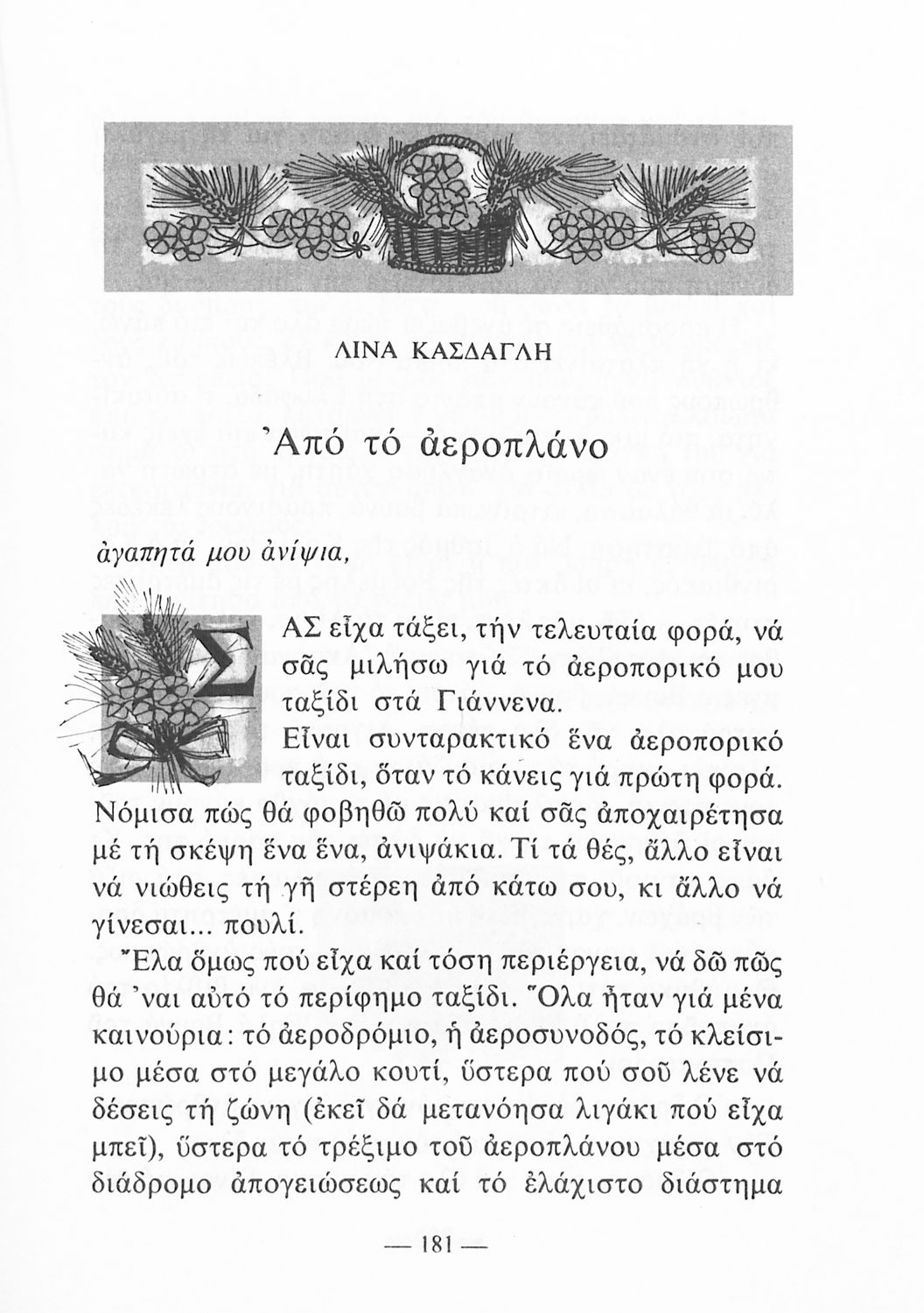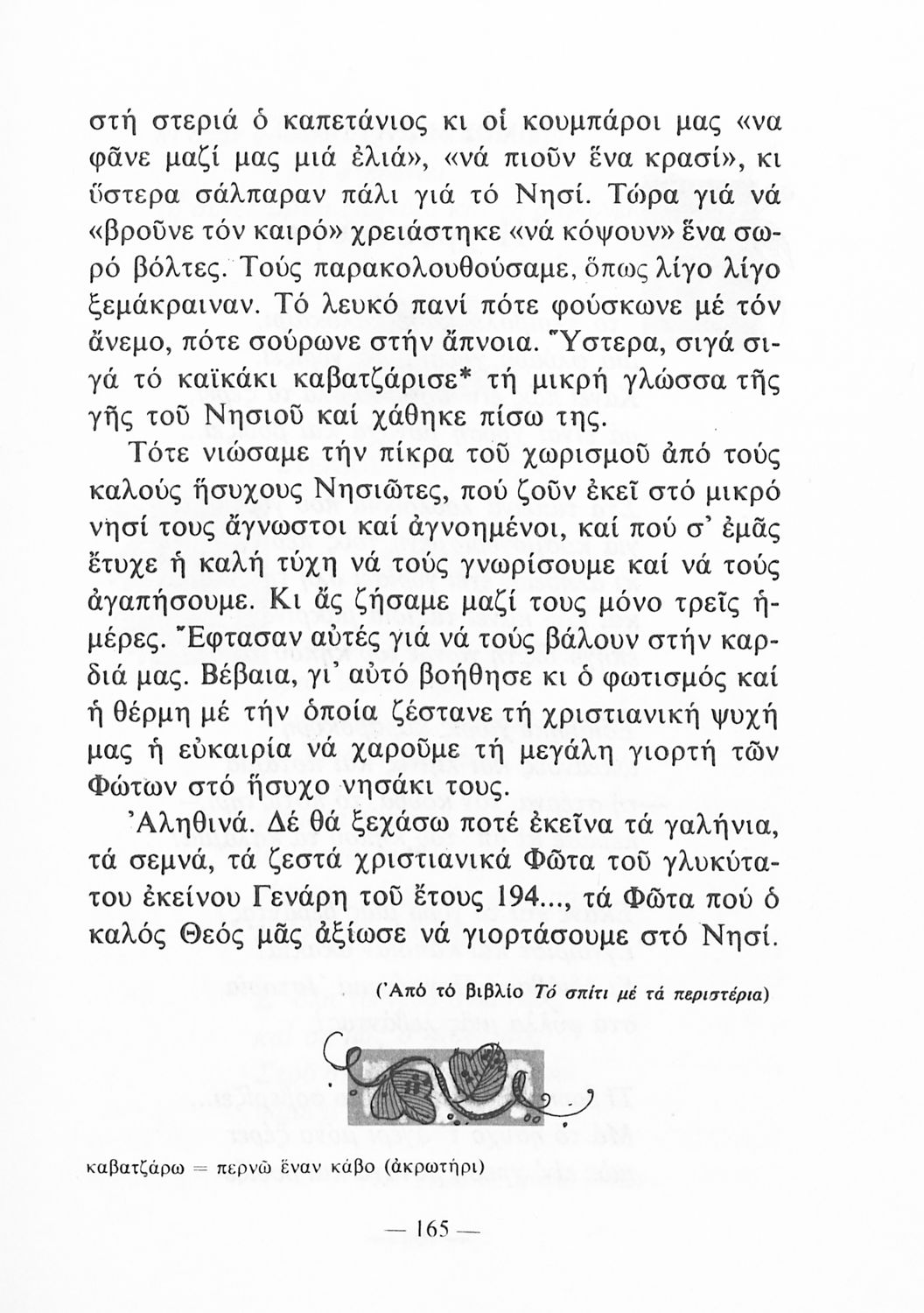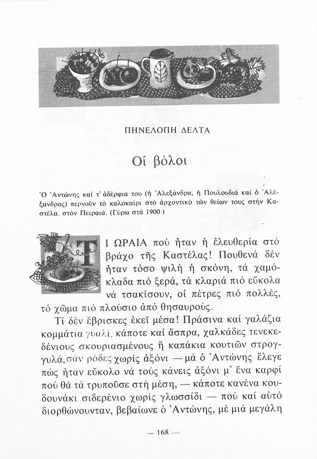 Αναγνωστικό για τους μαθητές της Γ΄ και Δ΄ Δημοτικού που περιλαμβάνει με πεζά και ποιήματα της νέας ελληνικής λογοτεχνίας εμπνευσμένα από την καθημερινότητα των παιδιών και των οικογενειών τους, την ελληνική ιστορία, τις οικογενειακές στιγμές και εορτές, το παιχνίδι, τα επαγγέλματα και τις ασχολίες των ανθρώπων. Το βιβλίο είναι αφιερωμένο στη μνήμη του Γρηγορίου Ξενόπουλου.