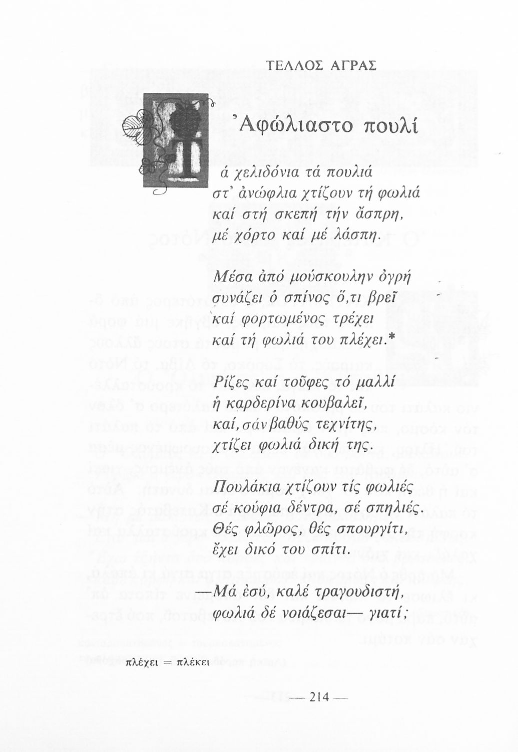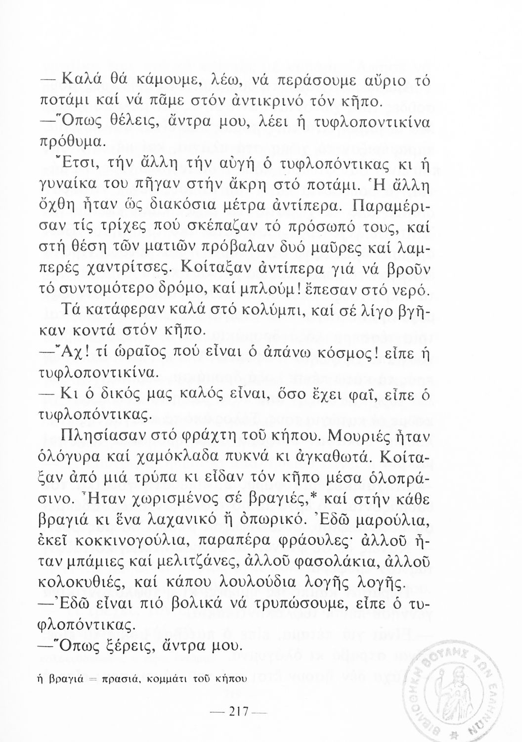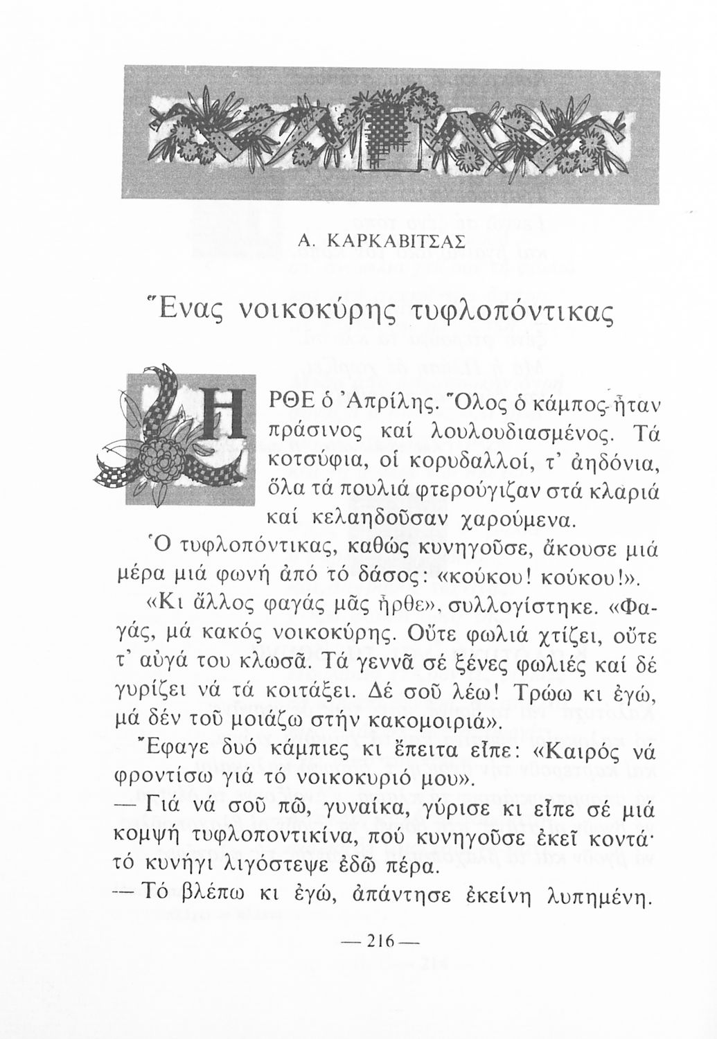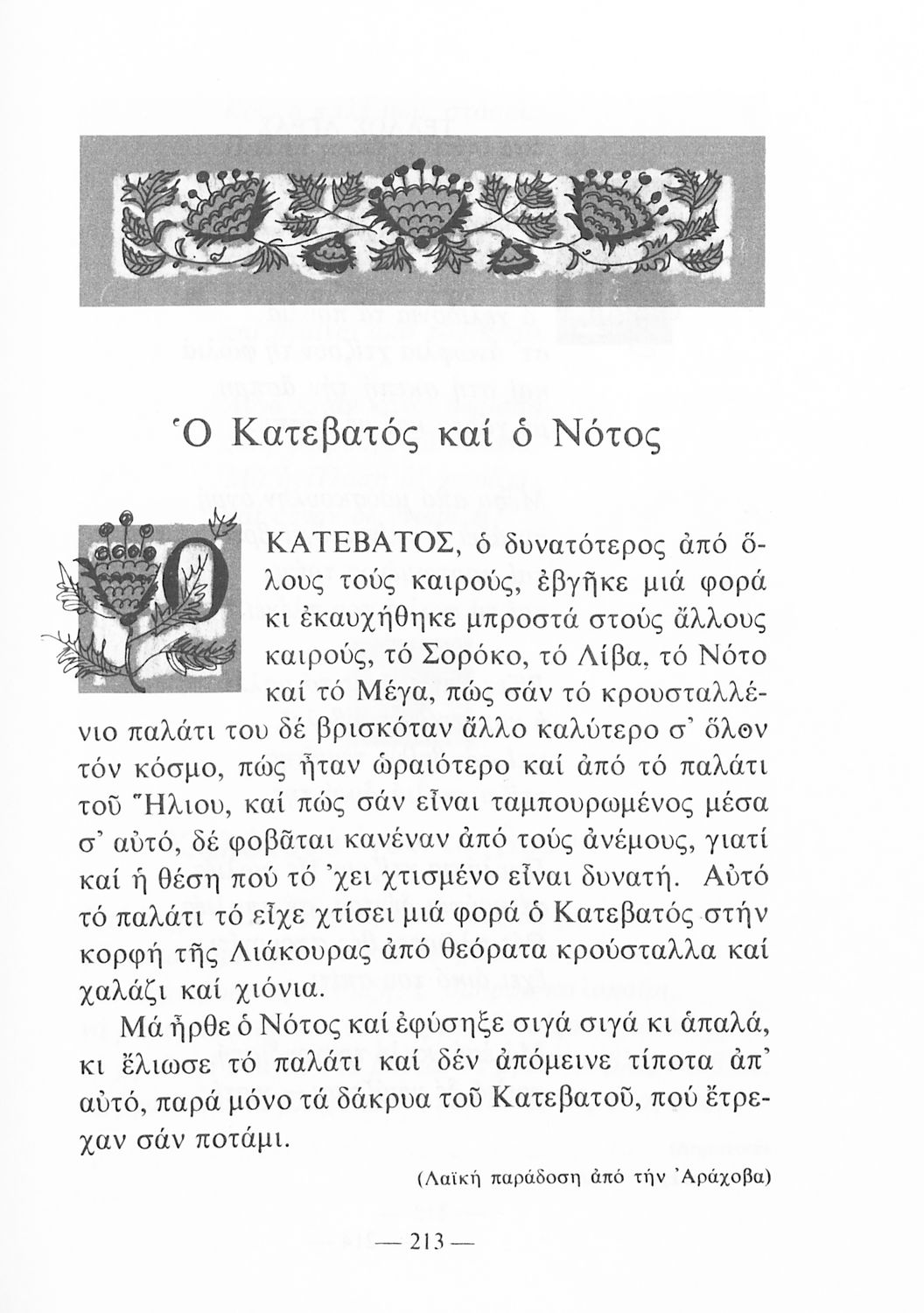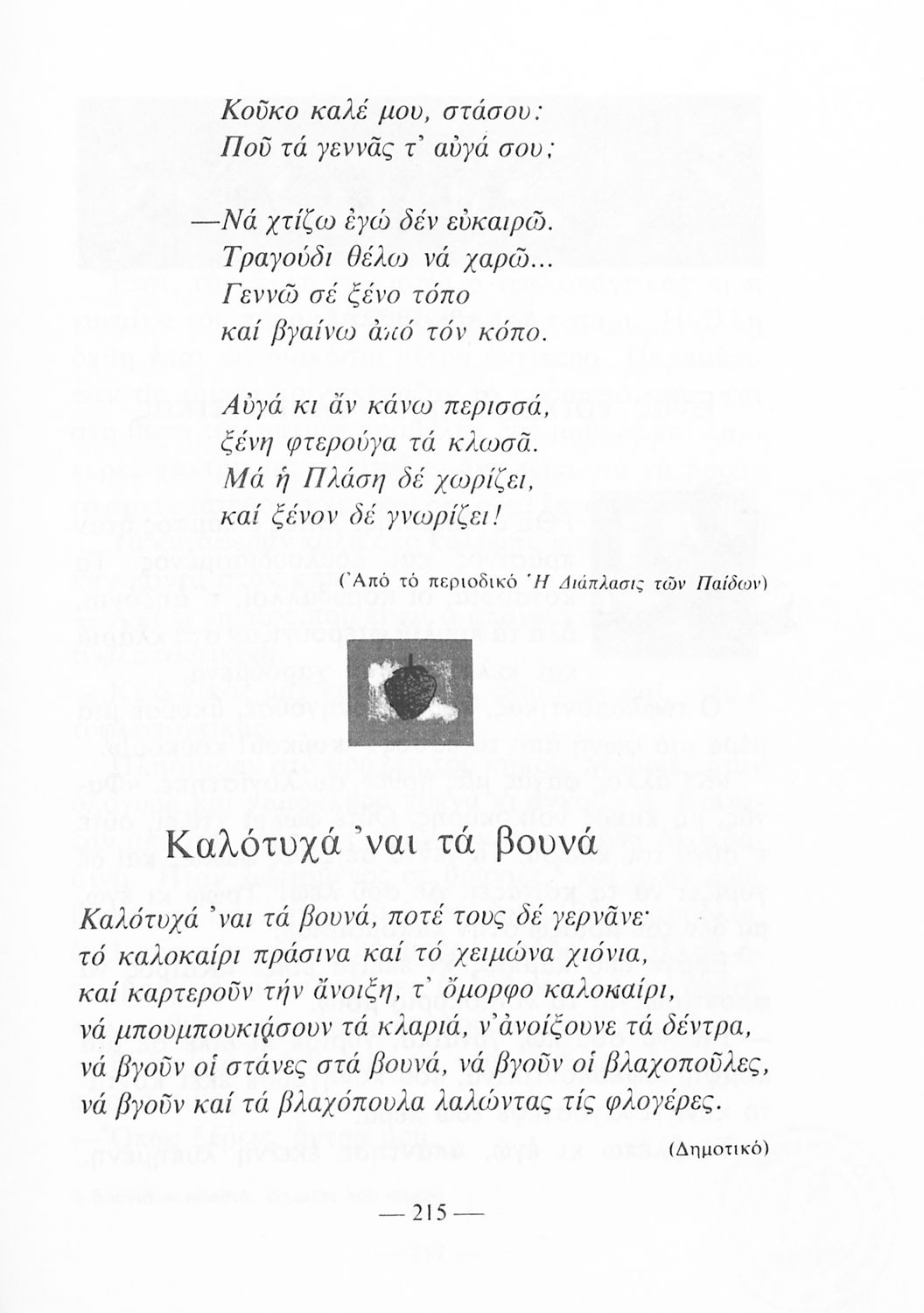 Αναγνωστικό για τους μαθητές της Γ΄ και Δ΄ Δημοτικού που περιλαμβάνει με πεζά και ποιήματα της νέας ελληνικής λογοτεχνίας εμπνευσμένα από την καθημερινότητα των παιδιών και των οικογενειών τους, την ελληνική ιστορία, τις οικογενειακές στιγμές και εορτές, το παιχνίδι, τα επαγγέλματα και τις ασχολίες των ανθρώπων. Το βιβλίο είναι αφιερωμένο στη μνήμη του Γρηγορίου Ξενόπουλου.