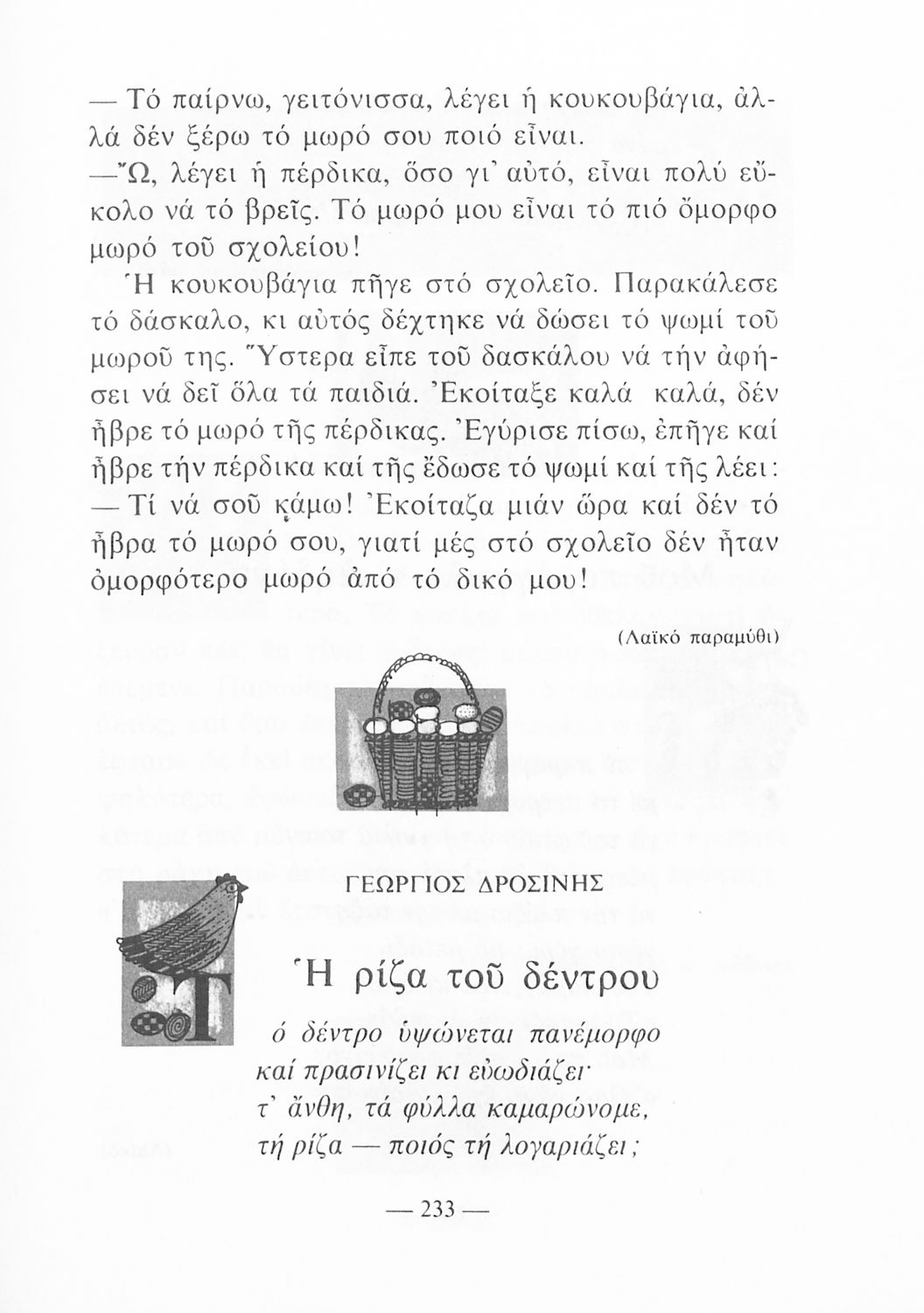 Αναγνωστικό για τους μαθητές της Γ΄ και Δ΄ Δημοτικού που περιλαμβάνει με πεζά και ποιήματα της νέας ελληνικής λογοτεχνίας εμπνευσμένα από την καθημερινότητα των παιδιών και των οικογενειών τους, την ελληνική ιστορία, τις οικογενειακές στιγμές και εορτές, το παιχνίδι, τα επαγγέλματα και τις ασχολίες των ανθρώπων. Το βιβλίο είναι αφιερωμένο στη μνήμη του Γρηγορίου Ξενόπουλου.