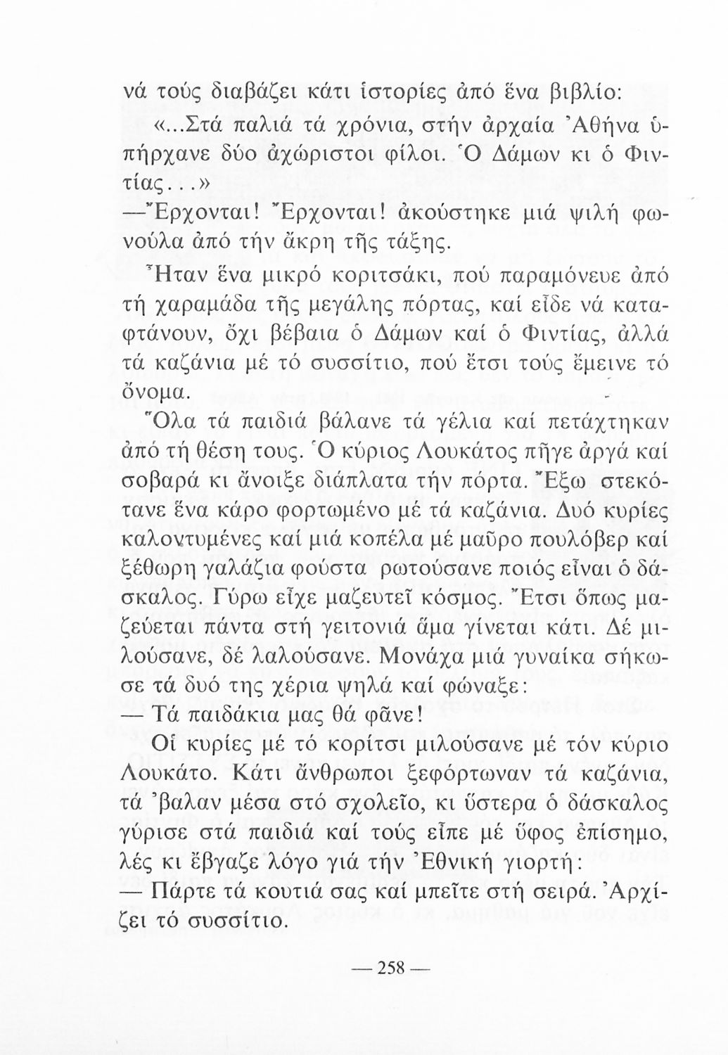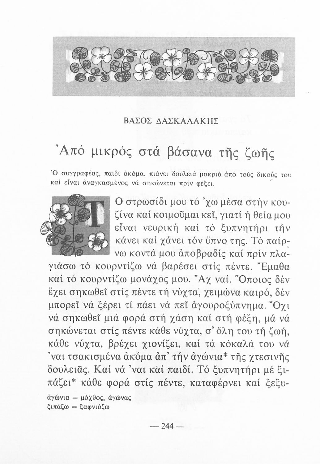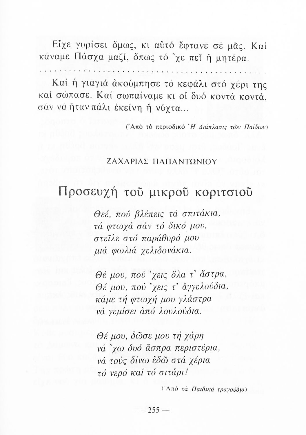 Αναγνωστικό για τους μαθητές της Γ΄ και Δ΄ Δημοτικού που περιλαμβάνει με πεζά και ποιήματα της νέας ελληνικής λογοτεχνίας εμπνευσμένα από την καθημερινότητα των παιδιών και των οικογενειών τους, την ελληνική ιστορία, τις οικογενειακές στιγμές και εορτές, το παιχνίδι, τα επαγγέλματα και τις ασχολίες των ανθρώπων. Το βιβλίο είναι αφιερωμένο στη μνήμη του Γρηγορίου Ξενόπουλου.