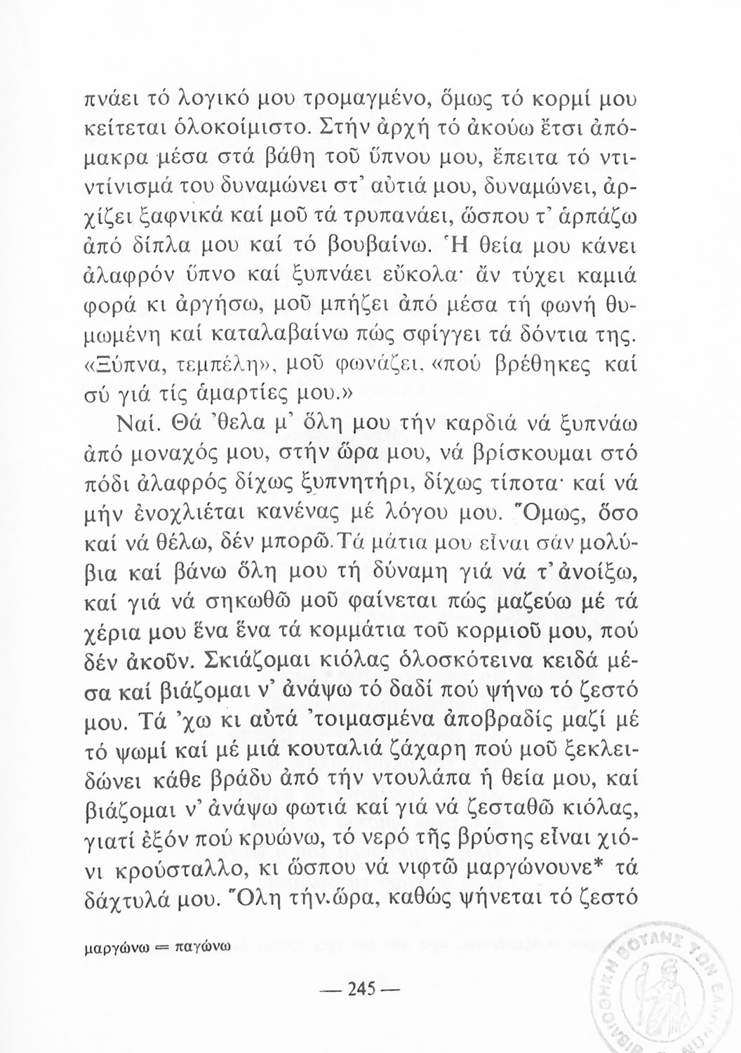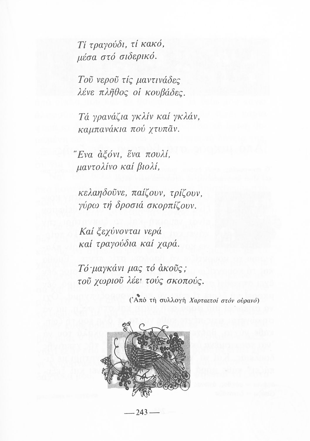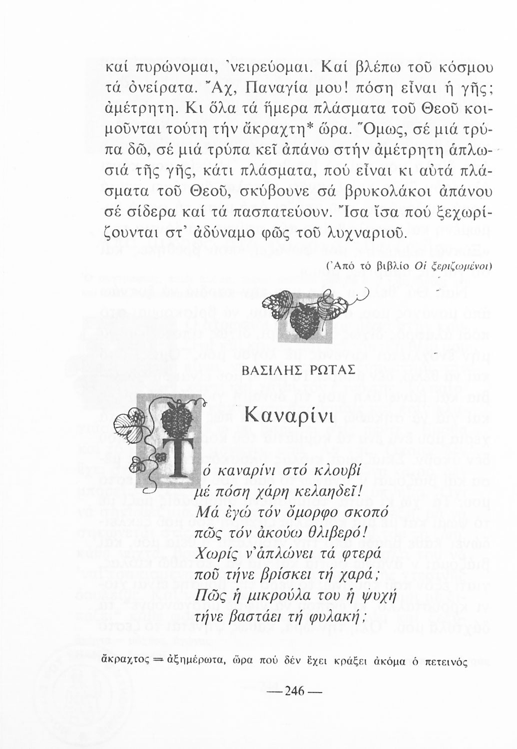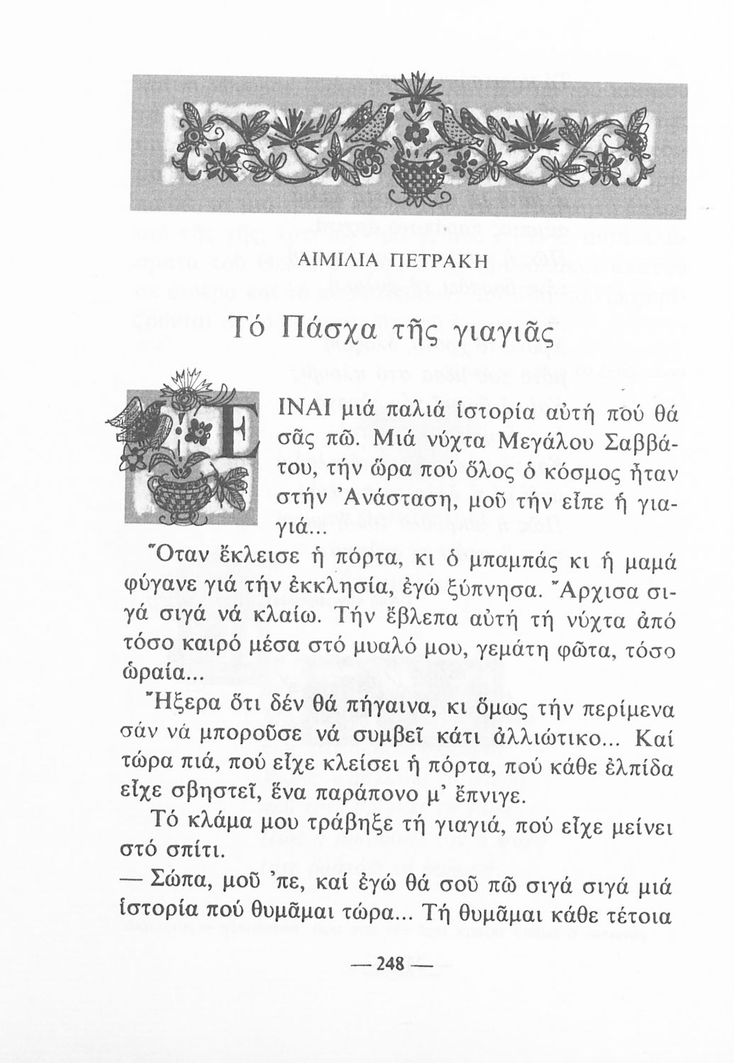 Αναγνωστικό για τους μαθητές της Γ΄ και Δ΄ Δημοτικού που περιλαμβάνει με πεζά και ποιήματα της νέας ελληνικής λογοτεχνίας εμπνευσμένα από την καθημερινότητα των παιδιών και των οικογενειών τους, την ελληνική ιστορία, τις οικογενειακές στιγμές και εορτές, το παιχνίδι, τα επαγγέλματα και τις ασχολίες των ανθρώπων. Το βιβλίο είναι αφιερωμένο στη μνήμη του Γρηγορίου Ξενόπουλου.