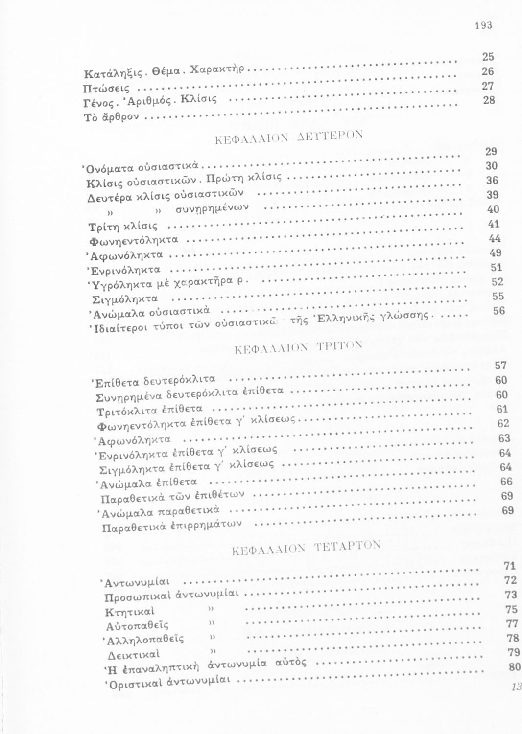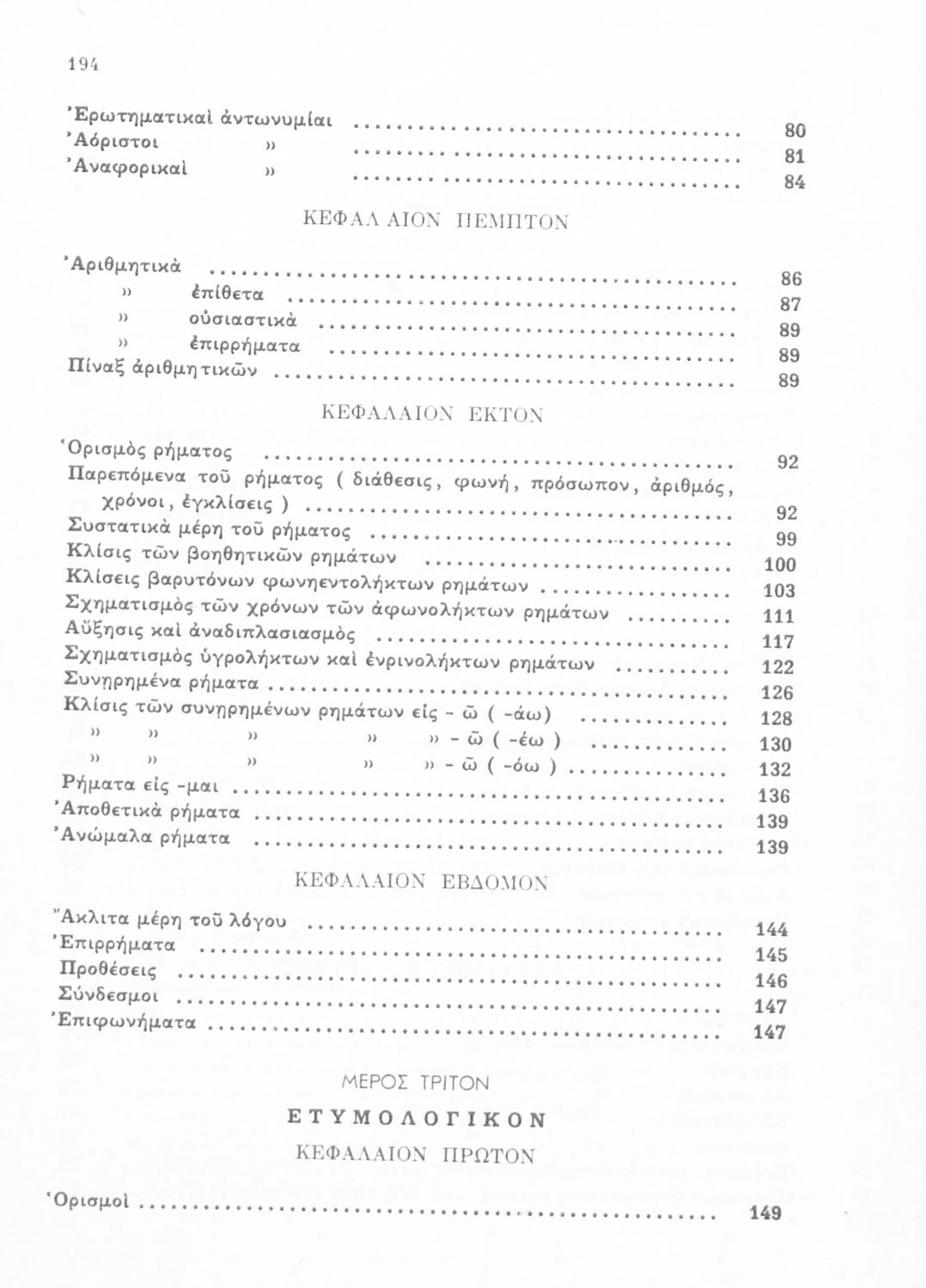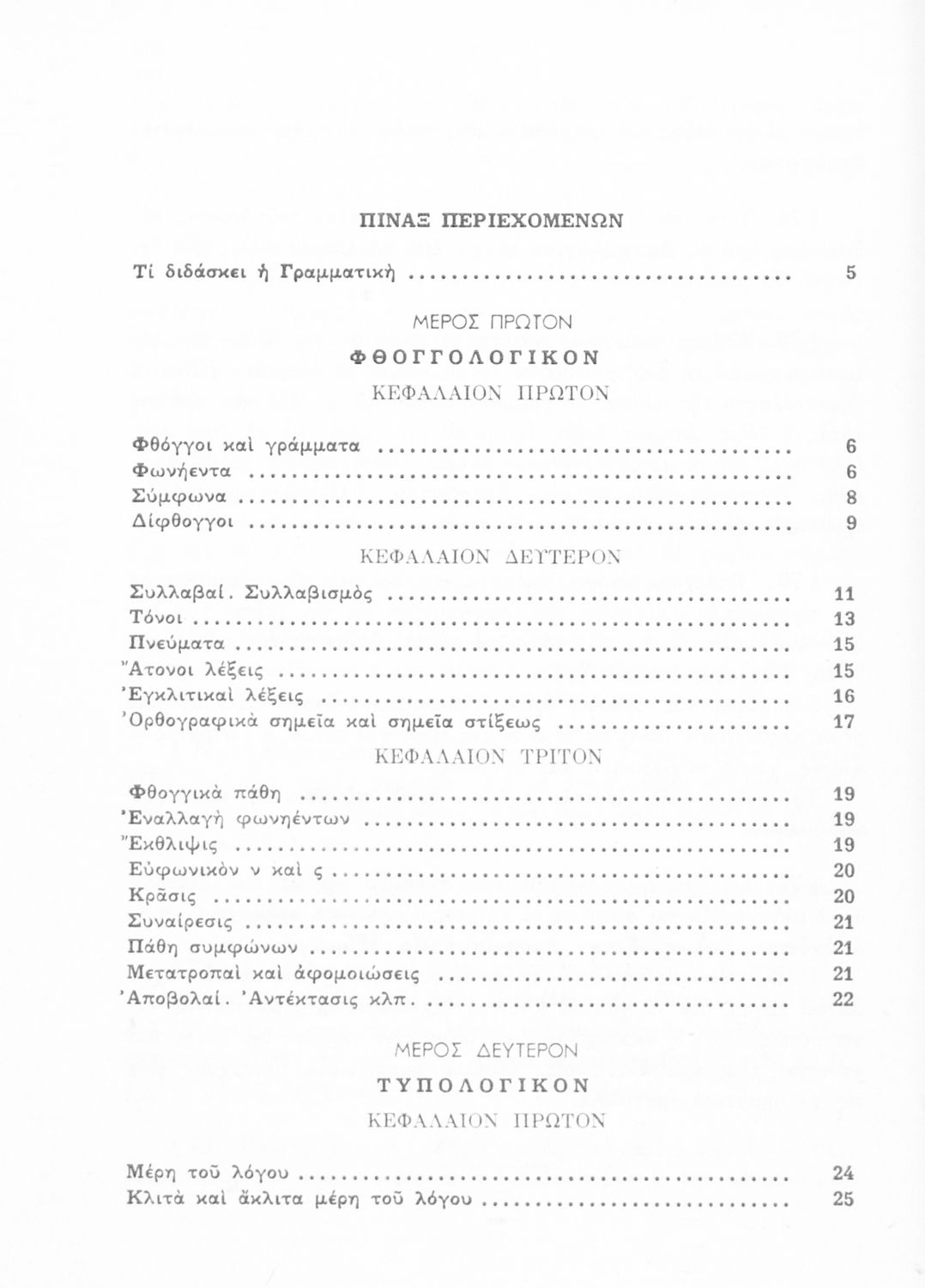 Σχολικό εγχειρίδιο Γλώσσας Δημοτικού που περιλαμβάνει γραμματική και συντακτικό και είναι χωρισμένο σε φθογγολογικό, τυπολογικό και ετυμολογικό μέρος. Φέρει το σύμβολο της δικτατορίας.