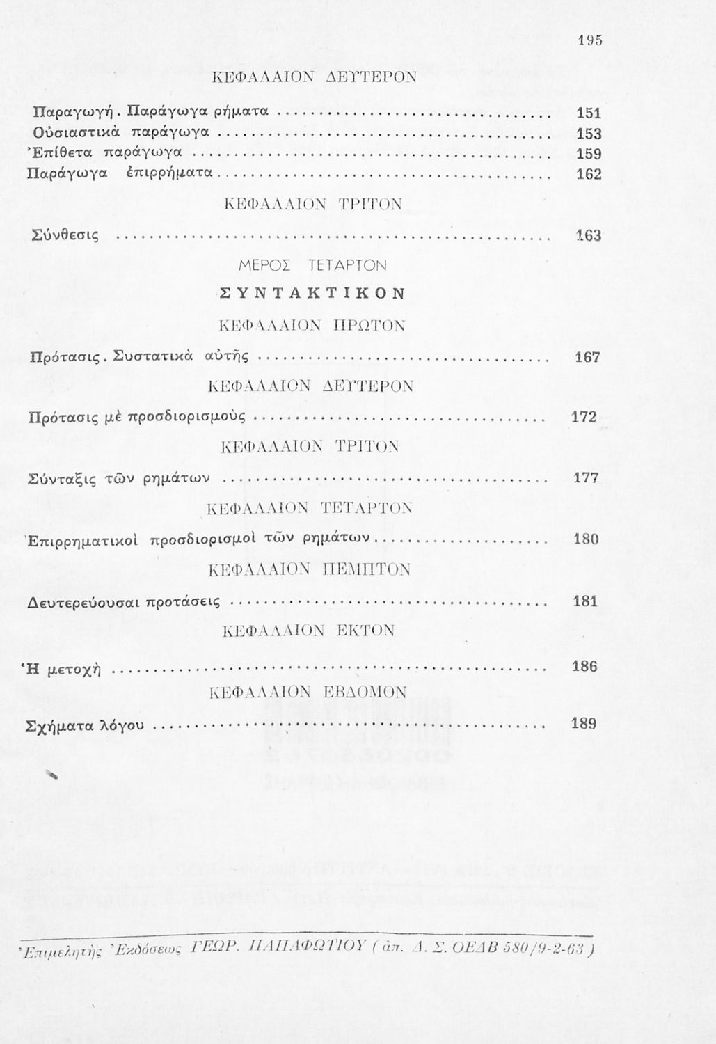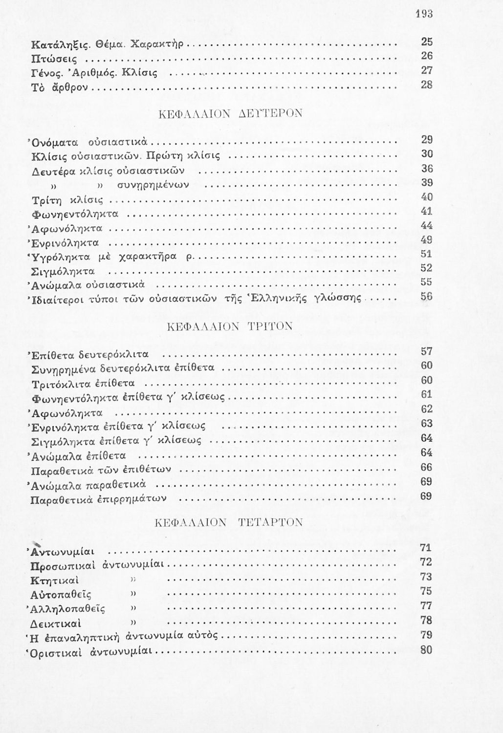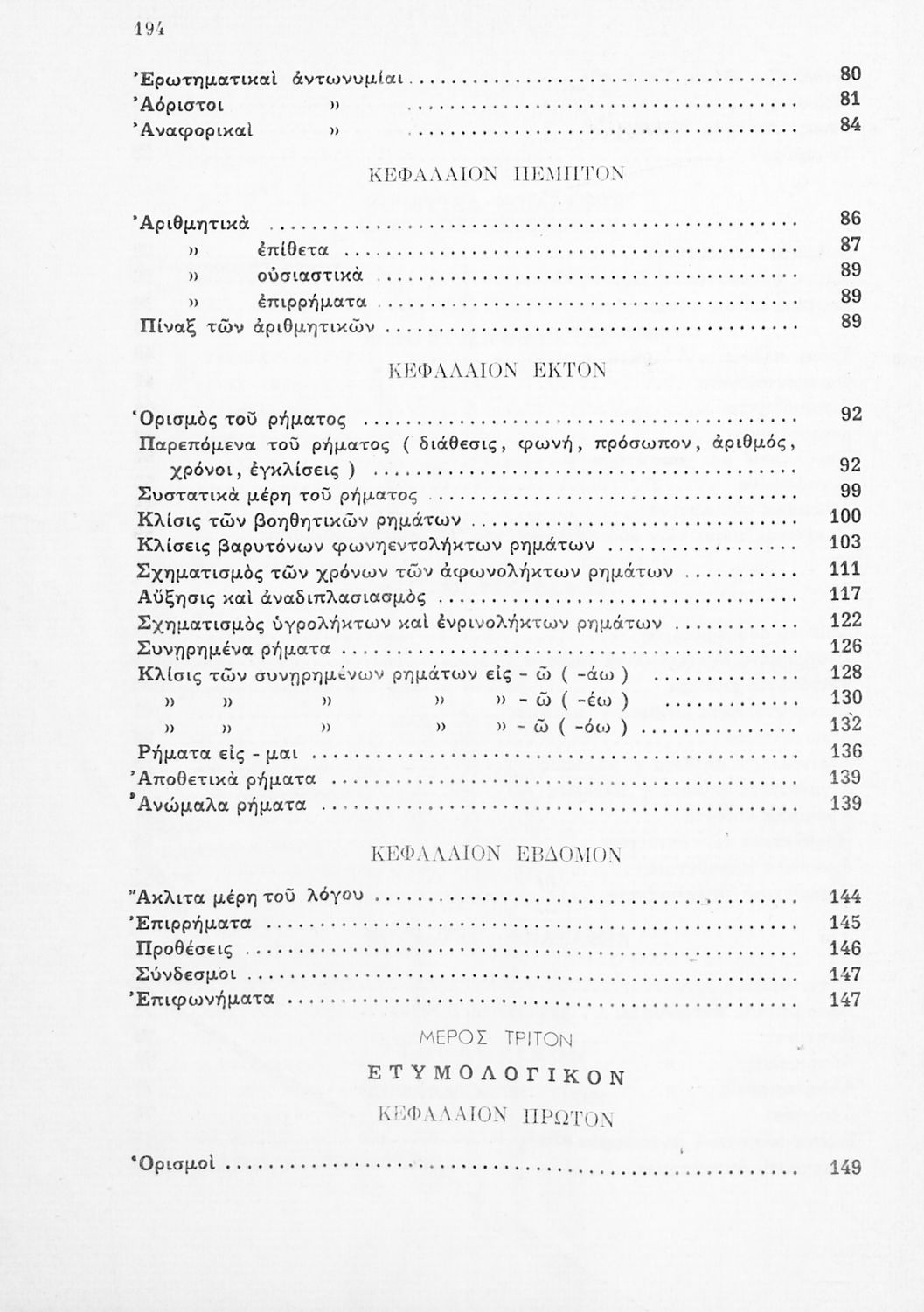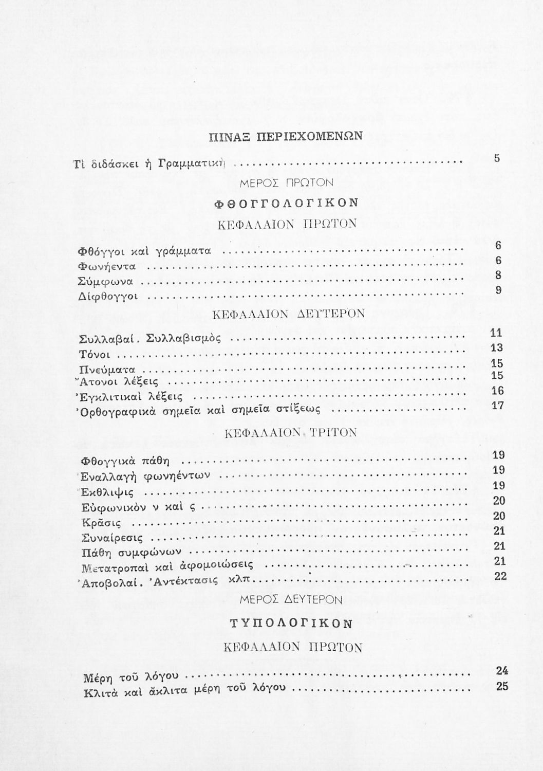 Σχολικό εγχειρίδιο Γλώσσας Δημοτικού που περιλαμβάνει γραμματική και συντακτικό και είναι χωρισμένο σε φθογγολογικό, τυπολογικό και ετυμολογικό μέρος. Φέρει το σύμβολο της δικτατορίας.
