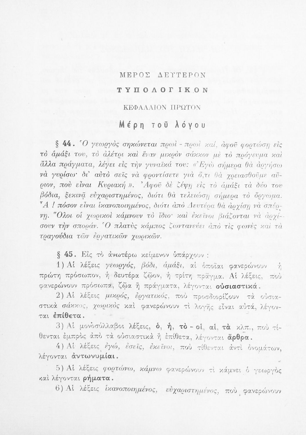 Σχολικό εγχειρίδιο Γλώσσας Δημοτικού που περιλαμβάνει γραμματική και συντακτικό και είναι χωρισμένο σε φθογγολογικό, τυπολογικό και ετυμολογικό μέρος. Φέρει το σύμβολο της δικτατορίας.