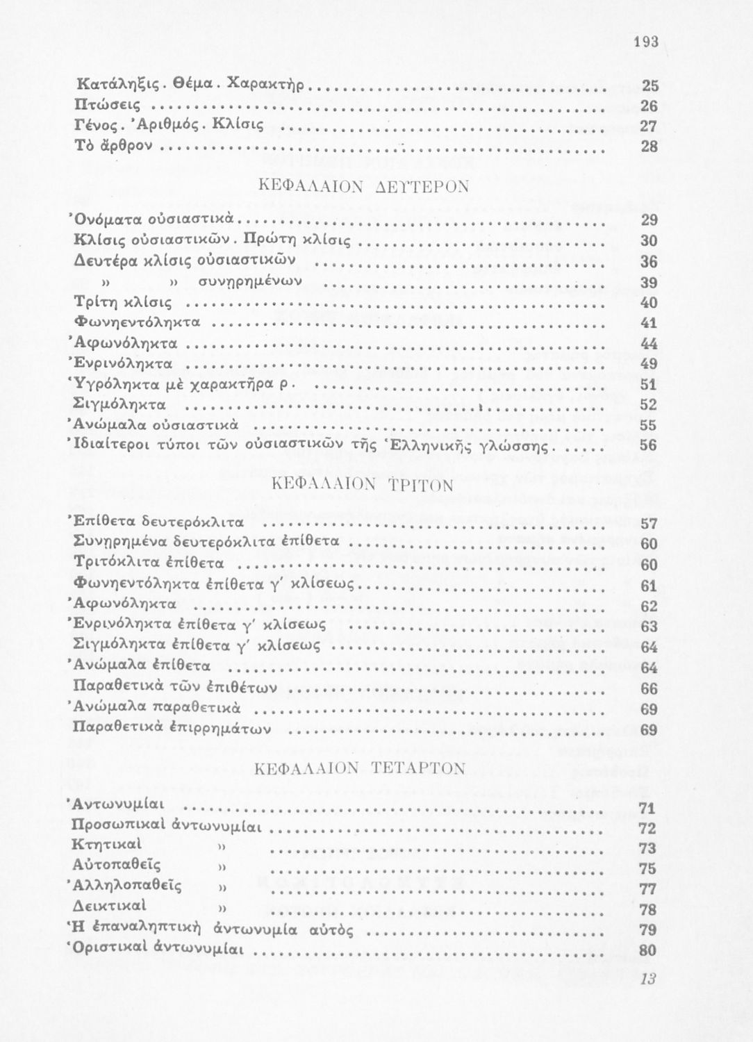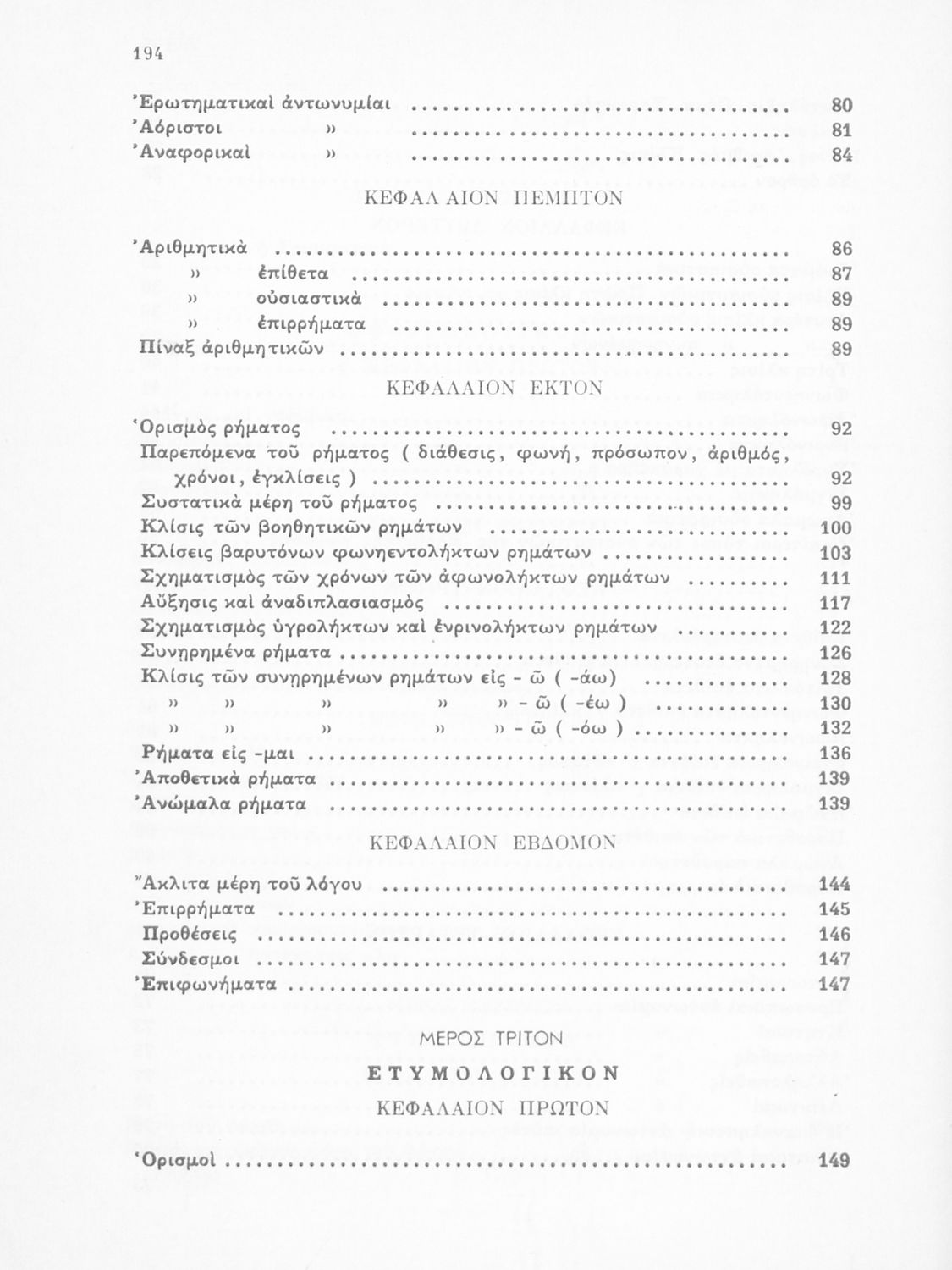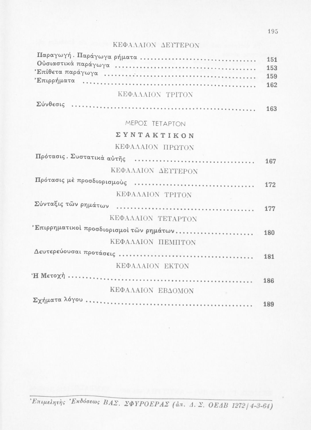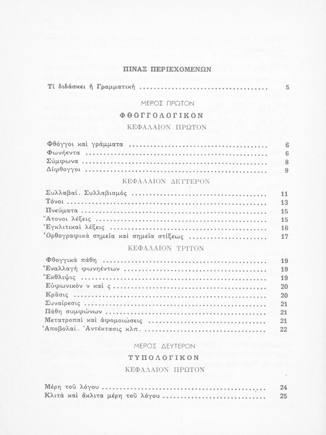 Σχολικό εγχειρίδιο Γλώσσας Δημοτικού που περιλαμβάνει γραμματική και συντακτικό και είναι χωρισμένο σε φθογγολογικό, τυπολογικό και ετυμολογικό μέρος. Φέρει το σύμβολο της δικτατορίας.