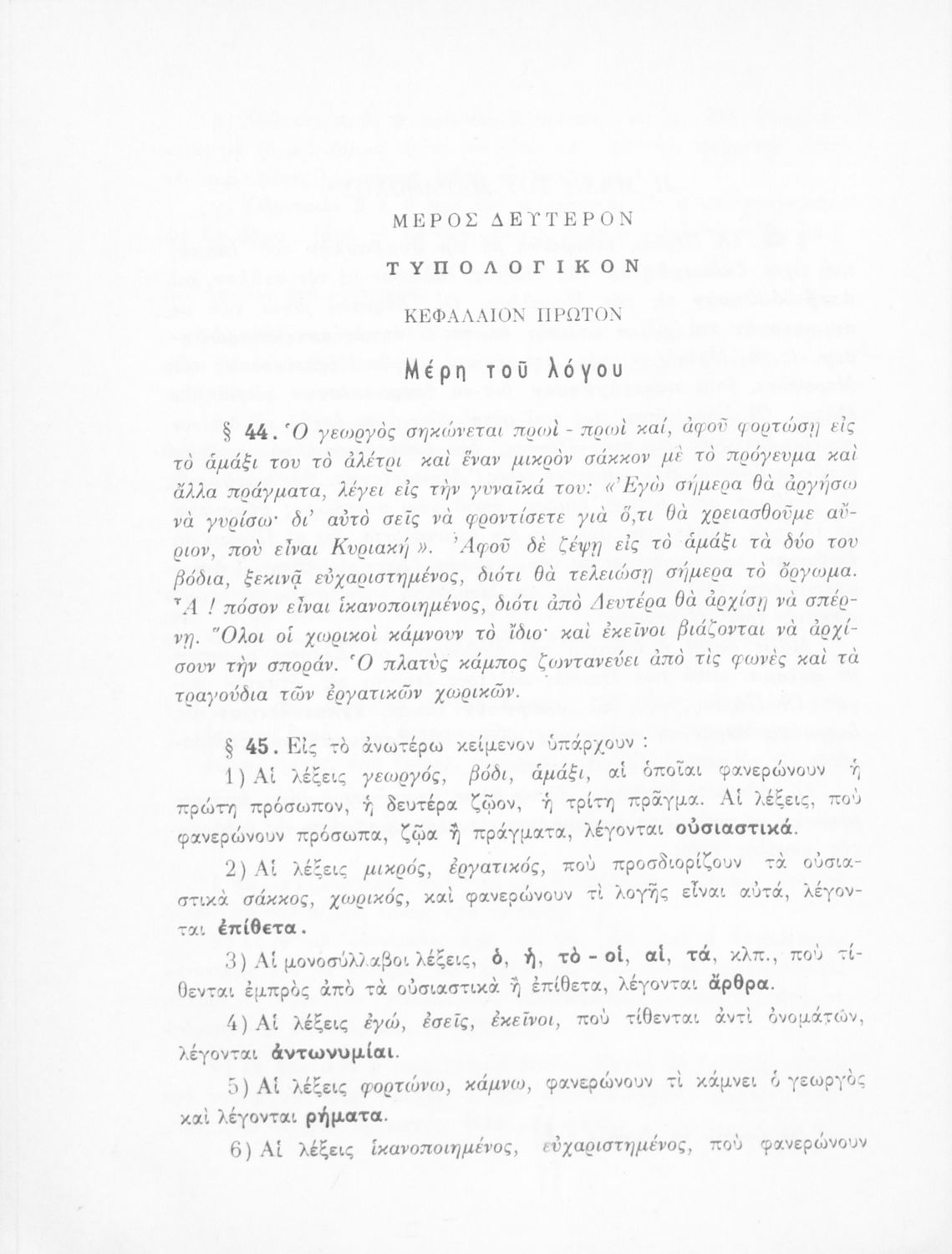 Σχολικό εγχειρίδιο Γλώσσας Δημοτικού που περιλαμβάνει γραμματική και συντακτικό και είναι χωρισμένο σε φθογγολογικό, τυπολογικό και ετυμολογικό μέρος. Φέρει το σύμβολο της δικτατορίας.
