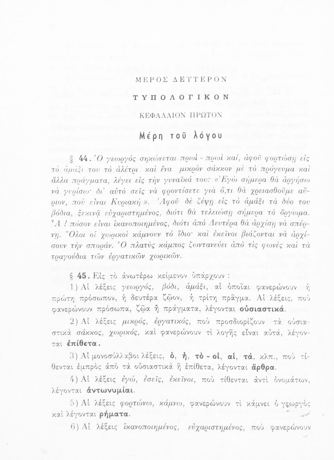 Σχολικό εγχειρίδιο Γλώσσας Δημοτικού που περιλαμβάνει γραμματική και συντακτικό και είναι χωρισμένο σε φθογγολογικό, τυπολογικό και ετυμολογικό μέρος. Φέρει το σύμβολο της δικτατορίας.