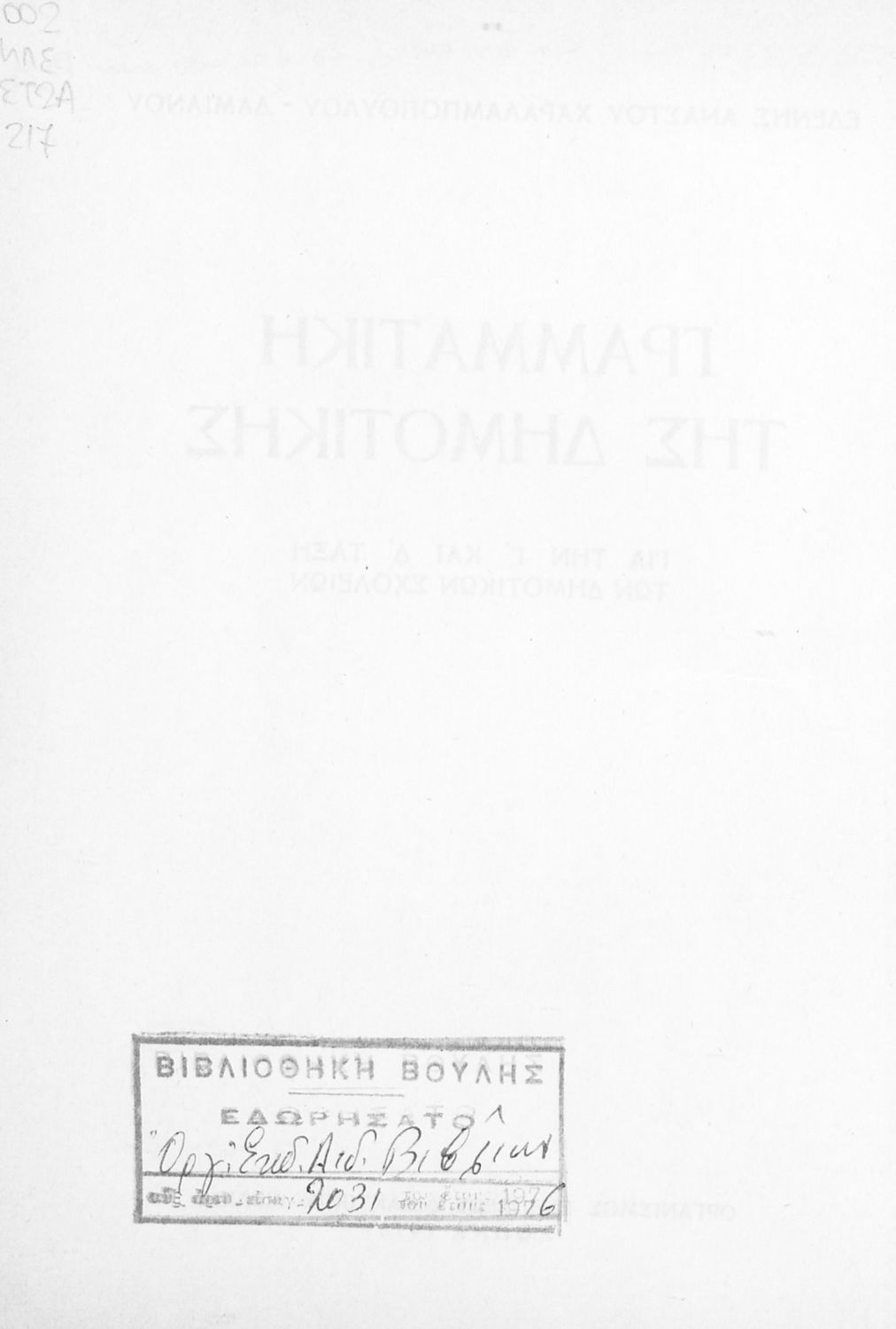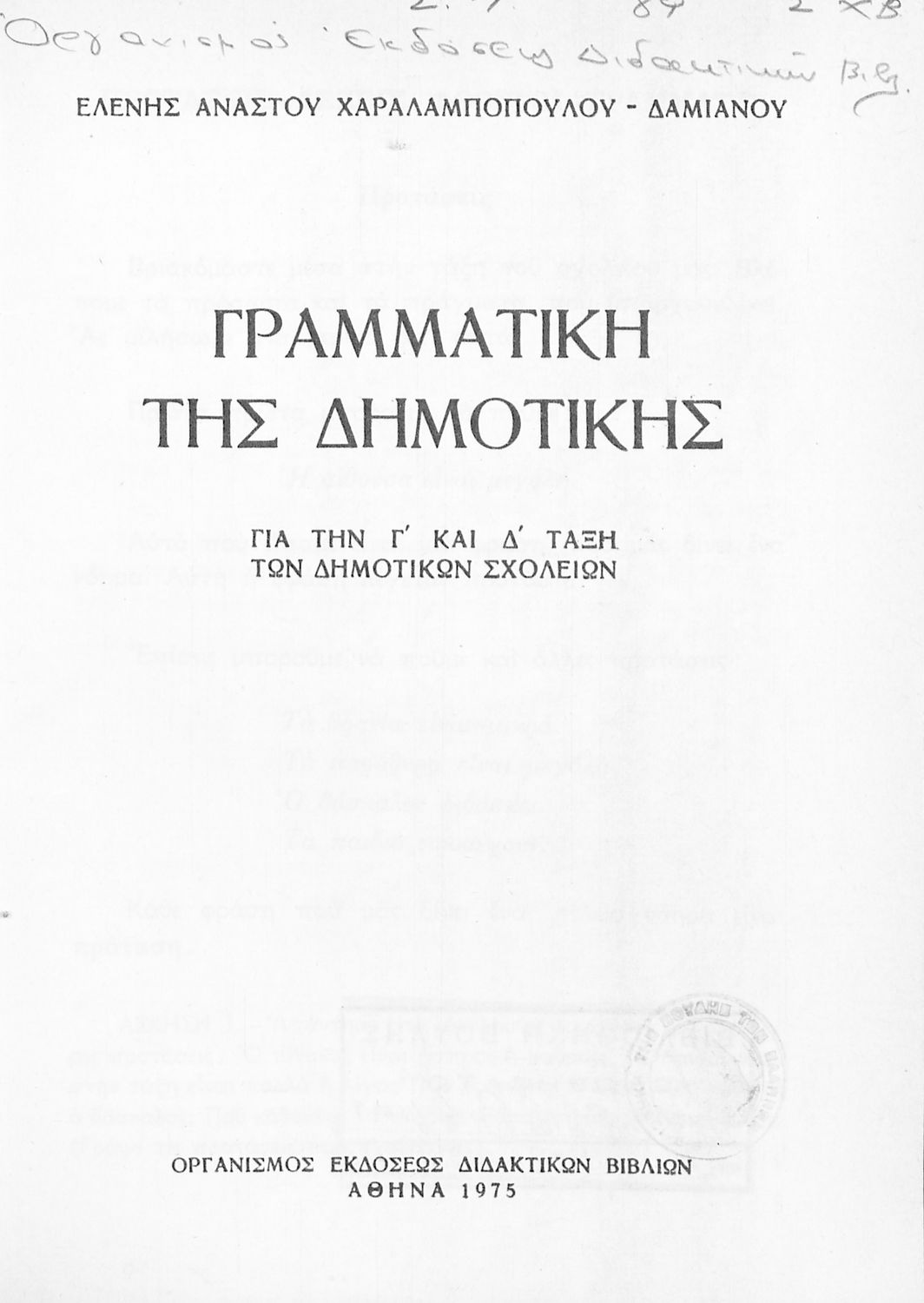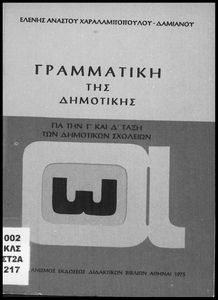 Βαθμίδα εκπαίδευσης: Πρωτοβάθμια Τάξη: Γ' Δημοτικού / Δ' Δημοτικού Μάθημα: Νέα Ελληνικά Γλώσσα: Δημοτική Παρουσίαση περιεχομένου: Σχολικό εγχειρίδιο Γ΄ και Δ΄ Δημοτικού που περιλαμβάνει τους κανόνες γραμματικής και τη δομή της νέας ελληνικής και είναι χωρισμένο στο φωνητικό, τυπικό και παραγωγικό μέρος. |