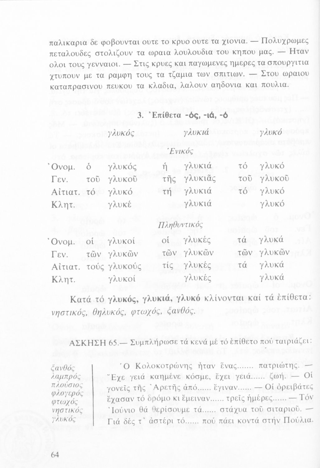 Σχολικό εγχειρίδιο Γ΄ και Δ΄ Δημοτικού που περιλαμβάνει τους κανόνες γραμματικής και τη δομή της νέας ελληνικής και είναι χωρισμένο στο φωνητικό, τυπικό και παραγωγικό μέρος.