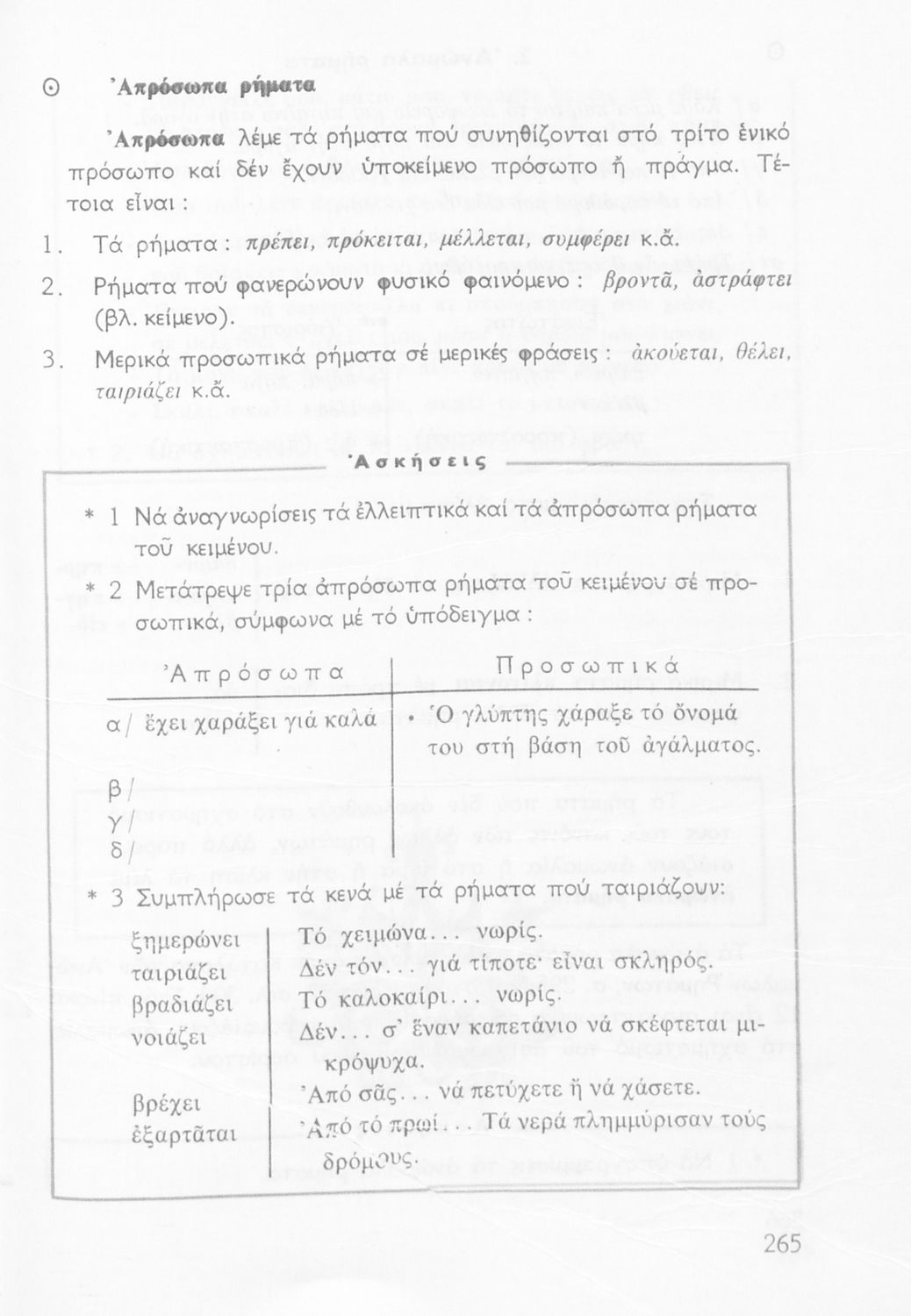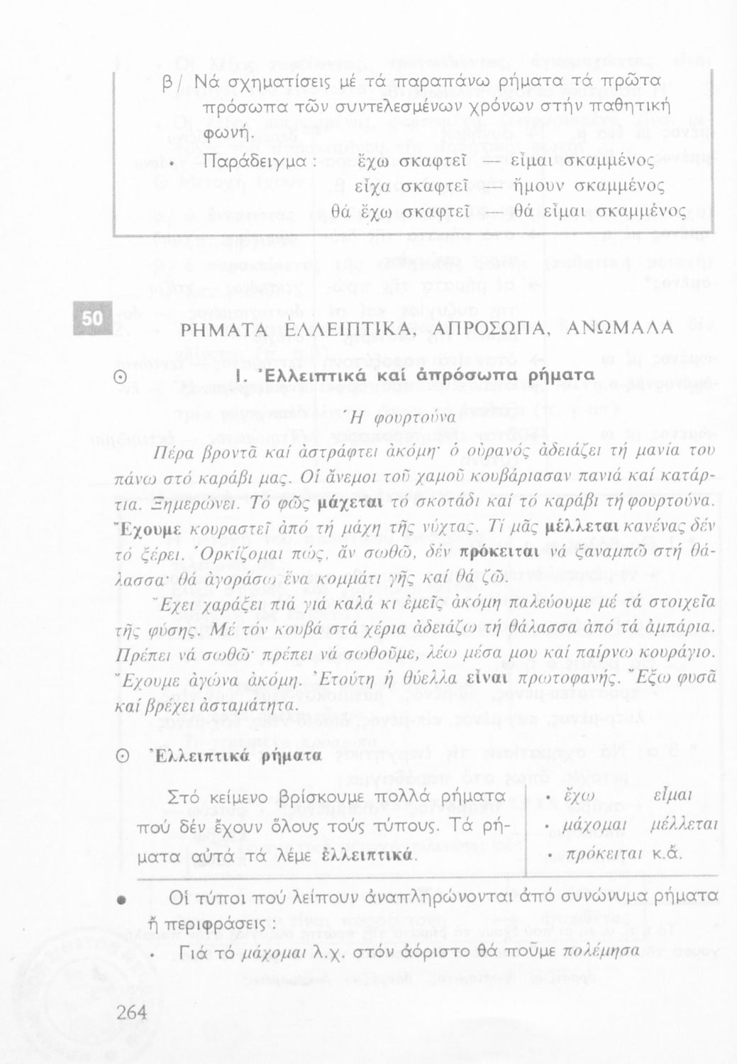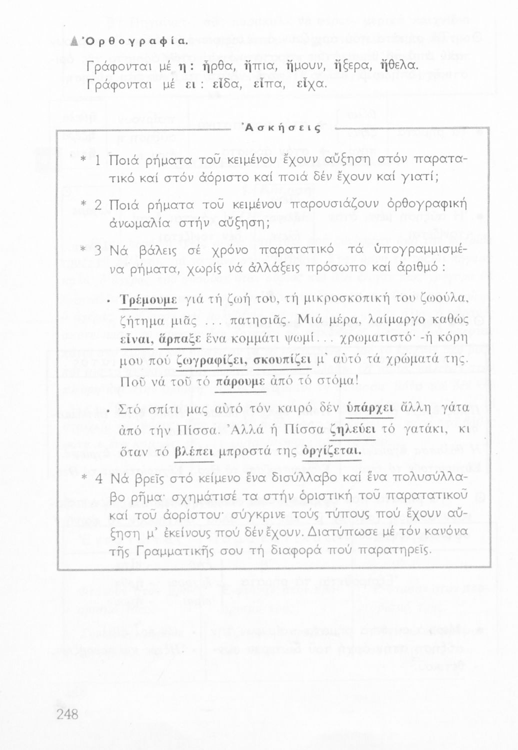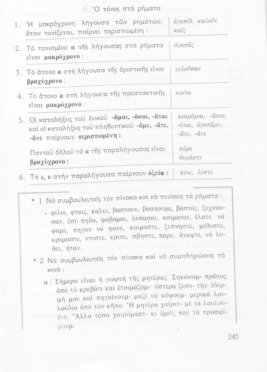 Βαθμίδα εκπαίδευσης: Πρωτοβάθμια Τάξη: Ε' Δημοτικού / ΣΤ' Δημοτικού Μάθημα: Νέα Ελληνικά Γλώσσα: Δημοτική Παρουσίαση περιεχομένου: Το σύγγραμμα ήταν σχολικό εγχειρίδιο για το μάθημα της Ελληνικής Γλώσσας. Πρόκειται για τη σύνοψη της νεοελληνικής γραμματική για τους μαθητές του Δημοτικού. Περιλαμβάνει τη θεωρία των γραμματικών φαινόμενων, καθώς διαθέτει πίνακες και παραδείγματα. Το τελευταίο περιέχει μέρος επίμετρο με ανώμαλα ρήματα, λέξεις και πίνακες. |