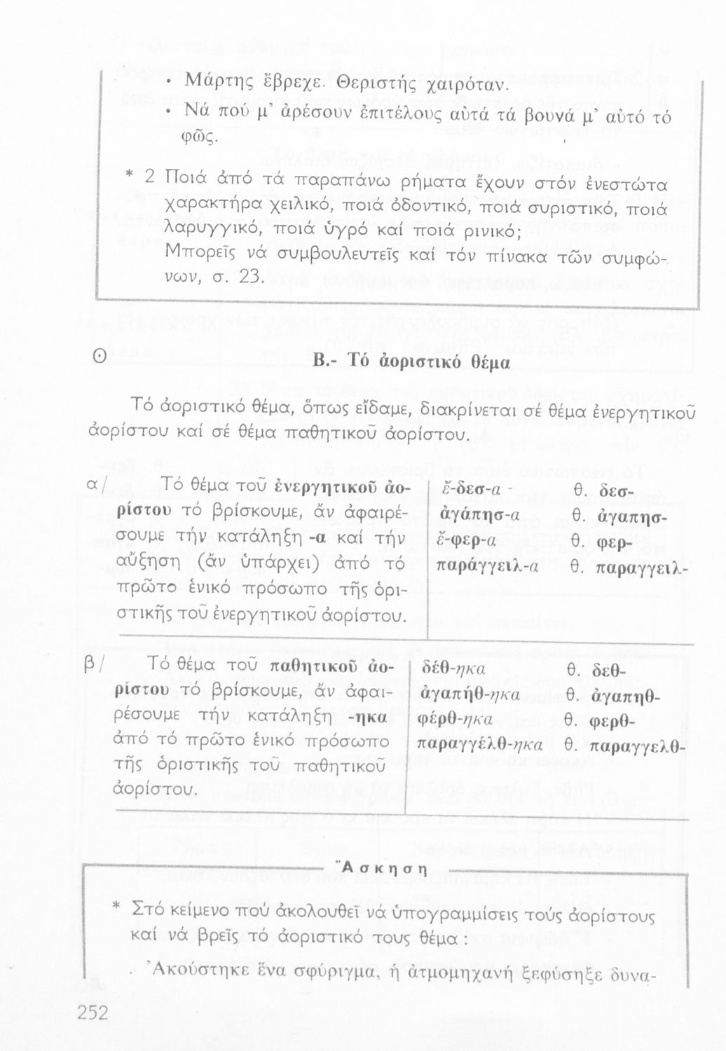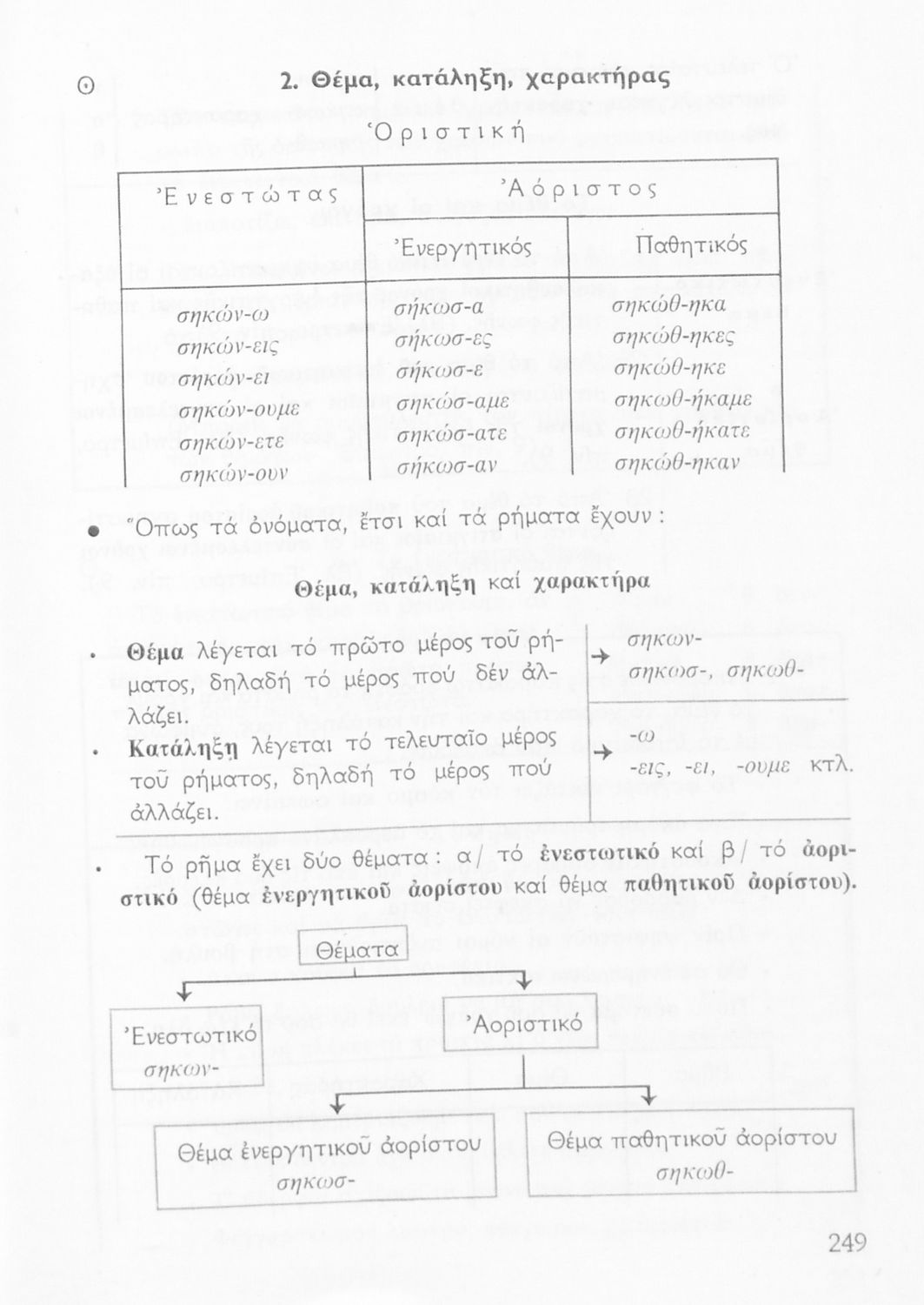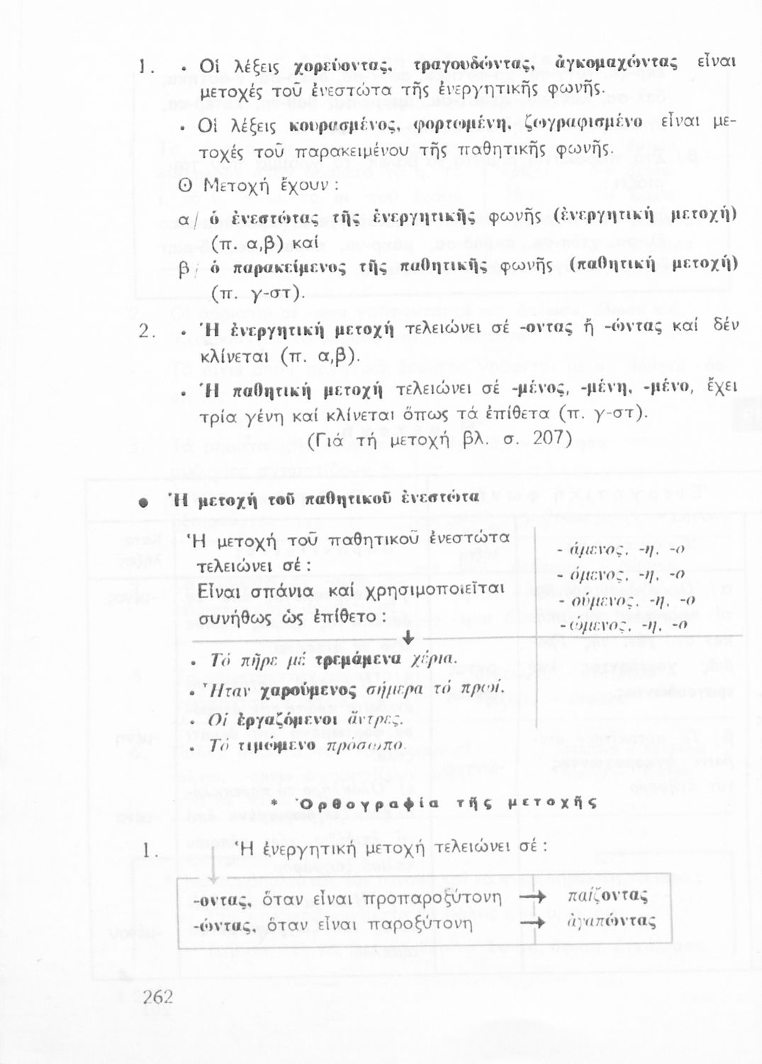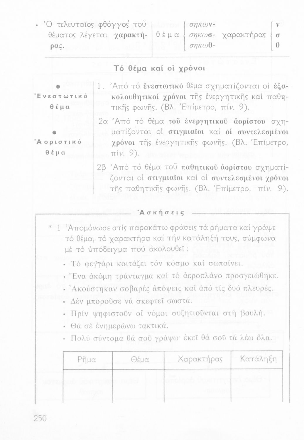 Βαθμίδα εκπαίδευσης: Πρωτοβάθμια Τάξη: Ε' Δημοτικού / ΣΤ' Δημοτικού Μάθημα: Νέα Ελληνικά Γλώσσα: Δημοτική Παρουσίαση περιεχομένου: Το σύγγραμμα ήταν σχολικό εγχειρίδιο για το μάθημα της Ελληνικής Γλώσσας. Πρόκειται για τη σύνοψη της νεοελληνικής γραμματική για τους μαθητές του Δημοτικού. Περιλαμβάνει τη θεωρία των γραμματικών φαινόμενων, καθώς διαθέτει πίνακες και παραδείγματα. Το τελευταίο περιέχει μέρος επίμετρο με ανώμαλα ρήματα, λέξεις και πίνακες. |