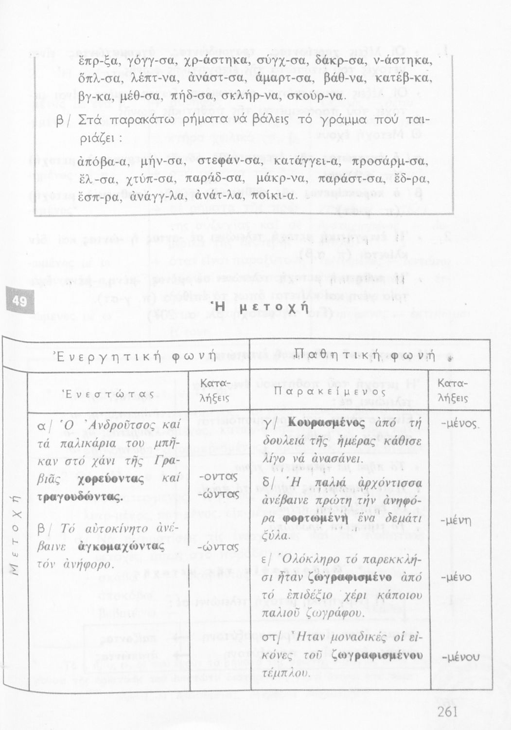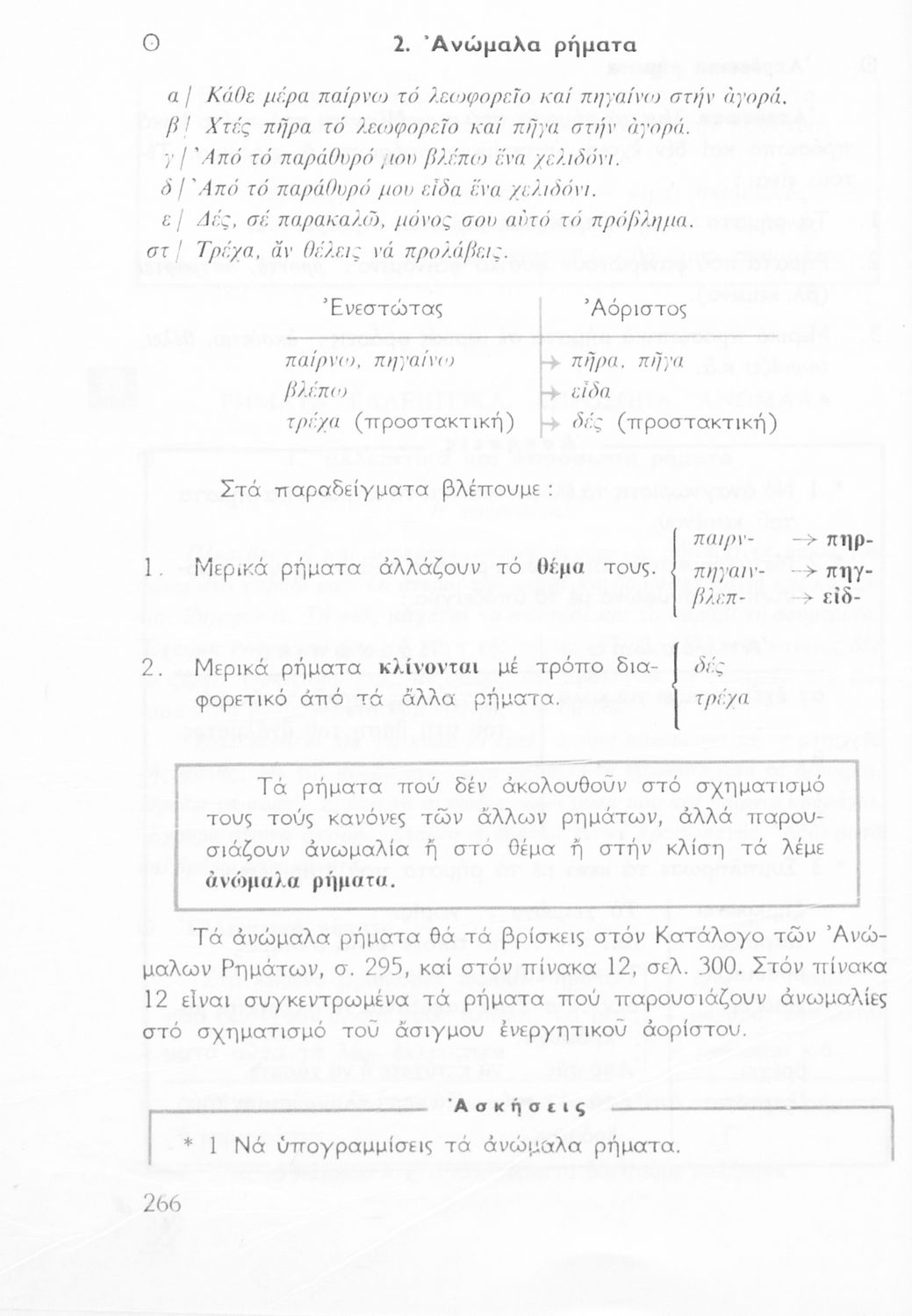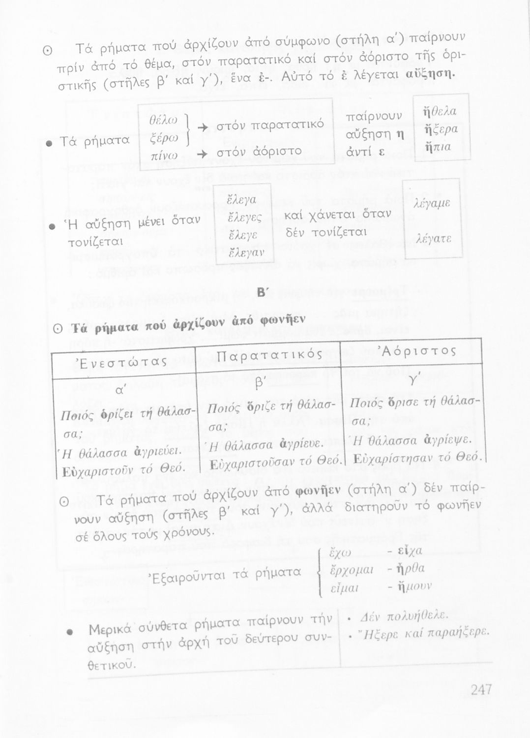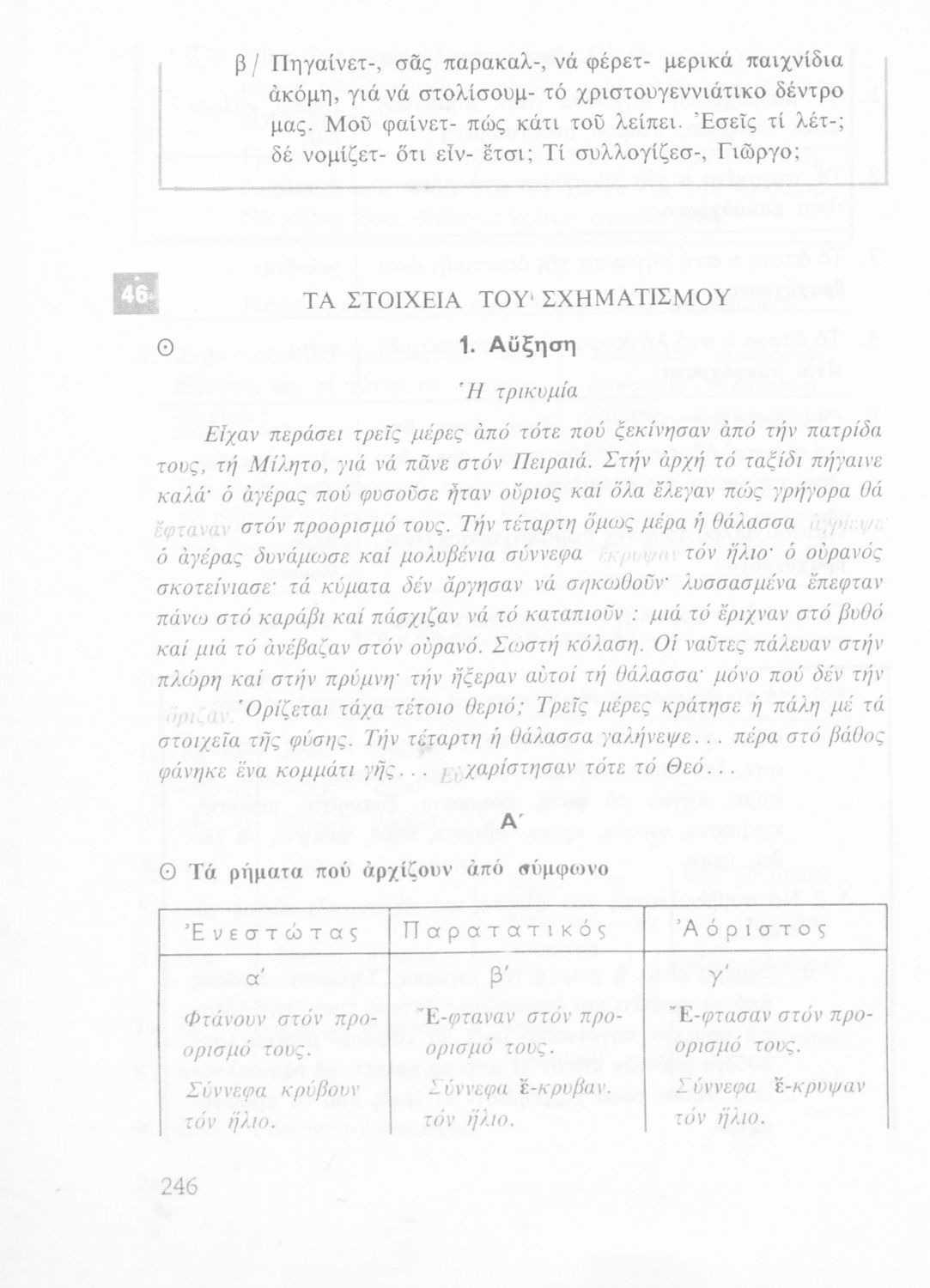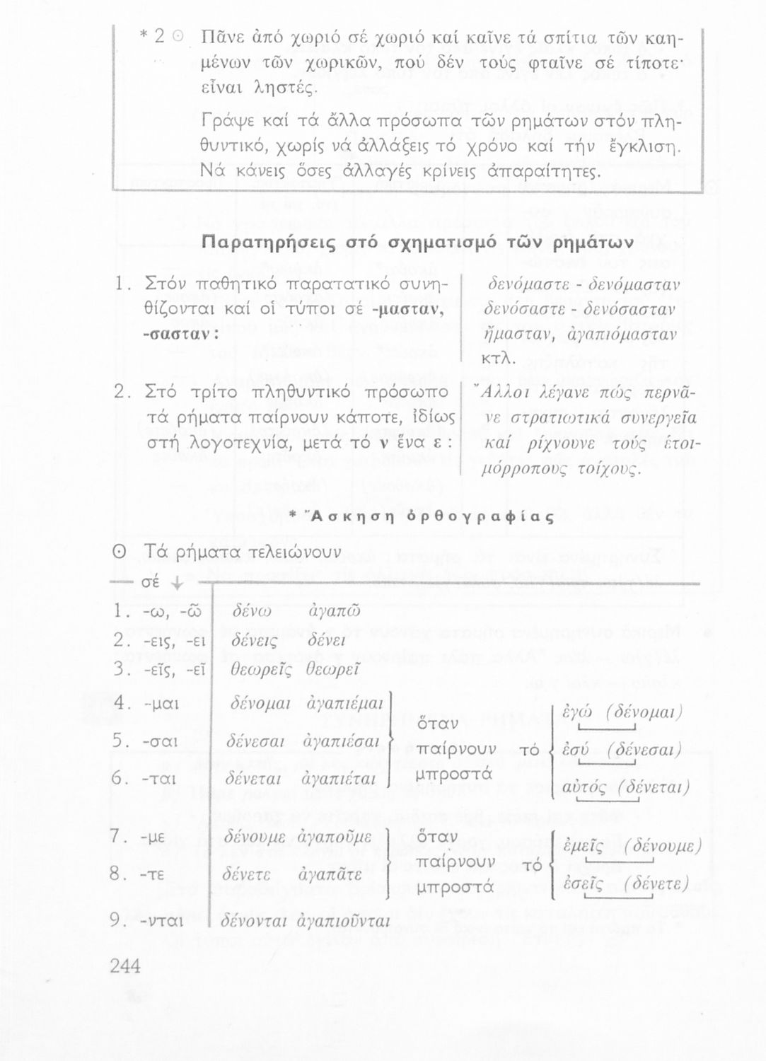 Βαθμίδα εκπαίδευσης: Πρωτοβάθμια Τάξη: Ε' Δημοτικού / ΣΤ' Δημοτικού Μάθημα: Νέα Ελληνικά Γλώσσα: Δημοτική Παρουσίαση περιεχομένου: Το σύγγραμμα ήταν σχολικό εγχειρίδιο για το μάθημα της Ελληνικής Γλώσσας. Πρόκειται για τη σύνοψη της νεοελληνικής γραμματική για τους μαθητές του Δημοτικού. Περιλαμβάνει τη θεωρία των γραμματικών φαινόμενων, καθώς διαθέτει πίνακες και παραδείγματα. Το τελευταίο περιέχει μέρος επίμετρο με ανώμαλα ρήματα, λέξεις και πίνακες. |