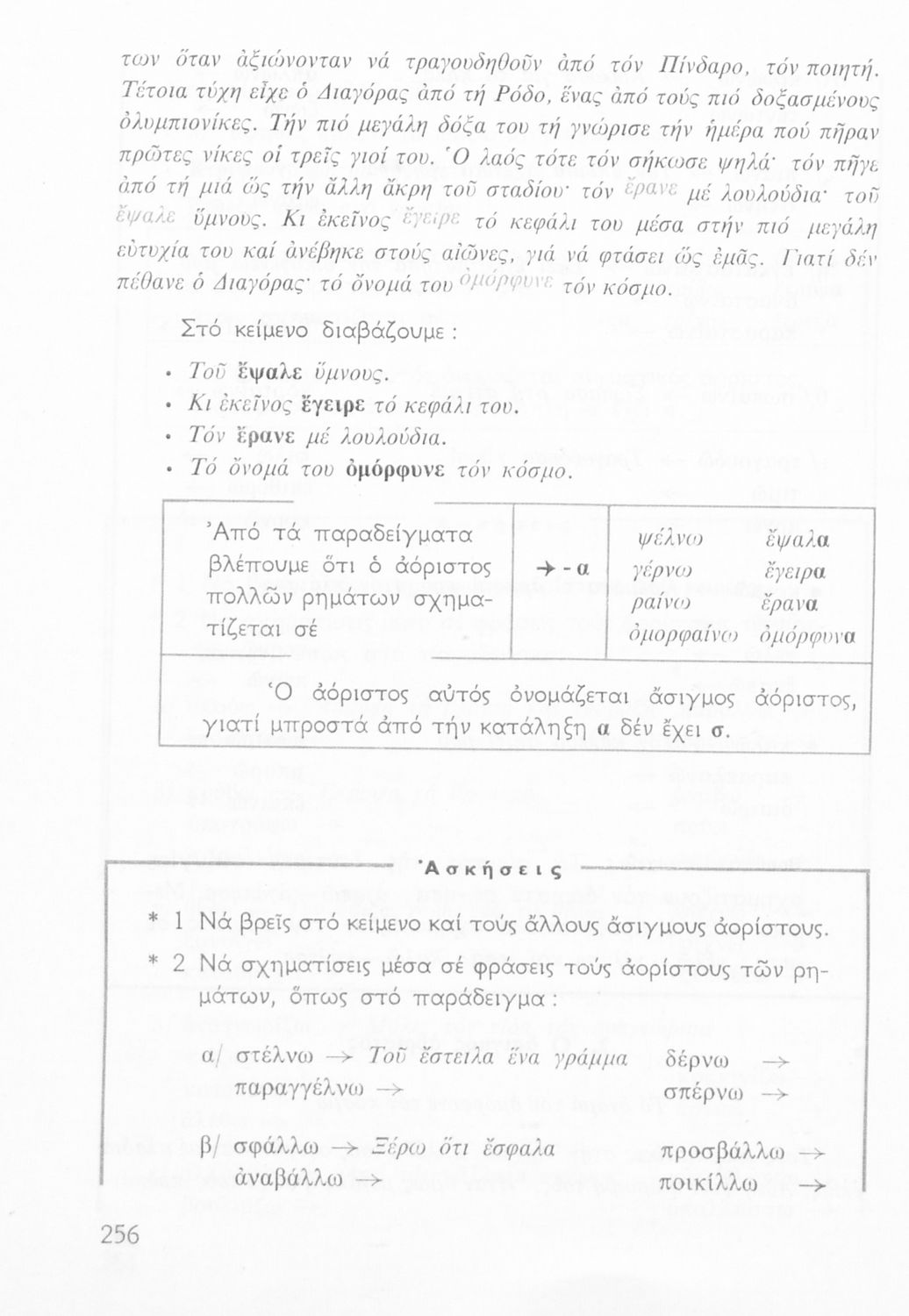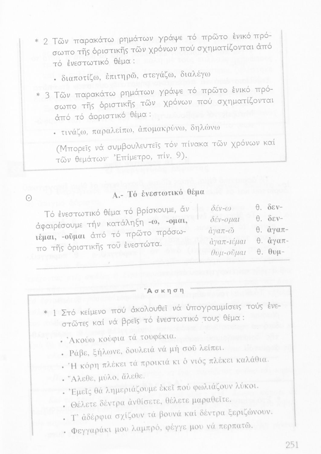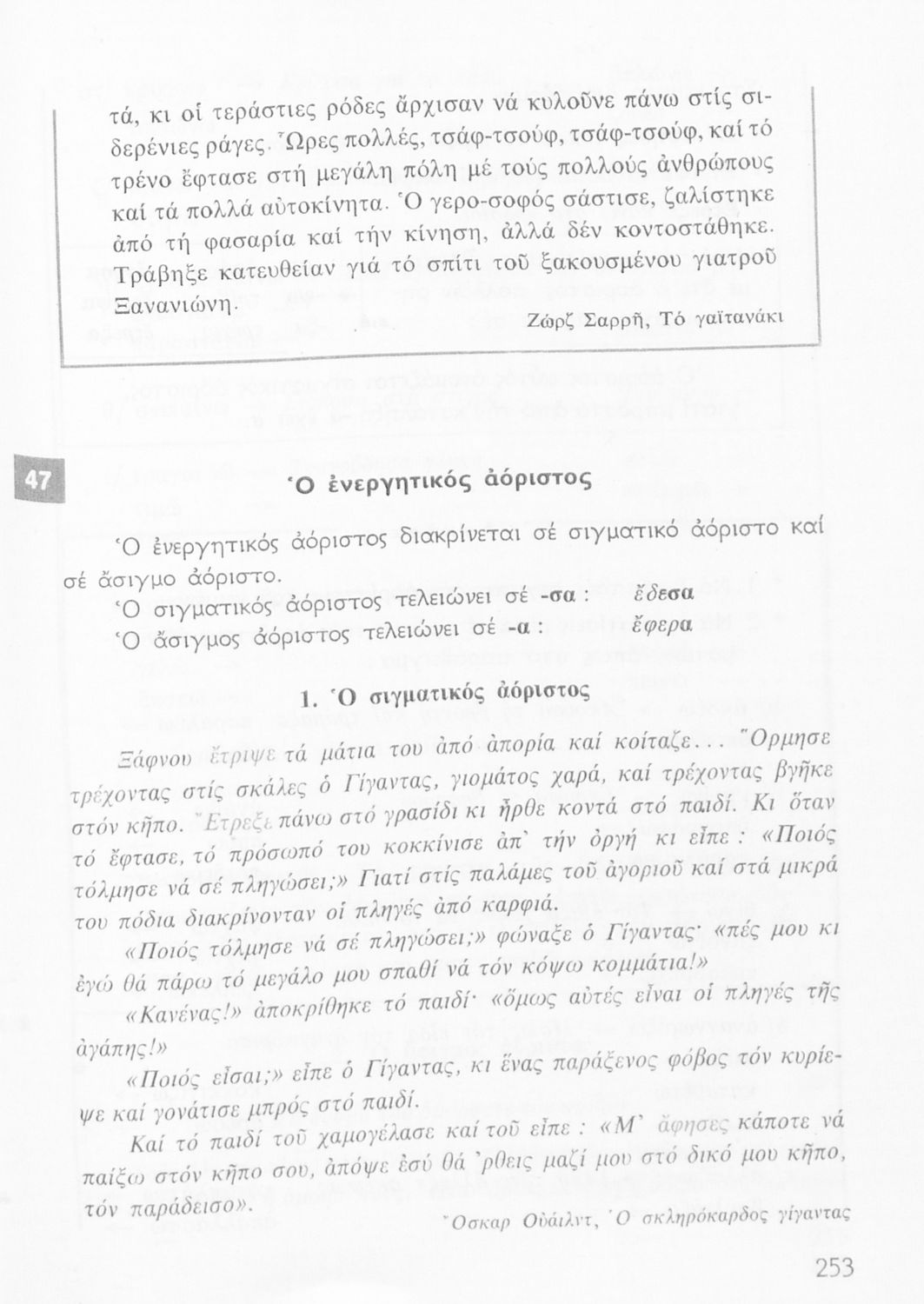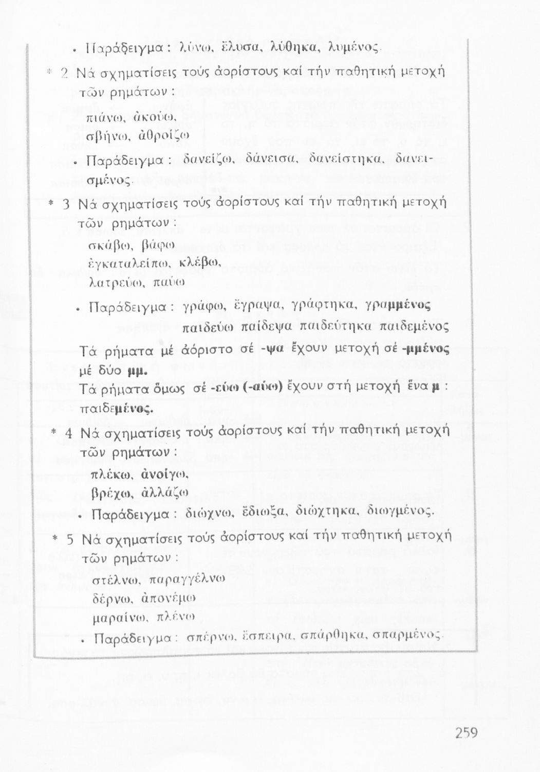 Βαθμίδα εκπαίδευσης: Πρωτοβάθμια Τάξη: Ε' Δημοτικού / ΣΤ' Δημοτικού Μάθημα: Νέα Ελληνικά Γλώσσα: Δημοτική Παρουσίαση περιεχομένου: Το σύγγραμμα ήταν σχολικό εγχειρίδιο για το μάθημα της Ελληνικής Γλώσσας. Πρόκειται για τη σύνοψη της νεοελληνικής γραμματική για τους μαθητές του Δημοτικού. Περιλαμβάνει τη θεωρία των γραμματικών φαινόμενων, καθώς διαθέτει πίνακες και παραδείγματα. Το τελευταίο περιέχει μέρος επίμετρο με ανώμαλα ρήματα, λέξεις και πίνακες. |