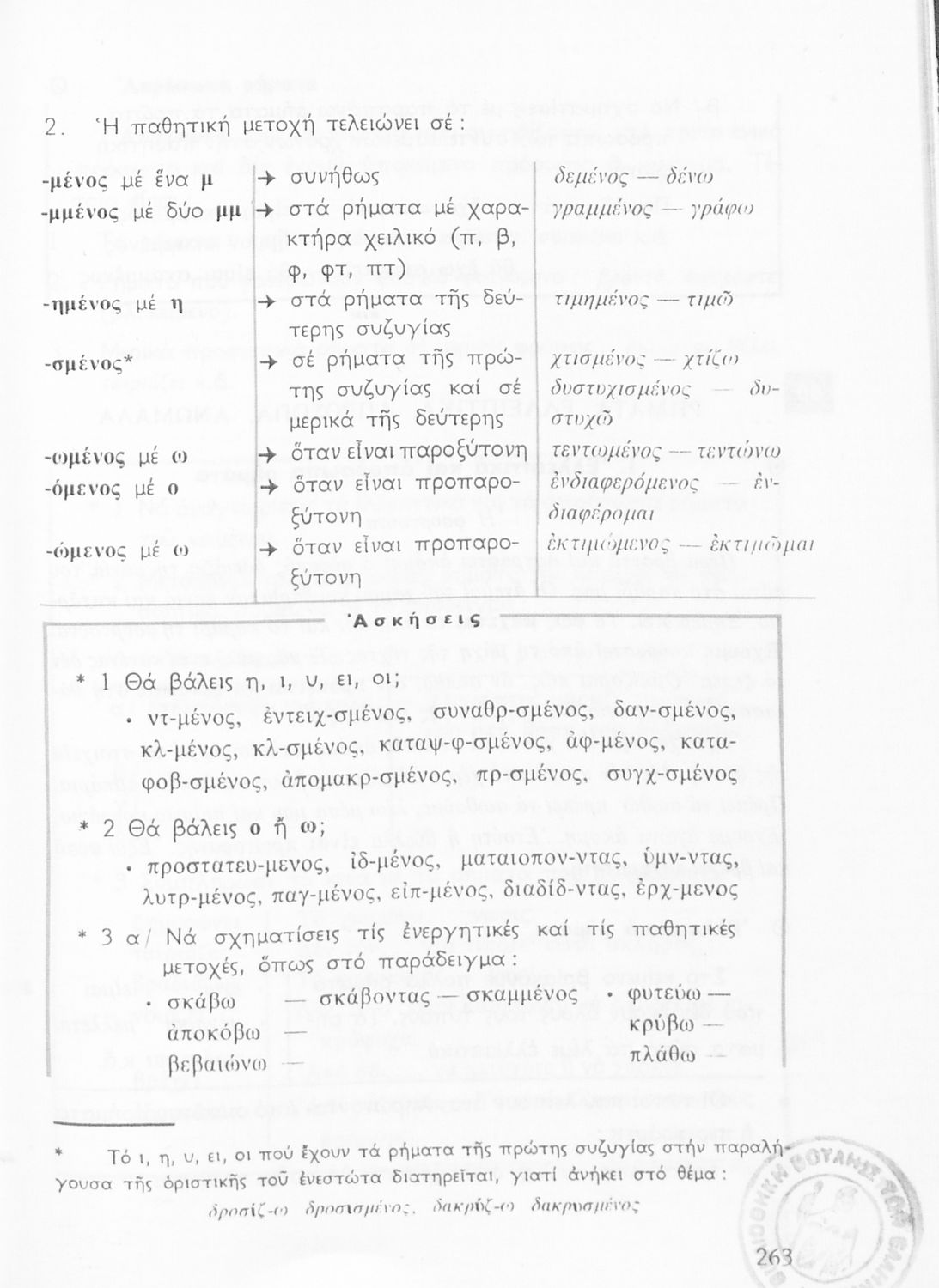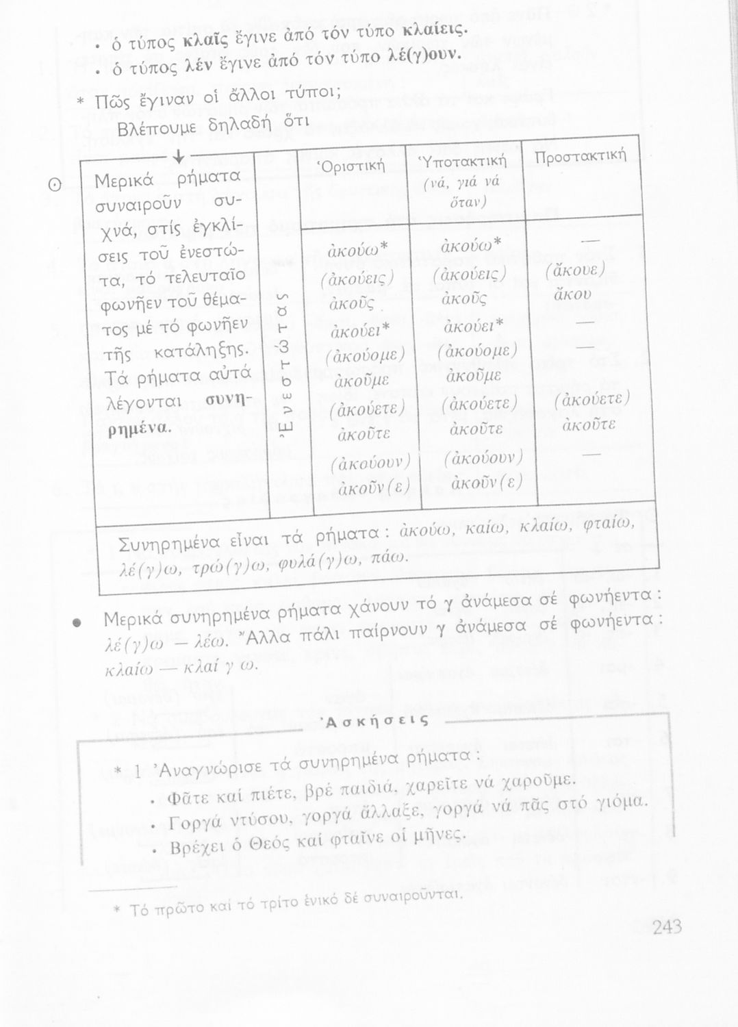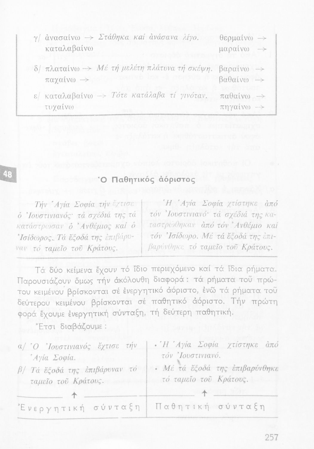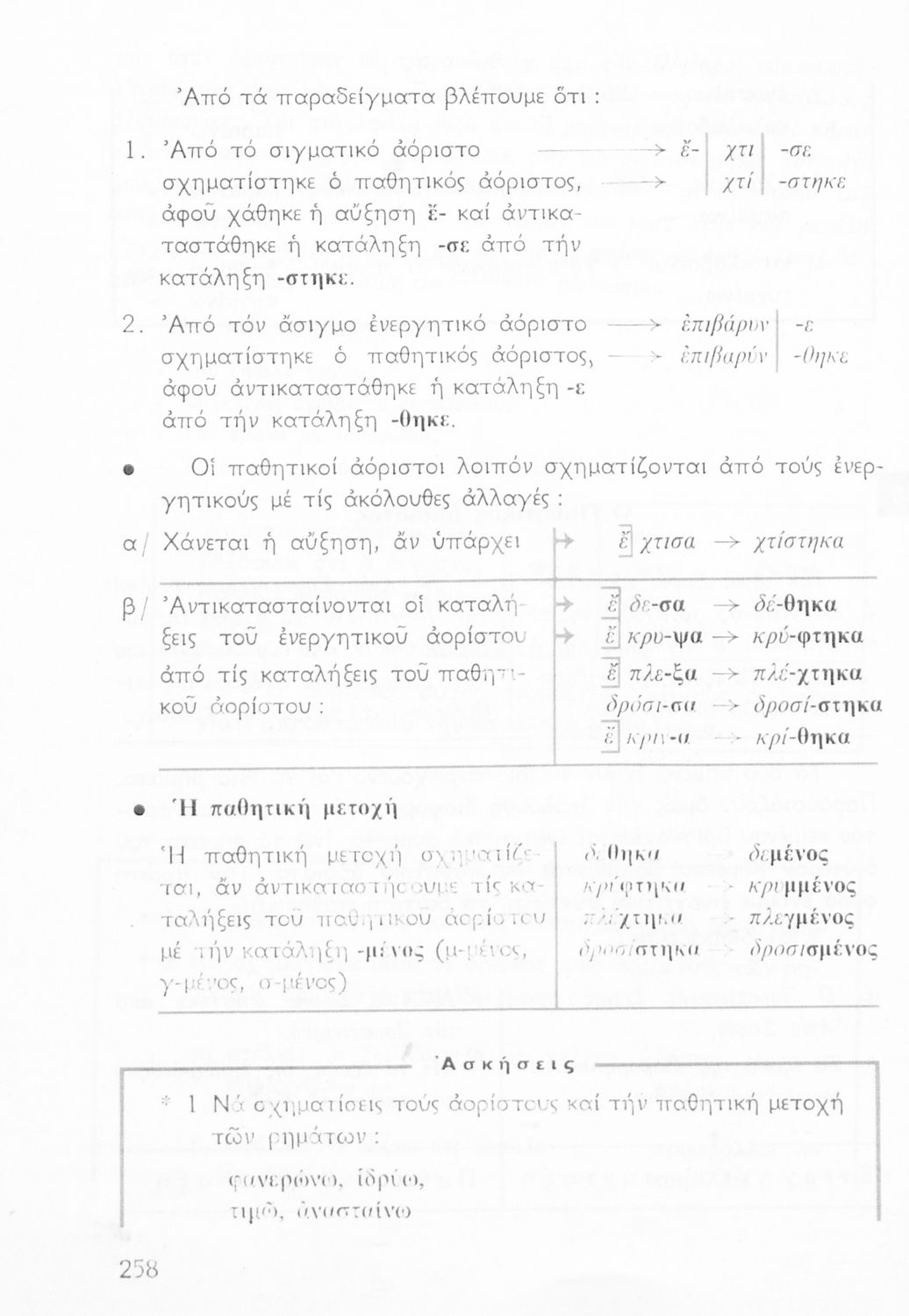 Βαθμίδα εκπαίδευσης: Πρωτοβάθμια Τάξη: Ε' Δημοτικού / ΣΤ' Δημοτικού Μάθημα: Νέα Ελληνικά Γλώσσα: Δημοτική Παρουσίαση περιεχομένου: Το σύγγραμμα ήταν σχολικό εγχειρίδιο για το μάθημα της Ελληνικής Γλώσσας. Πρόκειται για τη σύνοψη της νεοελληνικής γραμματική για τους μαθητές του Δημοτικού. Περιλαμβάνει τη θεωρία των γραμματικών φαινόμενων, καθώς διαθέτει πίνακες και παραδείγματα. Το τελευταίο περιέχει μέρος επίμετρο με ανώμαλα ρήματα, λέξεις και πίνακες. |