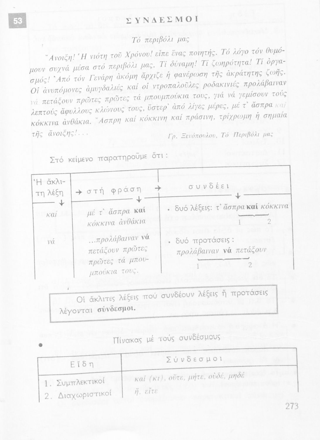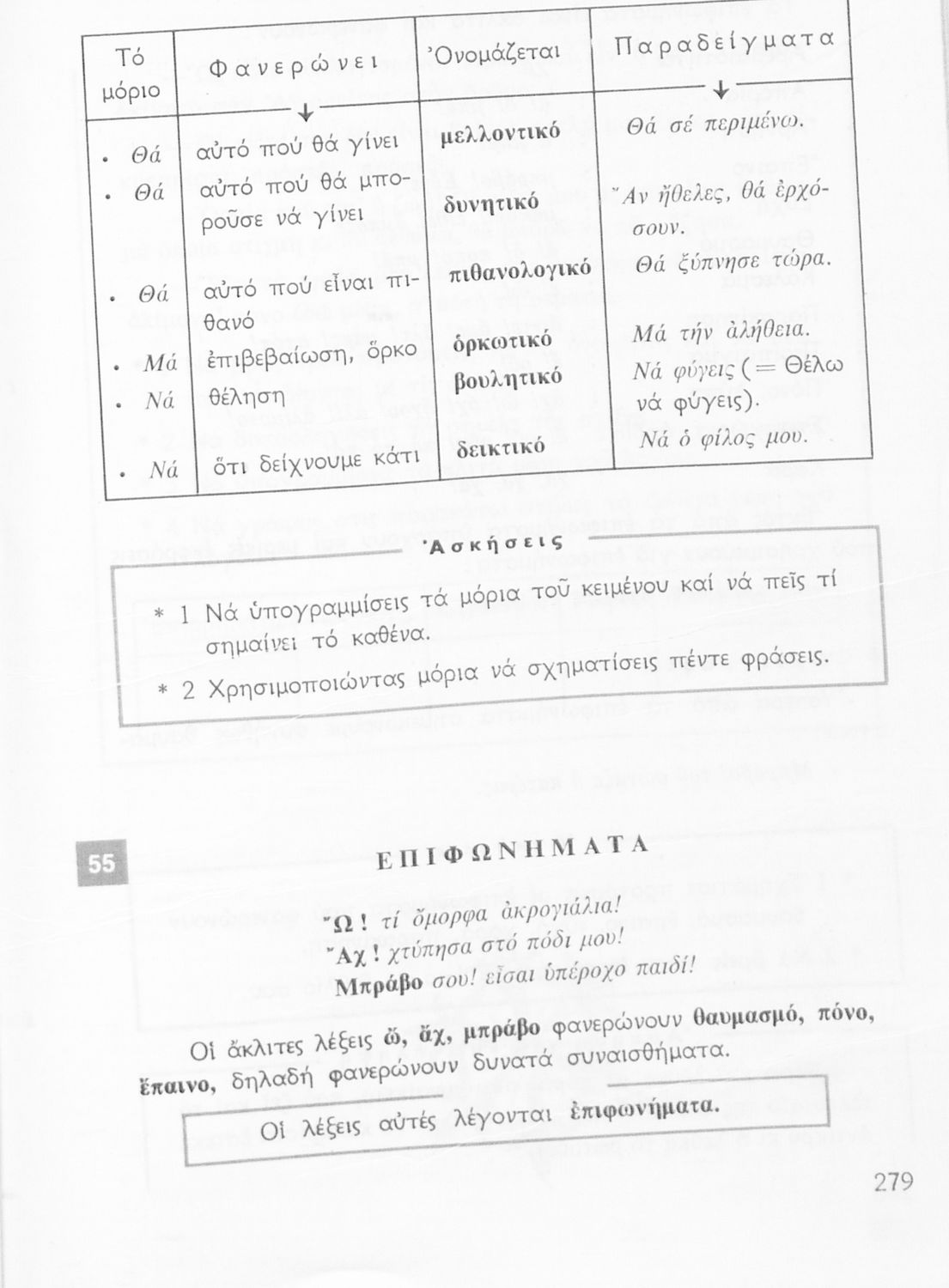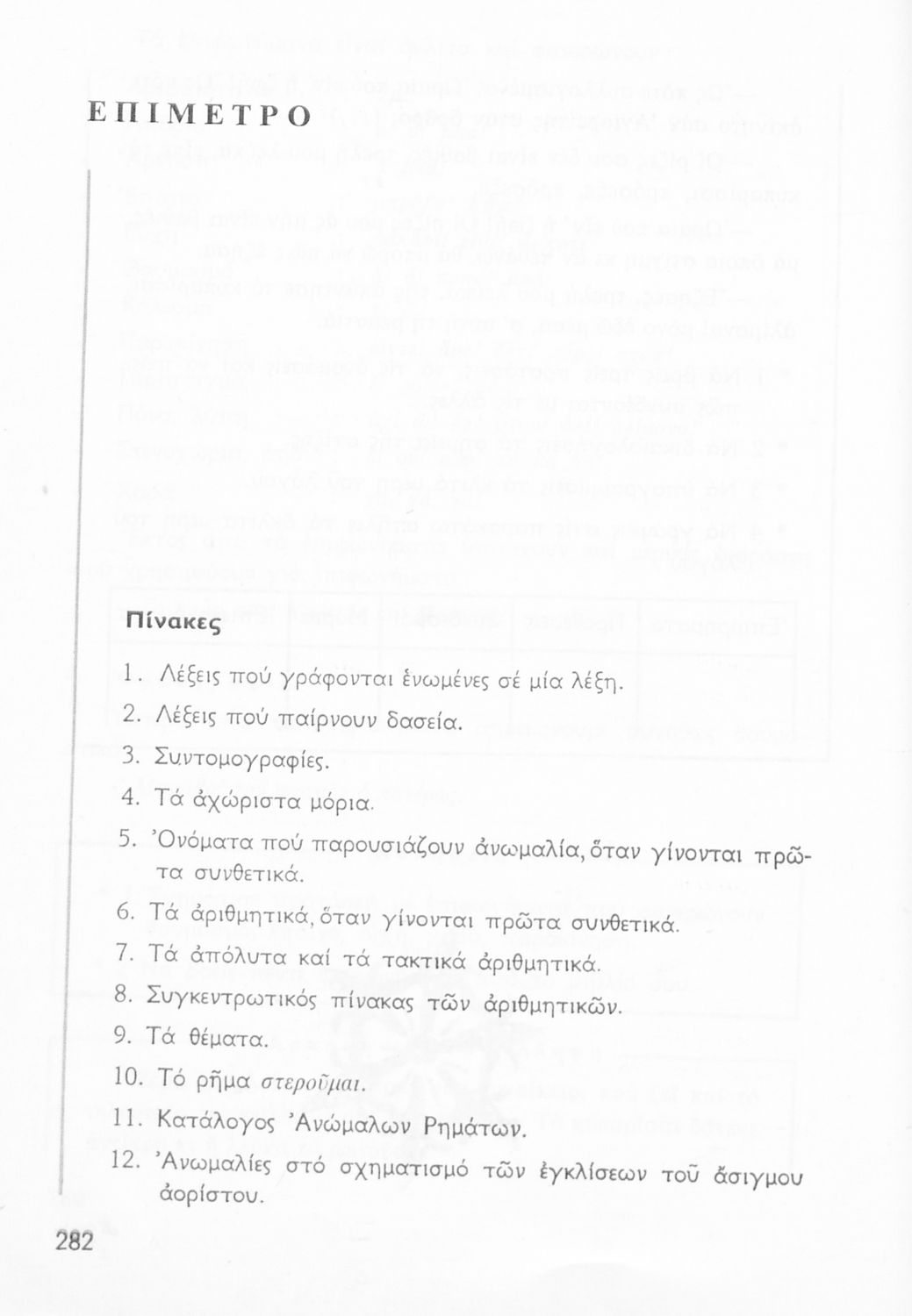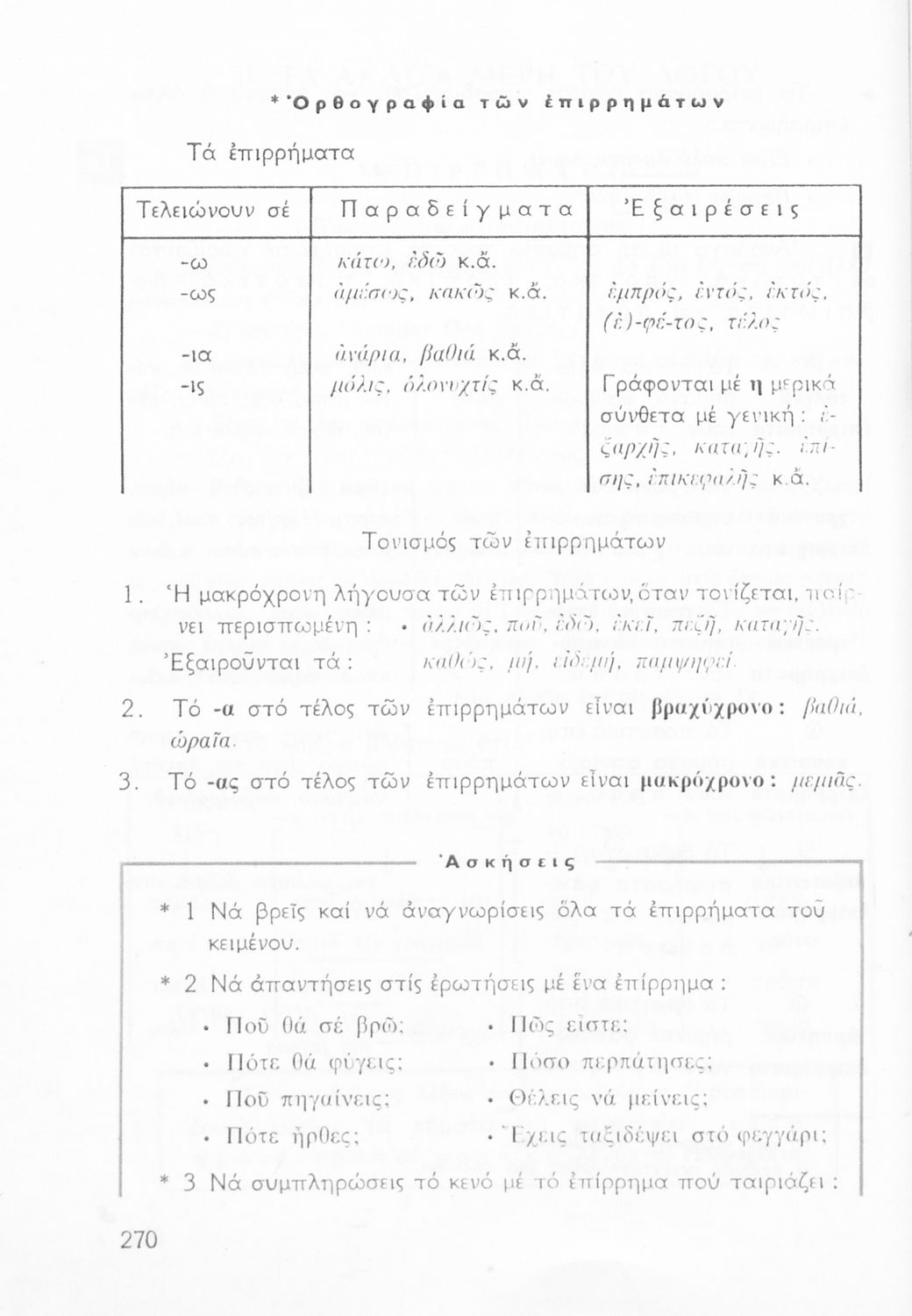 Σχολικό εγχειρίδιο της Ε΄ και ΣΤ΄ τάξης Δημοτικού για την γραμματική της ελληνικής γλώσσας με κανόνες και παραδείγματα. Στο επίμετρο υπάρχουν πίνακες με ανώμαλους σχηματισμούς ρημάτων.