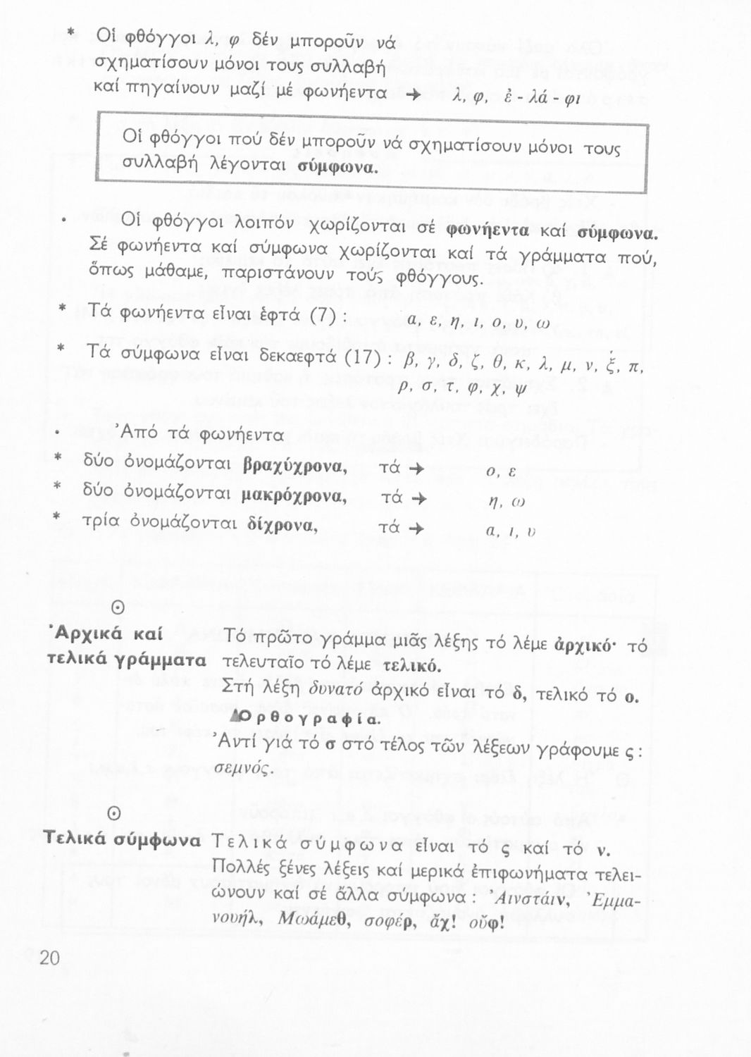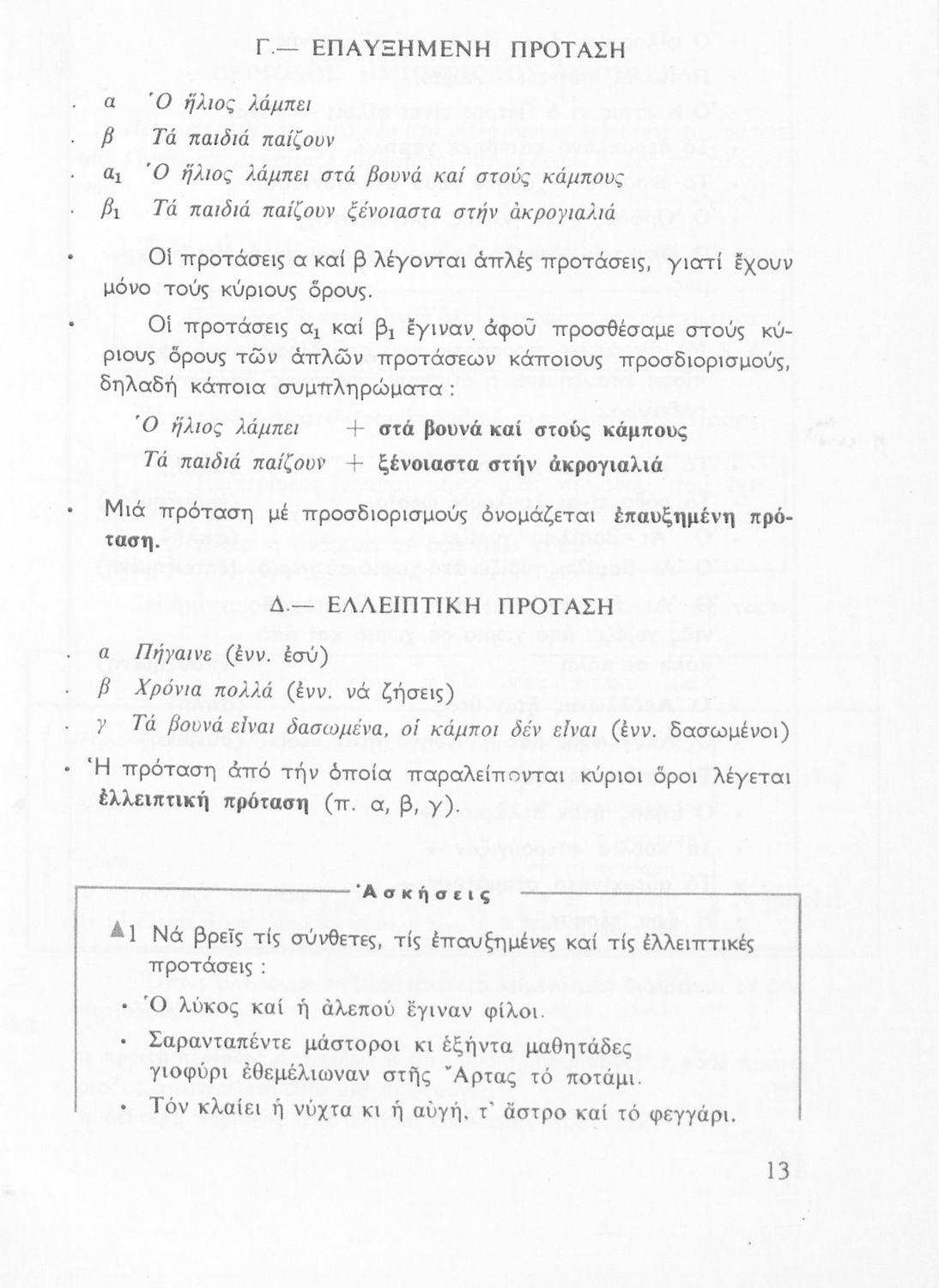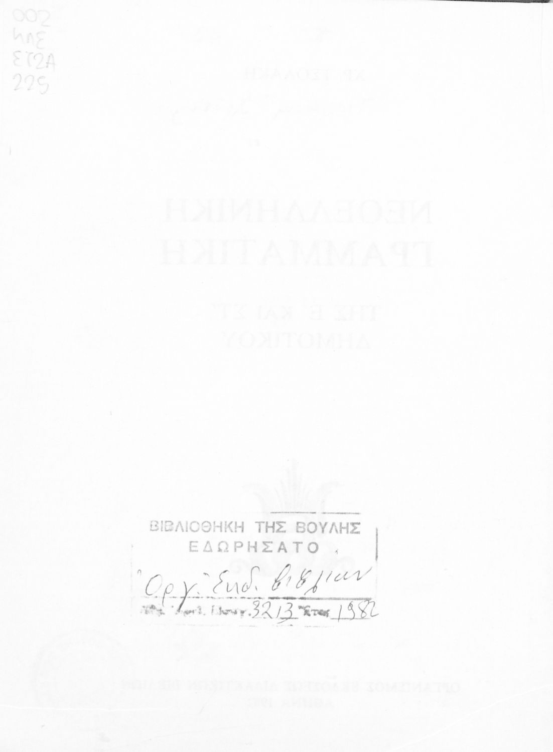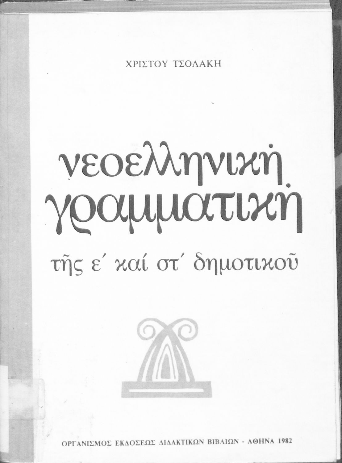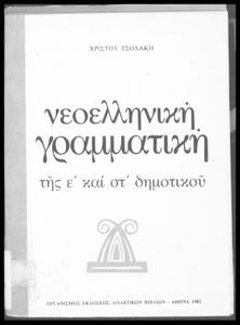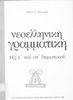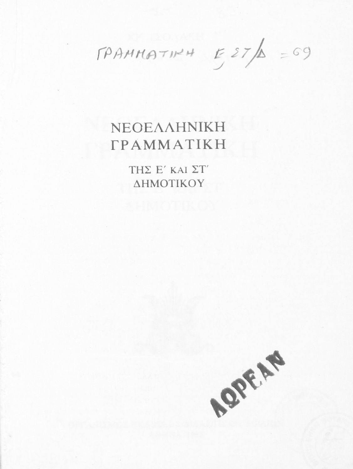 Βαθμίδα εκπαίδευσης: Πρωτοβάθμια Τάξη: Ε' Δημοτικού / ΣΤ' Δημοτικού Μάθημα: Νέα Ελληνικά Γλώσσα: Δημοτική Παρουσίαση περιεχομένου: Το σύγγραμμα ήταν σχολικό εγχειρίδιο για το μάθημα της Ελληνικής Γλώσσας. Πρόκειται για τη σύνοψη της νεοελληνικής γραμματική για τους μαθητές του Δημοτικού. Περιλαμβάνει τη θεωρία των γραμματικών φαινόμενων, καθώς διαθέτει πίνακες και παραδείγματα. Το τελευταίο περιέχει μέρος επίμετρο με ανώμαλα ρήματα, λέξεις και πίνακες. |