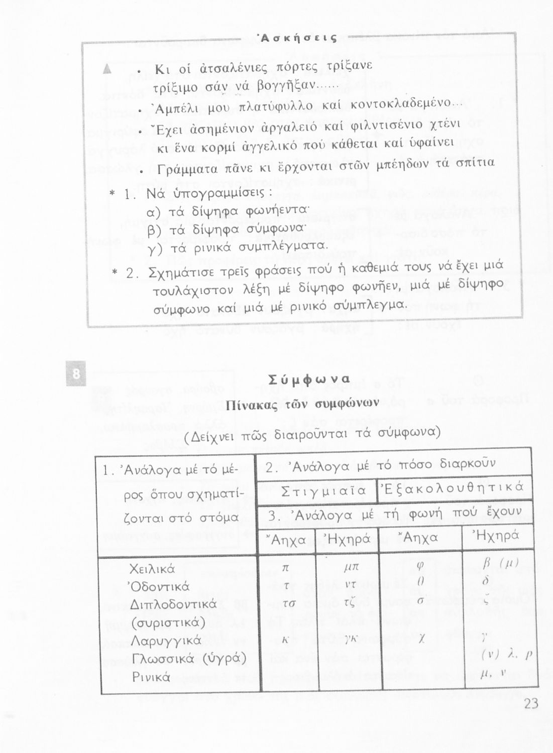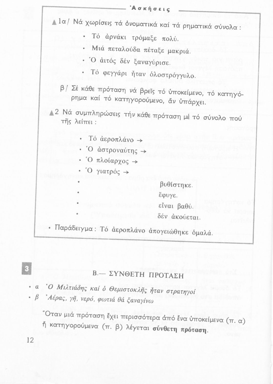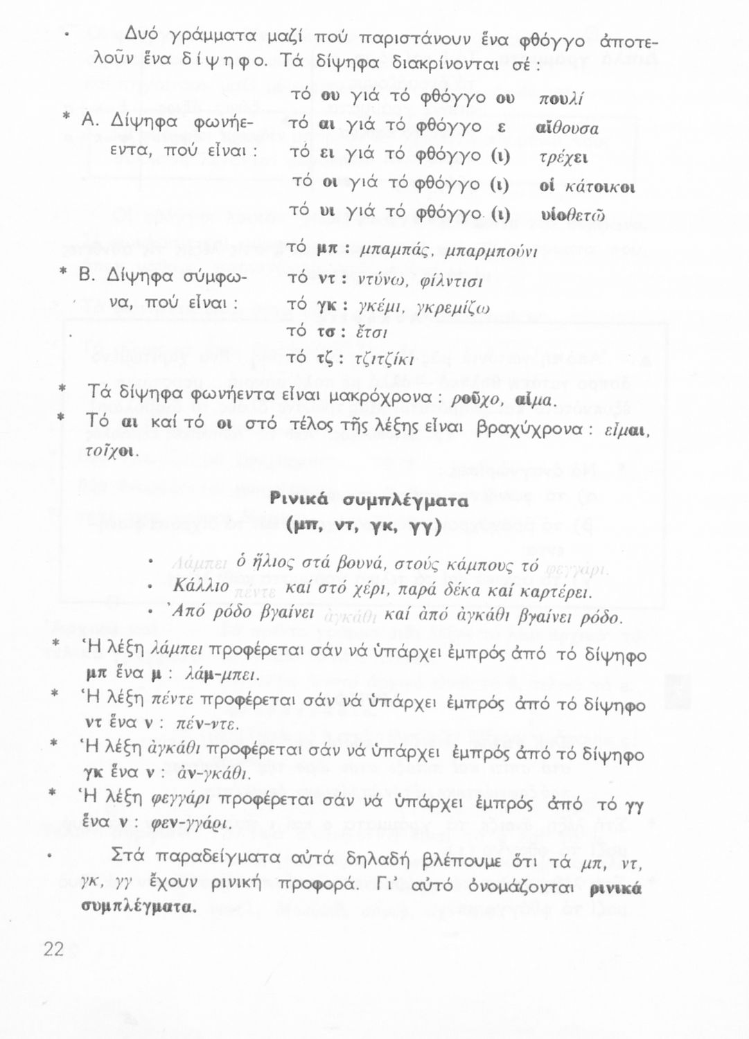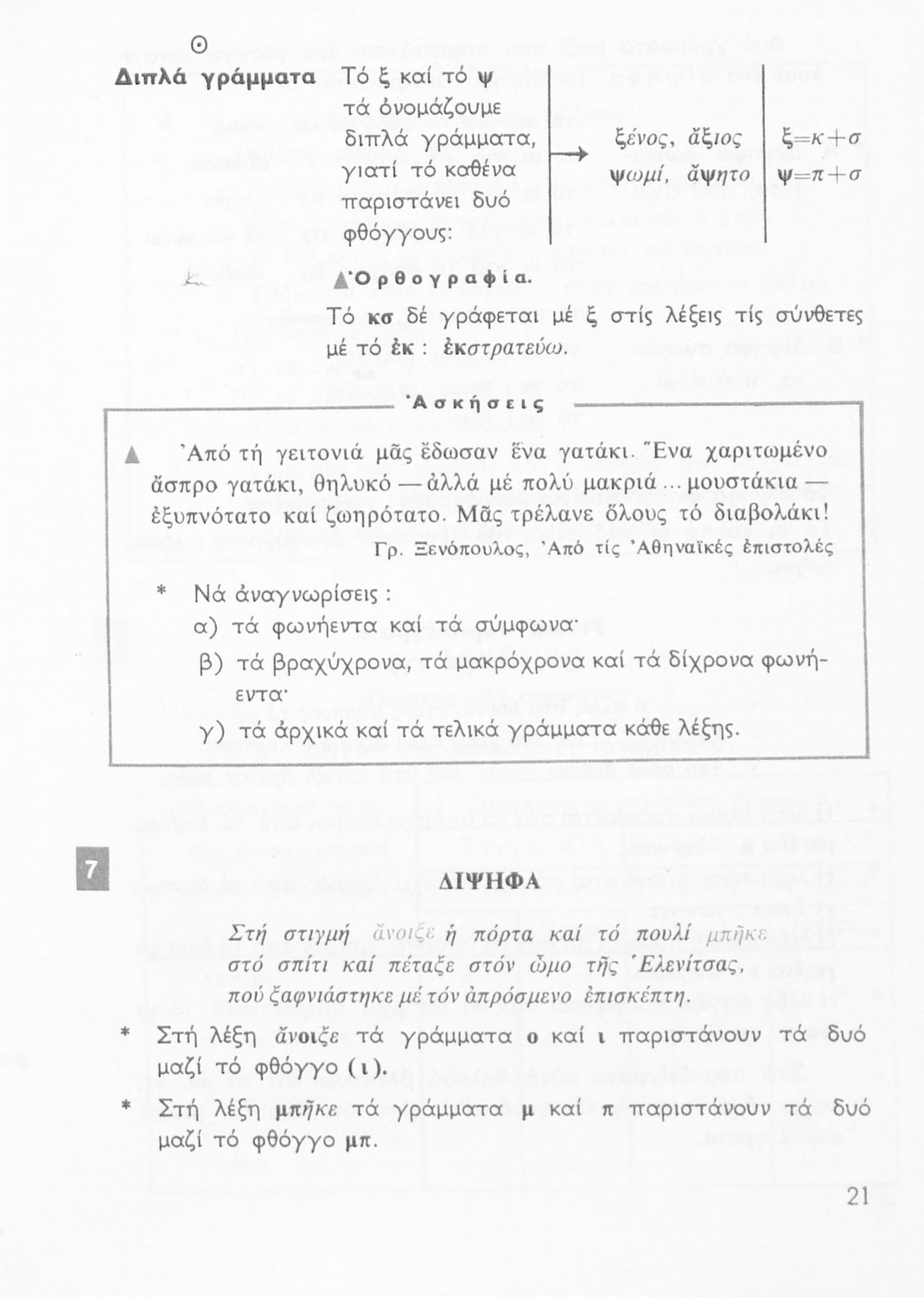 Βαθμίδα εκπαίδευσης: Πρωτοβάθμια Τάξη: Ε' Δημοτικού / ΣΤ' Δημοτικού Μάθημα: Νέα Ελληνικά Γλώσσα: Δημοτική Παρουσίαση περιεχομένου: Το σύγγραμμα ήταν σχολικό εγχειρίδιο για το μάθημα της Ελληνικής Γλώσσας. Πρόκειται για τη σύνοψη της νεοελληνικής γραμματική για τους μαθητές του Δημοτικού. Περιλαμβάνει τη θεωρία των γραμματικών φαινόμενων, καθώς διαθέτει πίνακες και παραδείγματα. Το τελευταίο περιέχει μέρος επίμετρο με ανώμαλα ρήματα, λέξεις και πίνακες. |