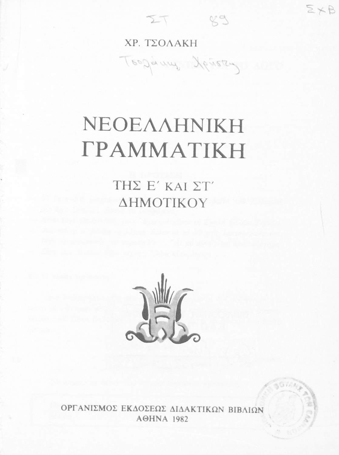 Κωδικός αναγνώρισης: 03-20555776 Τίτλος: Νεοελληνική Γραμματική της Ε' και ΣΤ΄ Δημοτικού Συγγραφέας: Χ. Τσολάκης Εικονογράφος: Αναστ. Μουσταφέλλος Μέγεθος και υπόστρωμα: Σχολικό εγχειρίδιο, μαλακό εξώφυλλο, 302 σελίδες. Εξώφυλλο (έγχρωμο), σκίτσα (έγχρωμα). |