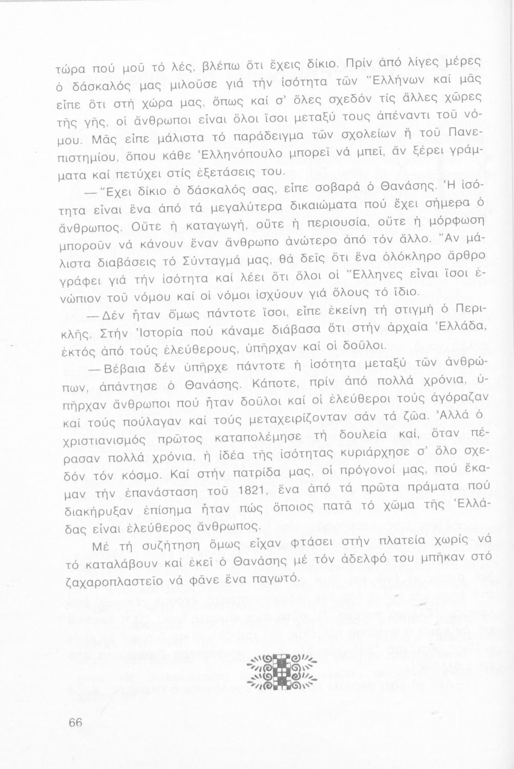 Σχολικό εγχειρίδιο Αγωγής του Πολίτη ΣΤ΄ Δημοτικού που εστιάζει στα καθήκοντα πολίτη, τις βασικές αρχές του δημοκρατικού πολιτεύματος, τους νόμους, το ρόλο της κυβέρνησης, και της δικαιοσύνης, τη λειτουργία των θεσμών και την αξία των ανθρώπινων δικαιωμάτων. Αποσκοπεί στην κατανόηση της έννοιας του Δίκαιου και του Πολίτη.