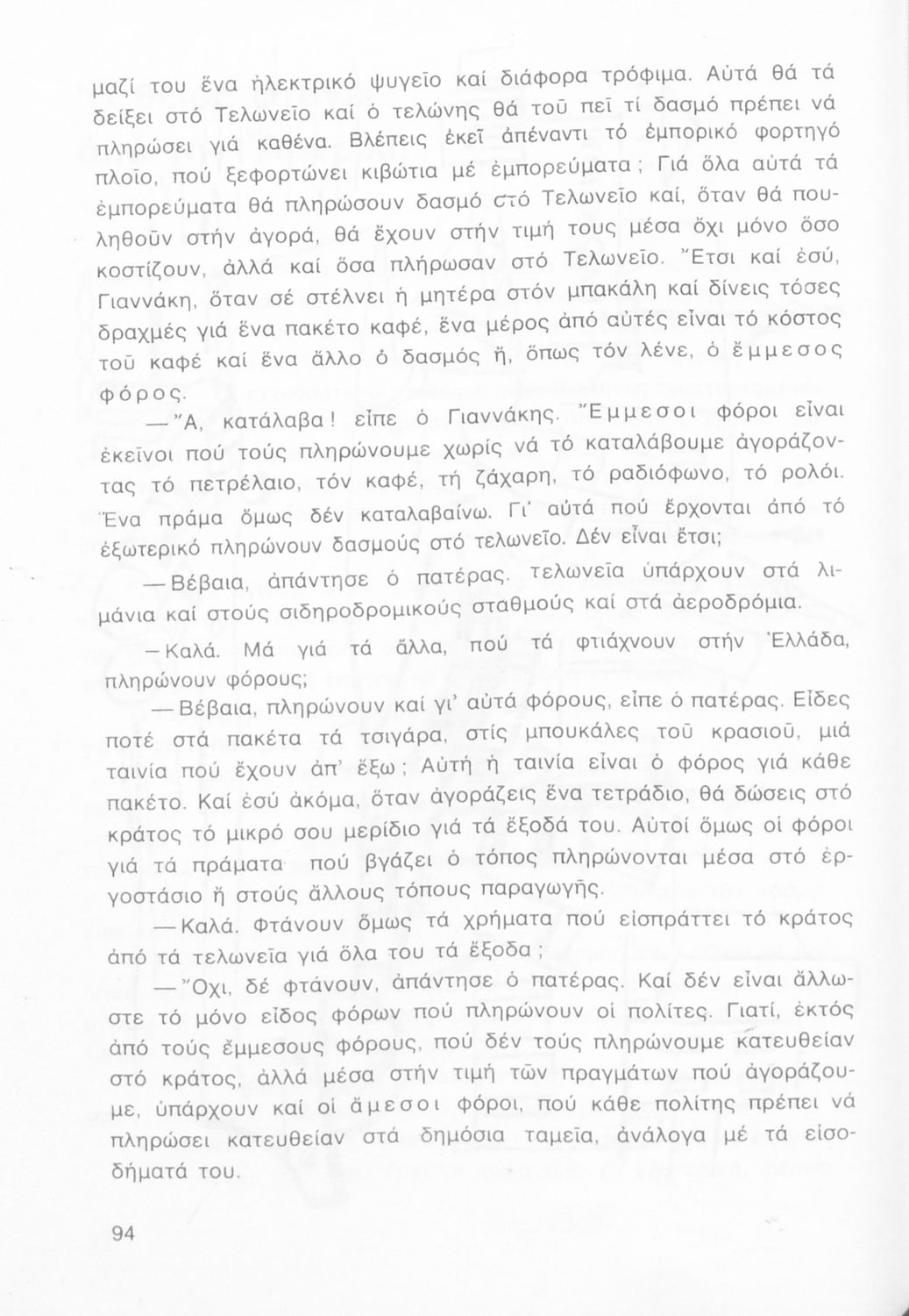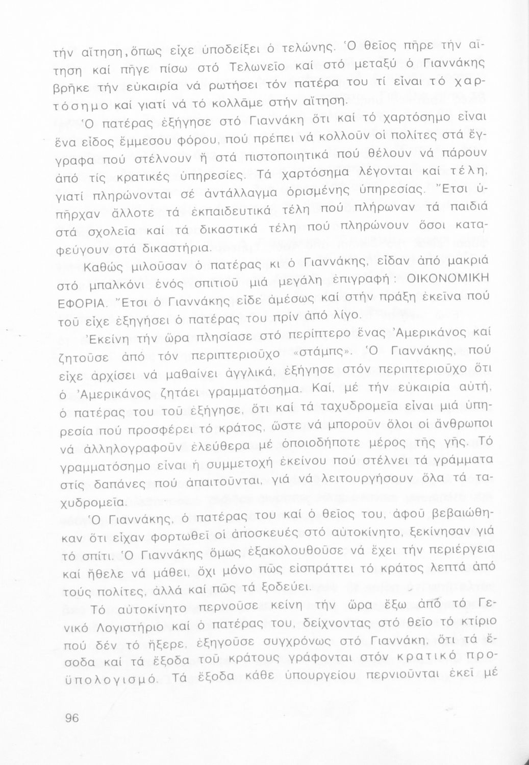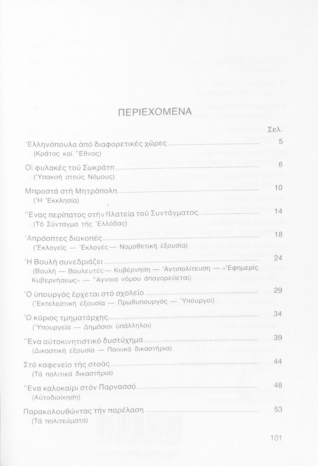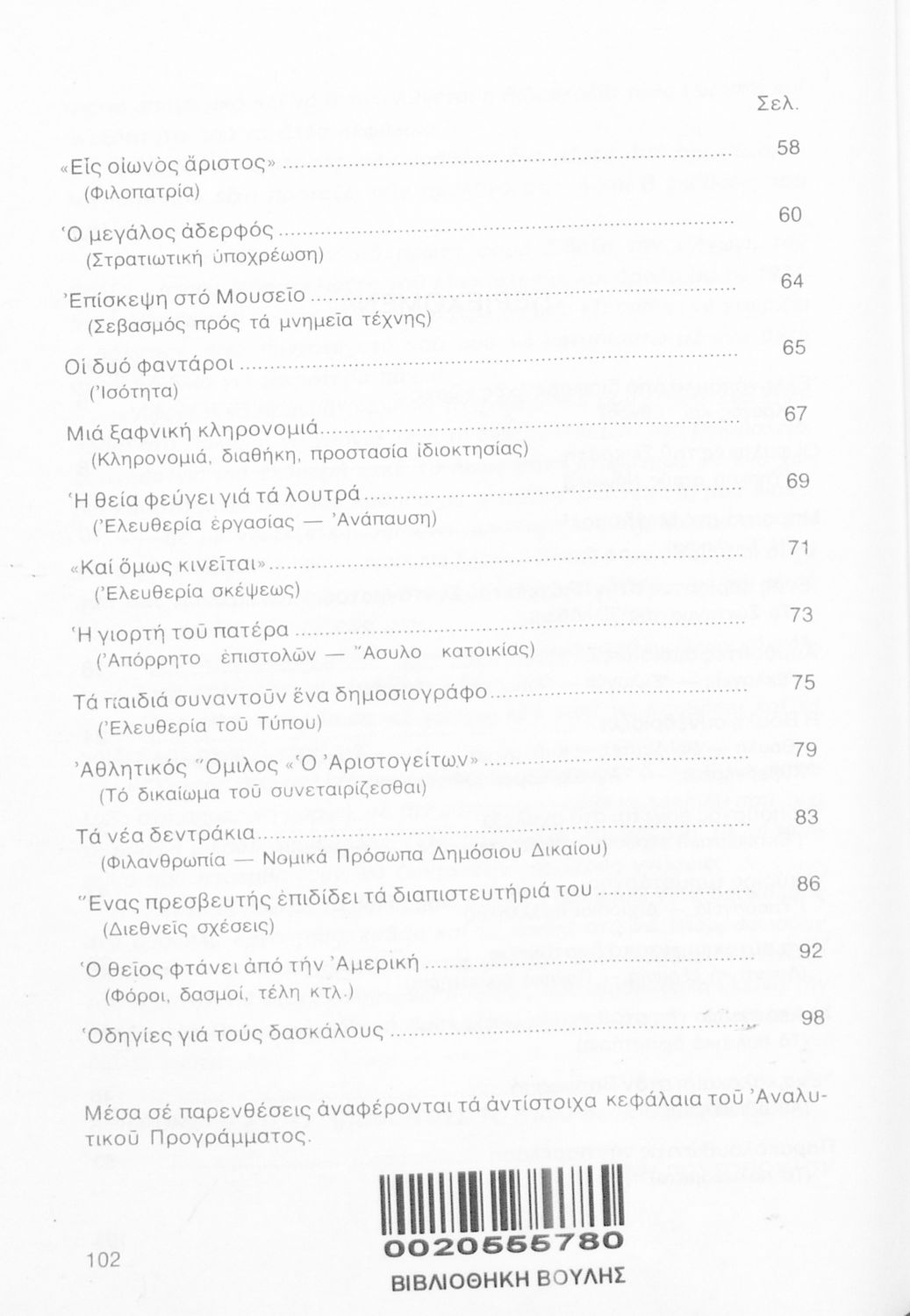 LDR 01702 2200217 4500 035 ## _a03-20555780 040 ## _aΒιβλιοθήκη της Βουλής των Ελλήνων 041 ## _ael 100 ## _aΑγνή Ρουσοπούλου 110 ## _a20555780 245 0# _aΑγωγή του Πολίτη για την ΣΤ΄ Δημοτικού 250 ## _a8η Έκδοση 260 ## _aΑθήνα _bΟργανισμός Εκδόσεως Διδακτικών Βιβλίων _c1982 300 ## _a104 _bΕικόνες, σκίτσα (ασπρόμαυρα) 520 ## _aΣχολικό εγχειρίδιο Αγωγής του Πολίτη ΣΤ΄ Δημοτικού που εστιάζει στα καθήκοντα πολίτη, τις βασικές αρχές του δημοκρατικού πολιτεύματος, τους νόμους, το ρόλο της κυβέρνησης, και της δικαιοσύνης, τη λειτουργία των θεσμών και την αξία των ανθρώπινων δικαιωμάτων. Αποσκοπεί στην κατανόηση της έννοιας του Δίκαιου και του Πολίτη. 521 ## _aΣΤ' Δημοτικού 522 ## _aΕλλάδα 546 ## _aΔημοτική 563 ## _aΜαλακό Εξώφυλλο 583 ## _a3737/25-1-1982 _c1982 650 #4 _aΑυτοδιοίκηση _aΔιεθνείς σχέσεις _aΔικαστική εξουσία _aΕκλογές _aΕκτελεστική εξουσία _aΕλευθερία εργασίας _aΕλευθερία τύπου _aΝομοθετική εξουσία _aΠολιτικά δικαστήρια _aΣτρατιωτική υποχρέωση _aΦιλοπατρία