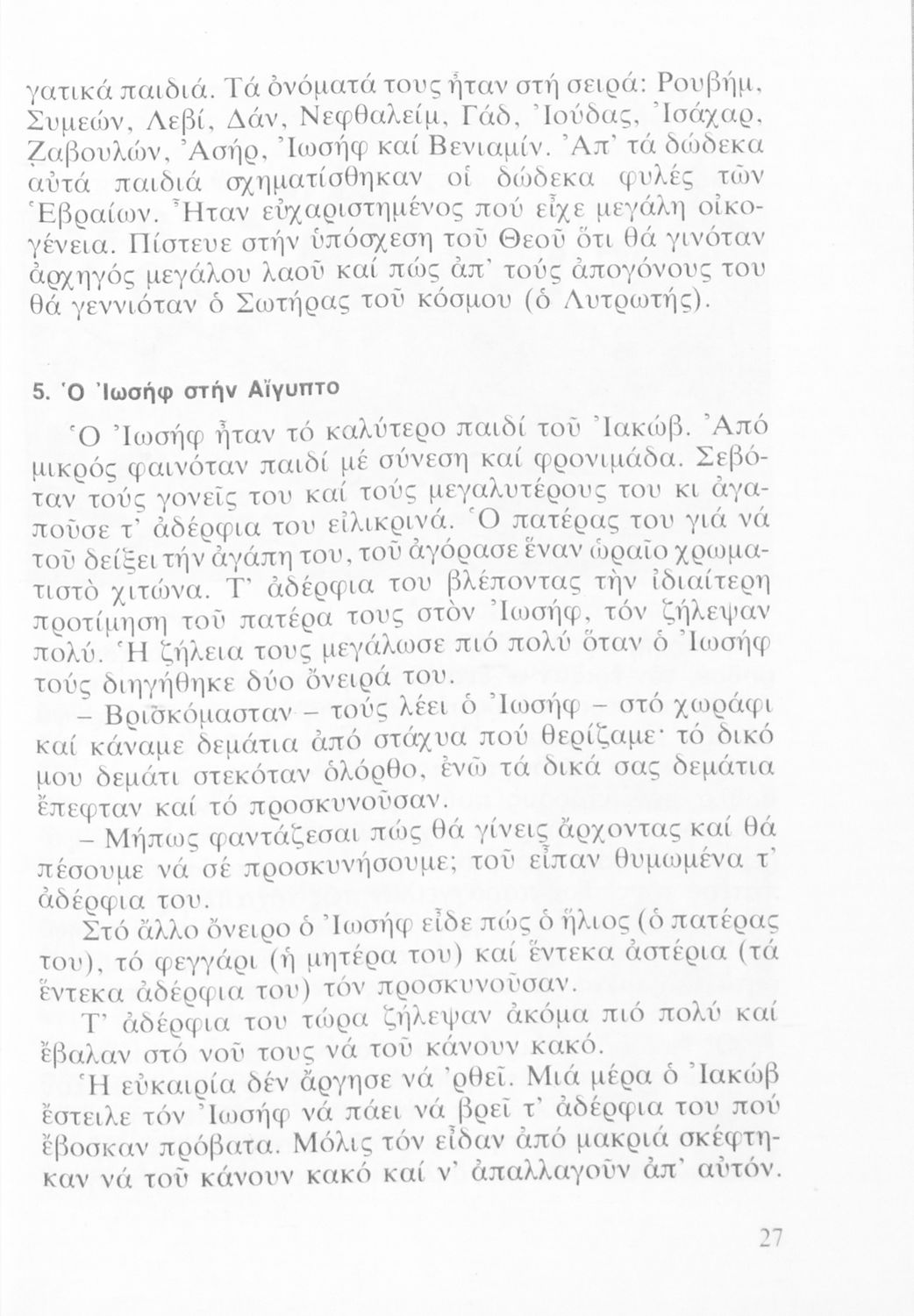 Σχολικό εγχειρίδιο Θρησκευτικών για την Ε΄ Οκταταξίου και Εξατάξιου Γυμνασίου που περιέχει εισαγωγικά σχόλια στα βιβλία της Παλαιάς και Καινής Διαθήκης, περικοπές, ερμηνευτικές και πραγματολογικές σημειώσεις