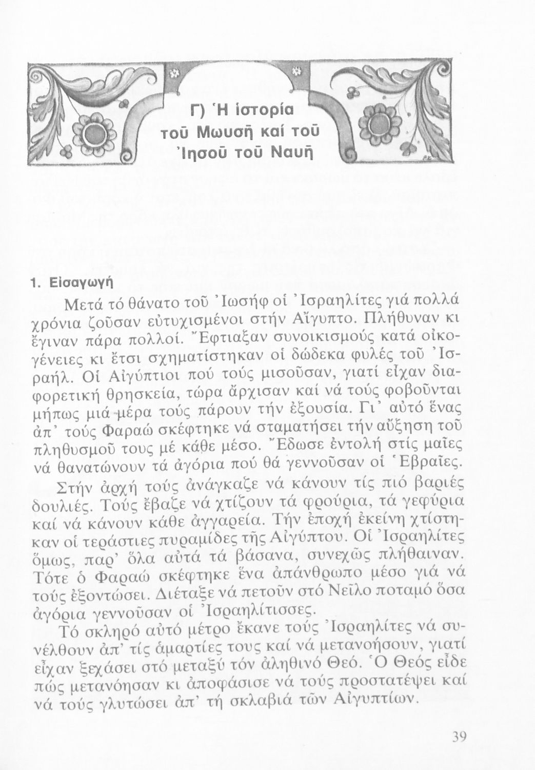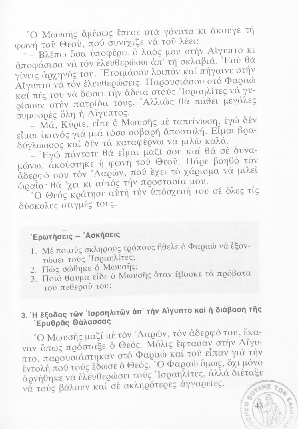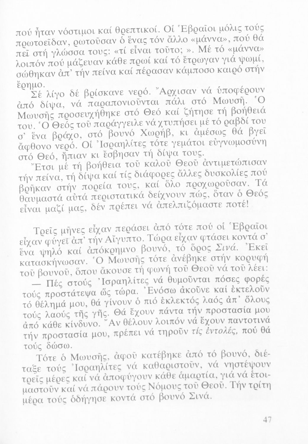 Μαθητικό βοήθημα της Γ' Δημοτικού για το μάθημα των Θρησκευτικών. Αναφέρεται στα γεγονότα της Παλαιάς Διαθήκης. Ξεκινάει τη δημιουργία του κόσμου, τους πατριάρχες, την ιστορία το Μωυσή, την περίοδο των βασιλέων, και τέλος το έργο των προφητών.