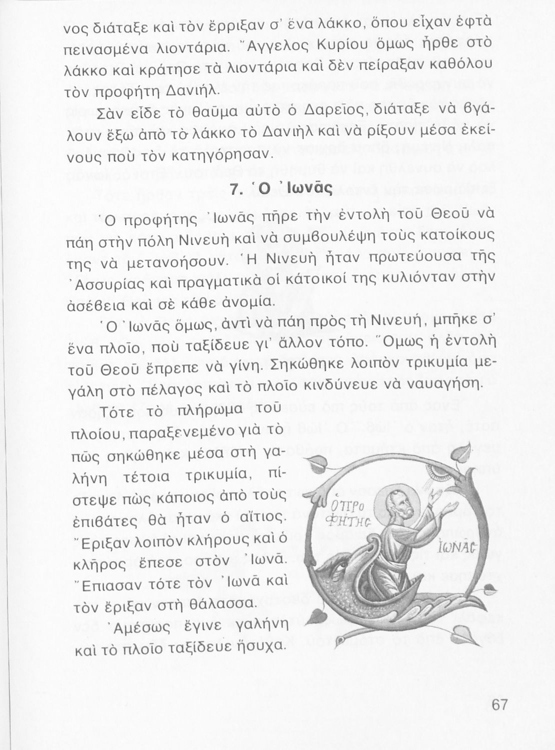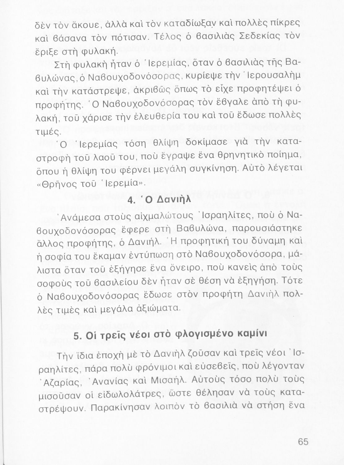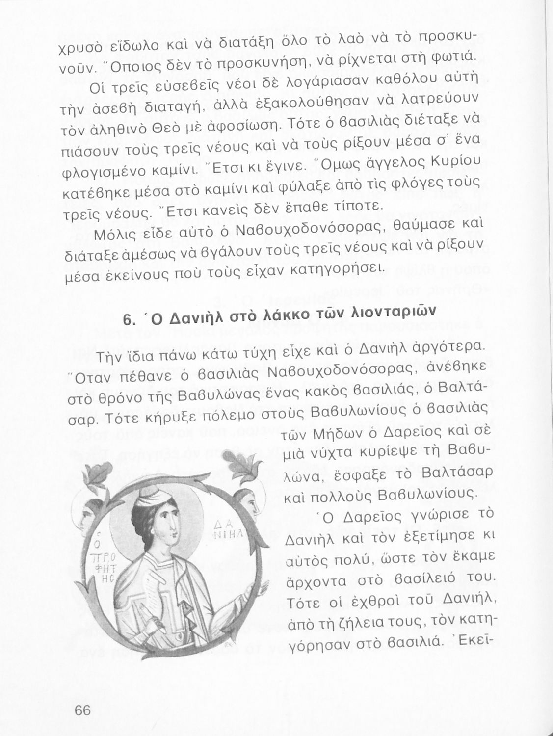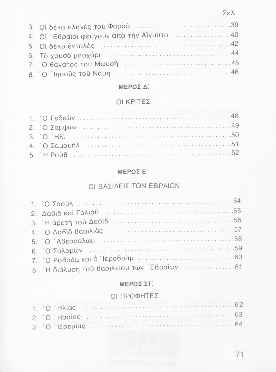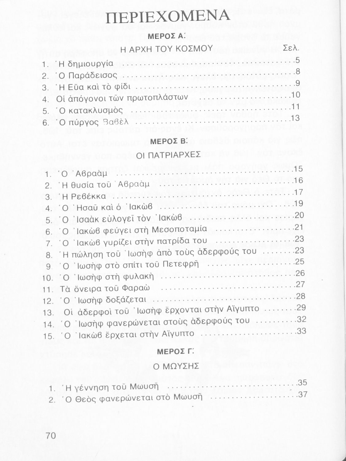 Σχολικό εγχειρίδιο Θρησκευτικών Δημοτικού που συνιστά μία εξιστόρηση της Παλαιάς Διαθήκης από τη δημιουργία του κόσμου ως τους Προφήτες.