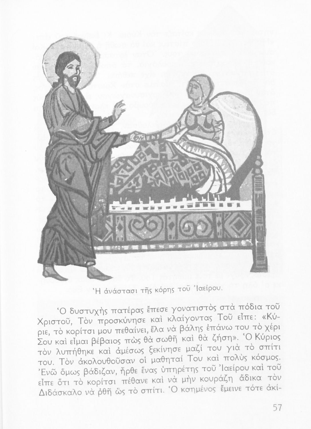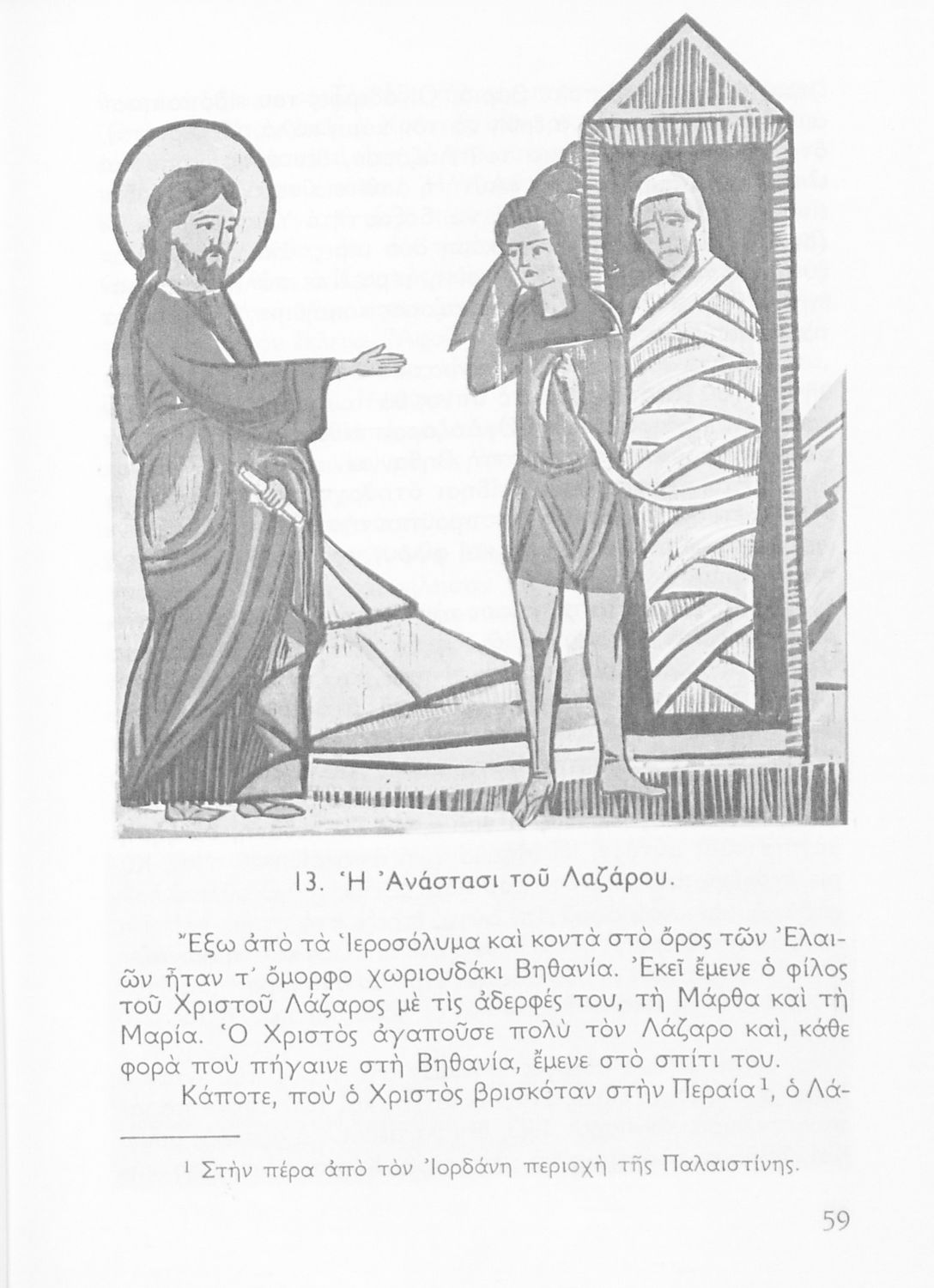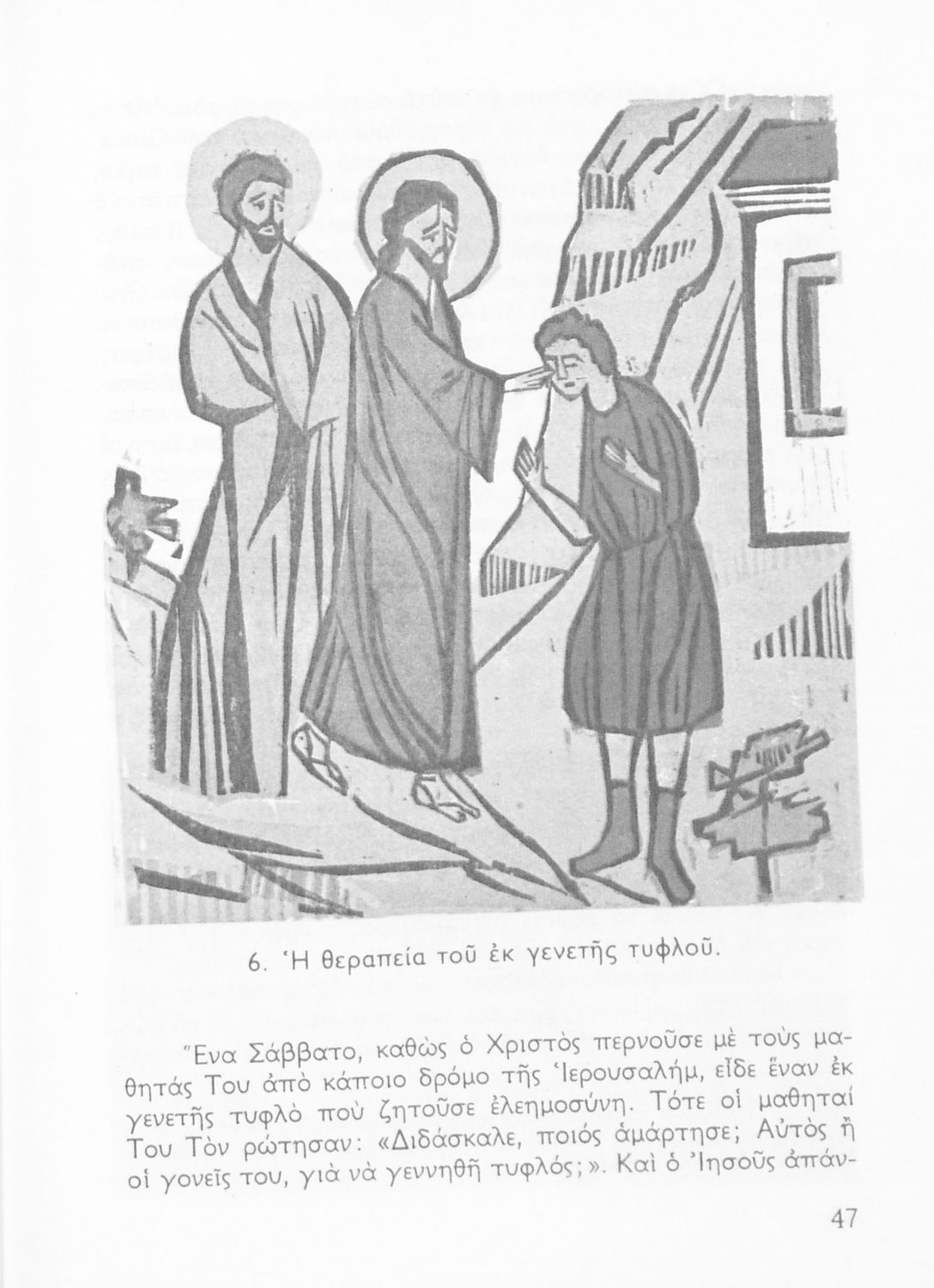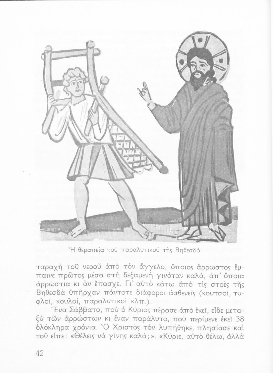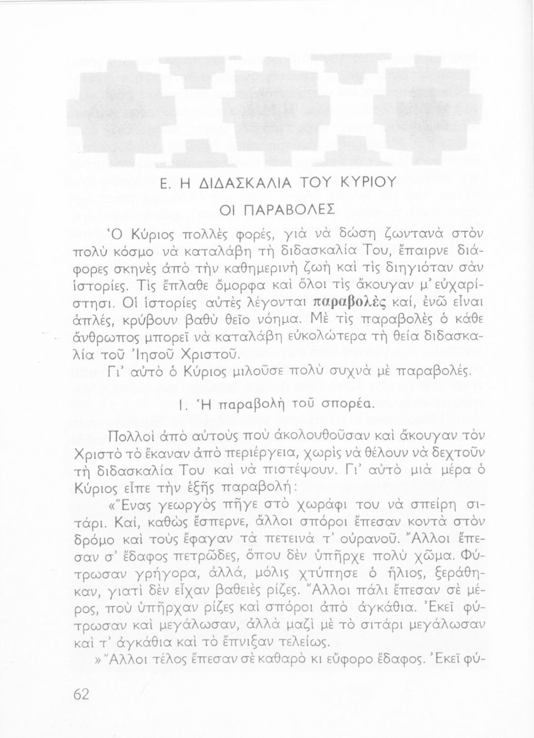Σχολικό εγχειρίδιο Θρησκευτικών Δ' Δημοτικού που παρουσιάζει τη ζωή και τη δράση του Χριστού μέσα από τις παραβολές και τα θαύματά του. Περιέχει και ποιήματα, προσευχές και χριστιανικά θρησκευτικά άσματα και στοιχεία γεωγραφίας της Παλαιστίνης. Φέρει το σύμβολο της δικτατορίας.