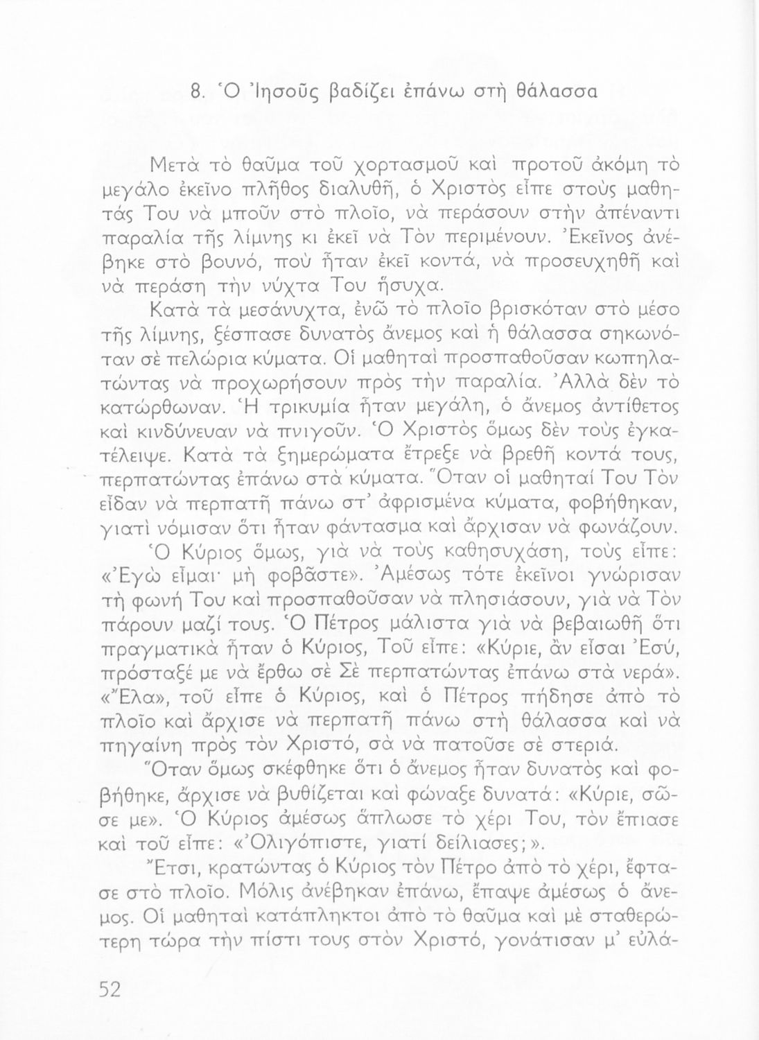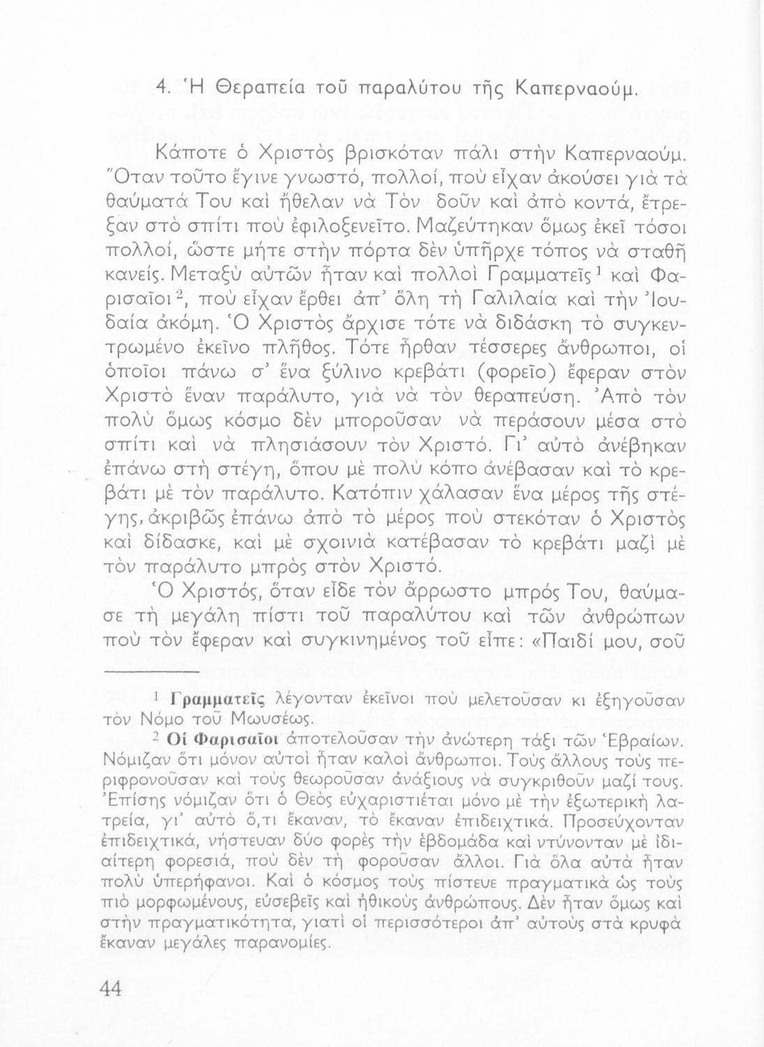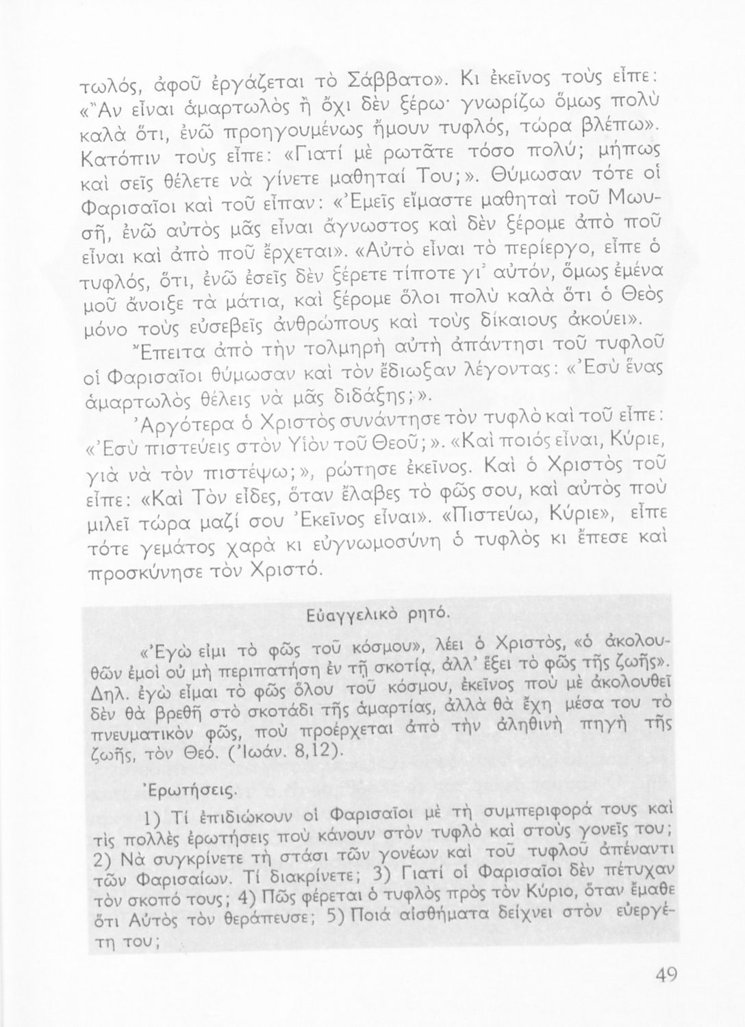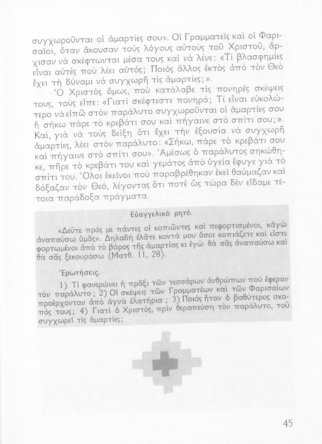 Σχολικό εγχειρίδιο Θρησκευτικών Δ' Δημοτικού που παρουσιάζει τη ζωή και τη δράση του Χριστού μέσα από τις παραβολές και τα θαύματά του. Περιέχει και ποιήματα, προσευχές και χριστιανικά θρησκευτικά άσματα και στοιχεία γεωγραφίας της Παλαιστίνης. Φέρει το σύμβολο της δικτατορίας.