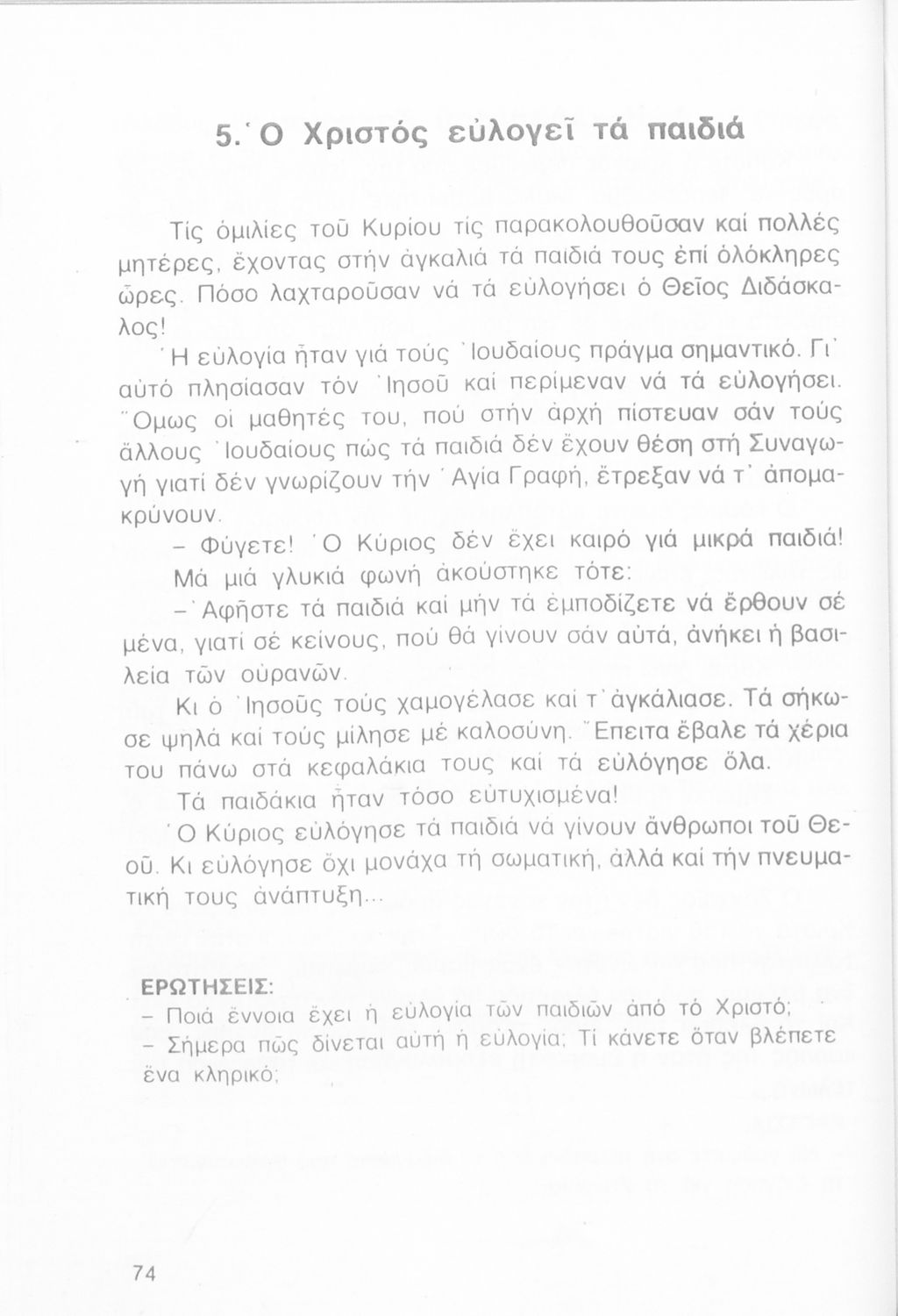 Βαθμίδα εκπαίδευσης: Πρωτοβάθμια Τάξη: Δ' Δημοτικού Μάθημα: Θρησκευτικά Γλώσσα: Δημοτική Παρουσίαση περιεχομένου: Σχολικό εγχειρίδιο Θρησκευτικών Δ' Δημοτικού που παρουσιάζει τη ζωή και τη δράση του Χριστού μέσα από τις παραβολές και τα θαύματά του. Περιέχει και ποιήματα, προσευχές και χριστιανικά θρησκευτικά άσματα. |