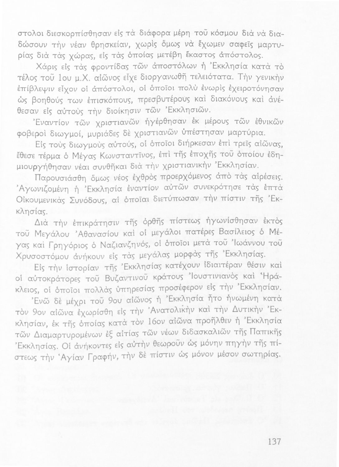 Σχολικό εγχειρίδιο Θρησκευτικών Ε΄ Δημοτικού που αποτελεί μια ιστορική επισκόπηση της Ορθόδοξης Εκκλησίας από την ίδρυσή της μέχρι την ίδρυση της Εκκλησίας της Ελλάδας. Φέρει το σύμβολο της δικτατορίας.