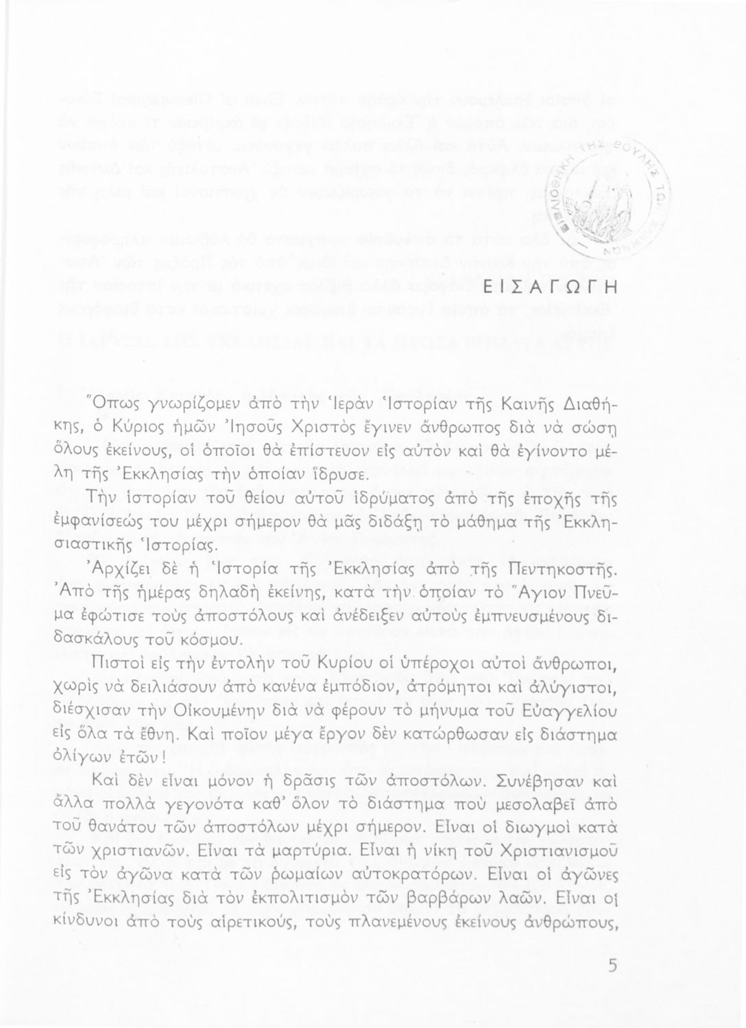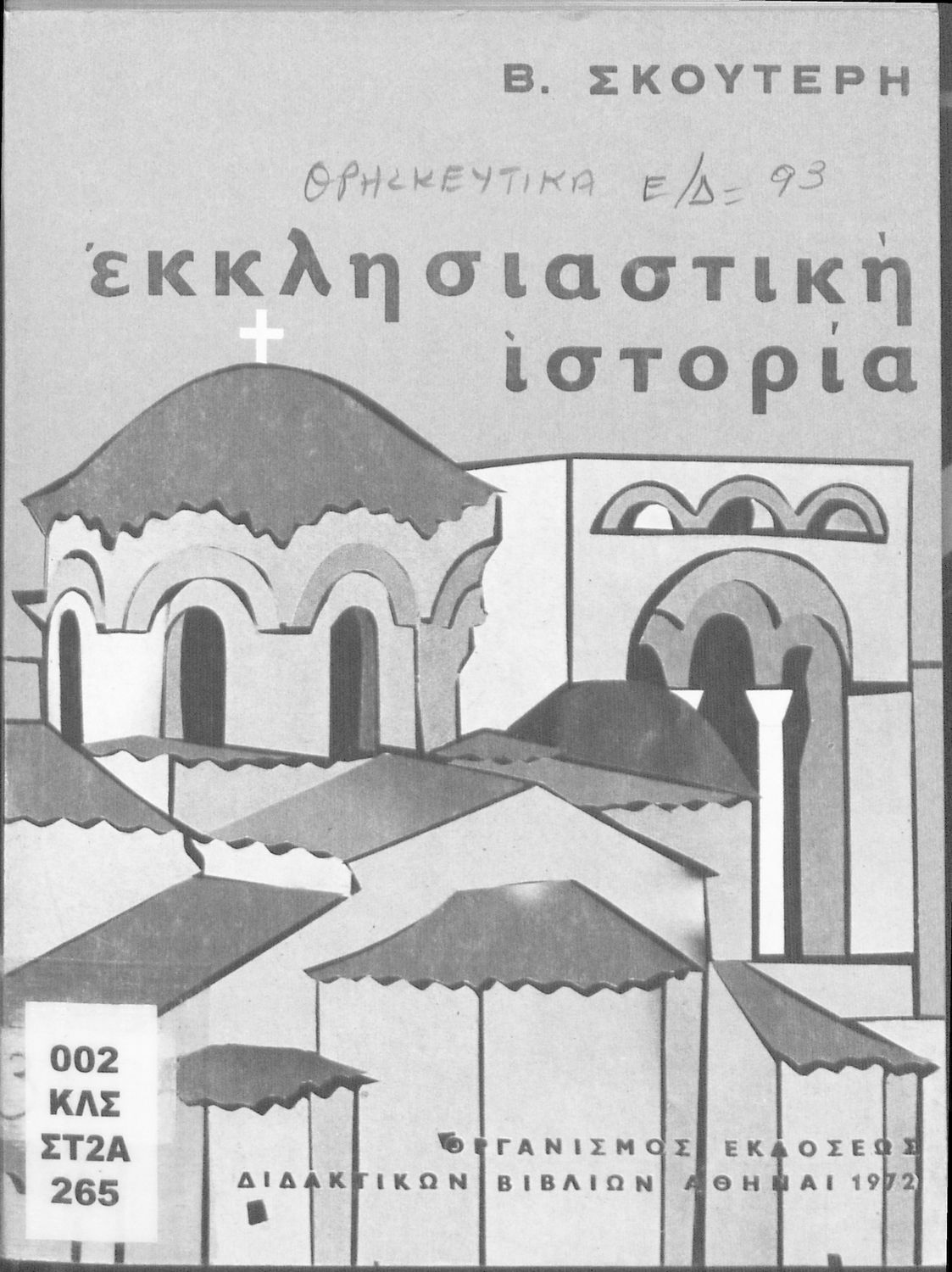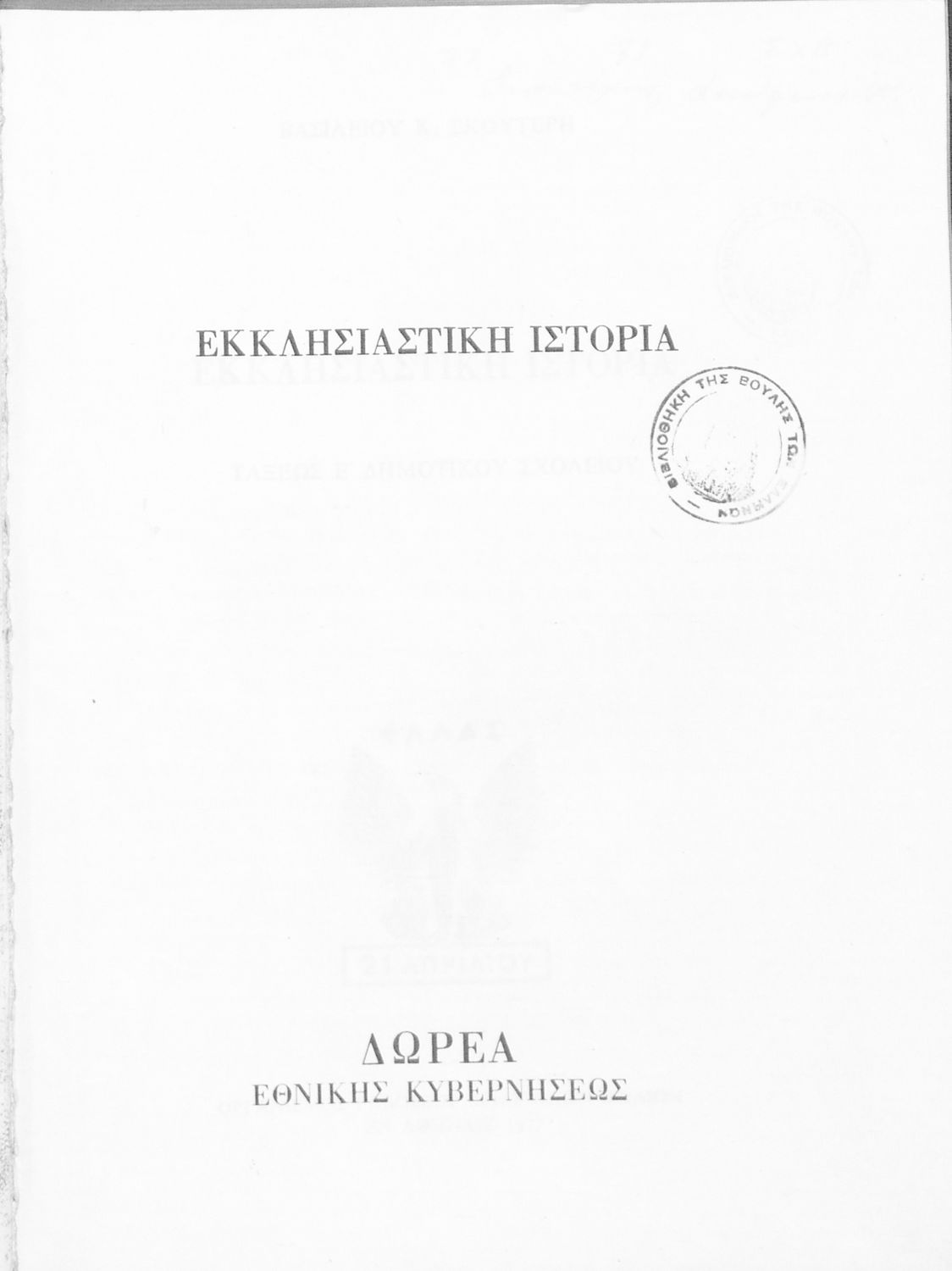 Σχολικό εγχειρίδιο Θρησκευτικών Ε΄ Δημοτικού που αποτελεί μια ιστορική επισκόπηση της Ορθόδοξης Εκκλησίας από την ίδρυσή της μέχρι την ίδρυση της Εκκλησίας της Ελλάδας. Φέρει το σύμβολο της δικτατορίας.