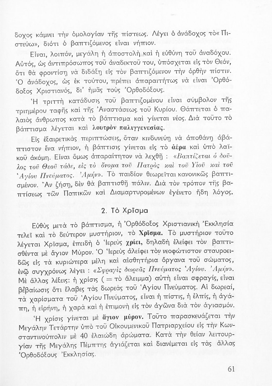 Σχολικό εγχειρίδιο Θρησκευτικών ΣΤ΄ Δημοτικού που αναλύει την έννοια της κατήχησης στις διάφορες θρησκείες με έμφαση στο ορθόδοξο χριστιανικό δόγμα, το οποίο εξετάζει από δογματική και ηθική σκοπιά. Περιλαμβάνει και στοιχεία λειτουργικής της Ορθόδοξης Εκκλησίας. Φέρει το σύμβολο της δικτατορίας.