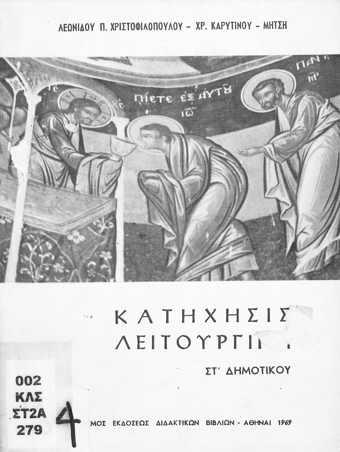 Κωδικός αναγνώρισης: 03-20555830 Τίτλος: Κατήχηση και Λειτουργική προς χρήσιν των μαθητών της ΣΤ΄ τάξεως των Δημοτικών Σχολείων Συγγραφέας: Λεωνίδας Χριστοφιλόπουλος, Χρήστος Καρυτινός Μέγεθος και υπόστρωμα: Σχολικό εγχειρίδιο, μαλακό εξώφυλλο, 168 σελίδες. Εικόνες (ασπρόμαυρες), σκίτσα (ασπρόμαυρα). |
