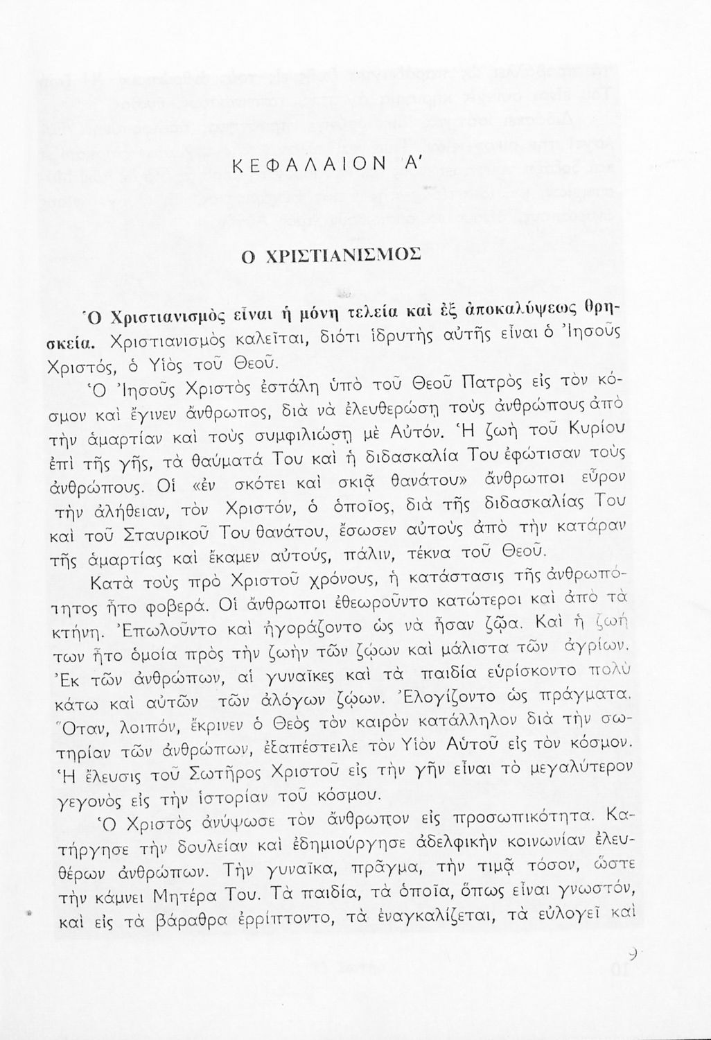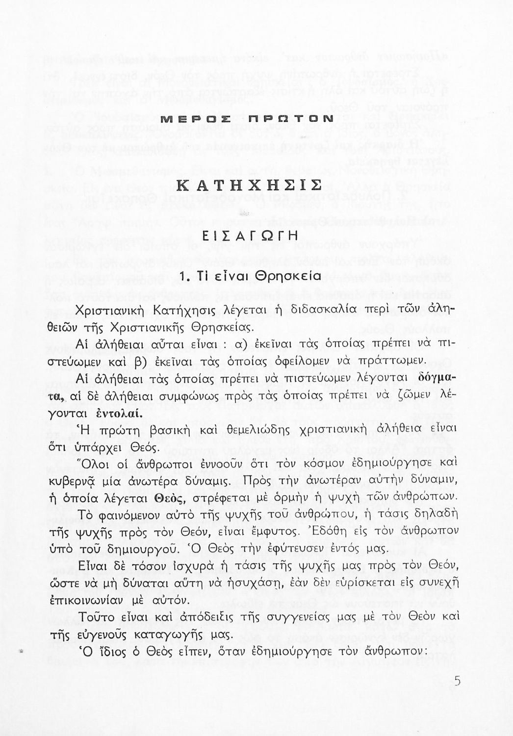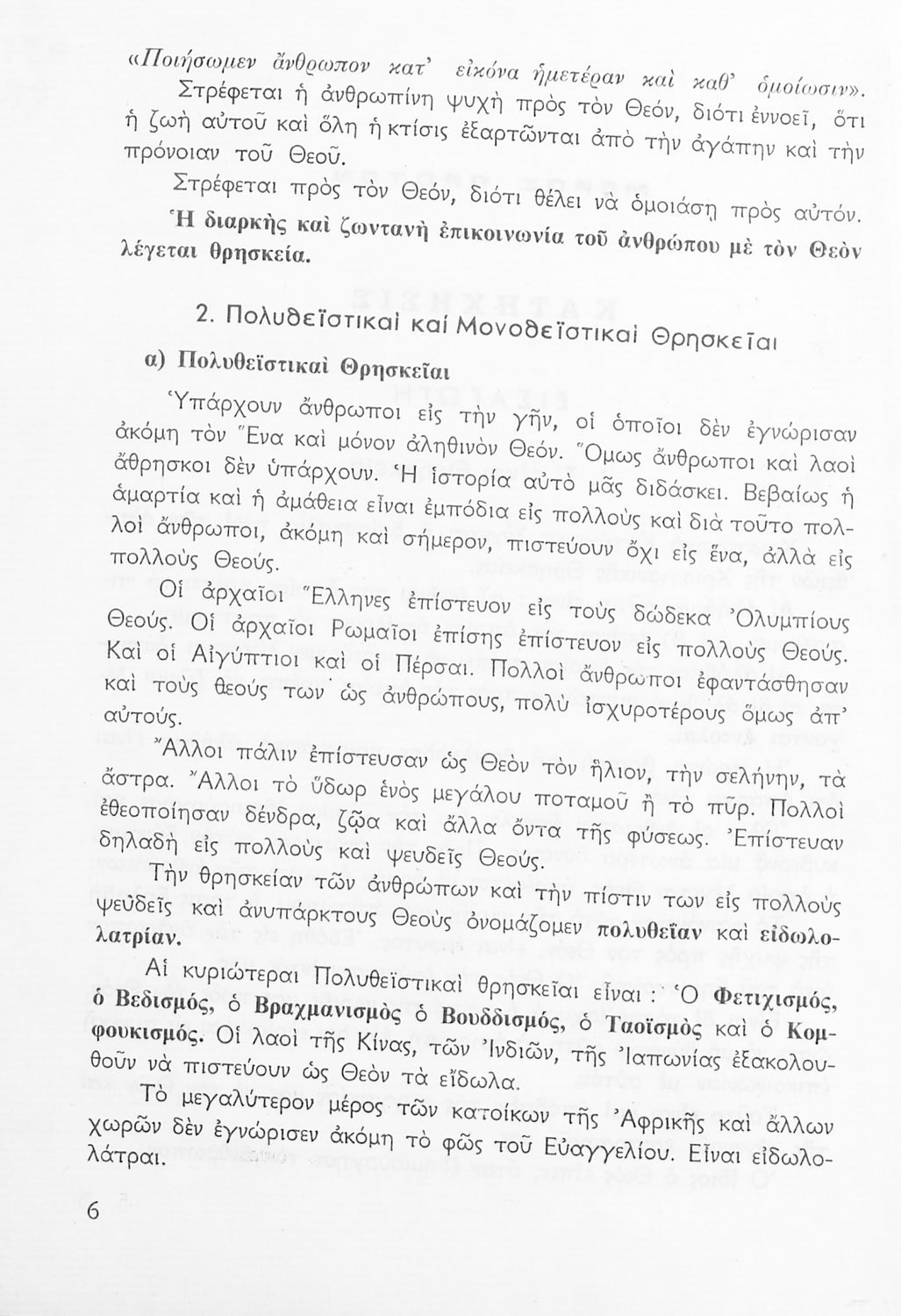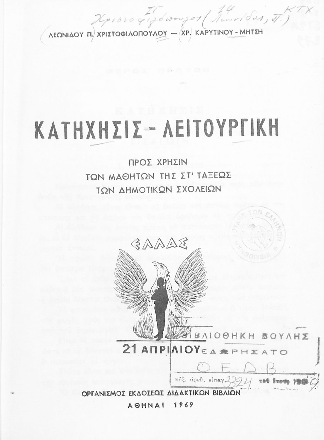 Σχολικό εγχειρίδιο Θρησκευτικών ΣΤ΄ Δημοτικού που αναλύει την έννοια της κατήχησης στις διάφορες θρησκείες με έμφαση στο ορθόδοξο χριστιανικό δόγμα, το οποίο εξετάζει από δογματική και ηθική σκοπιά. Περιλαμβάνει και στοιχεία λειτουργικής της Ορθόδοξης Εκκλησίας. Φέρει το σύμβολο της δικτατορίας.