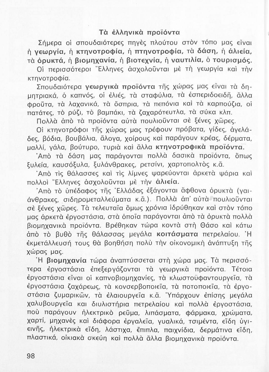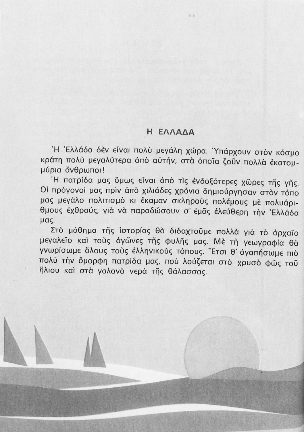 Σχολικό εγχειρίδιο Γεωγραφίας Γ ΄ και Δ' Δημοτικού. Το πρώτο μέρος του βιβλίου απευθύνεται σε μαθητές της Γ' Δημοτικού και αποτελεί μια εισαγωγή στην πατριδογνωσία με έμφαση στις παραδόσεις της ελληνικής επαρχίας. Το δεύτερο μέρος αφορά την Δ' Δημοτικού και εξετάζει την οικονομική, πολιτική και γεωφυσική γεωγραφία της Ελλάδας.