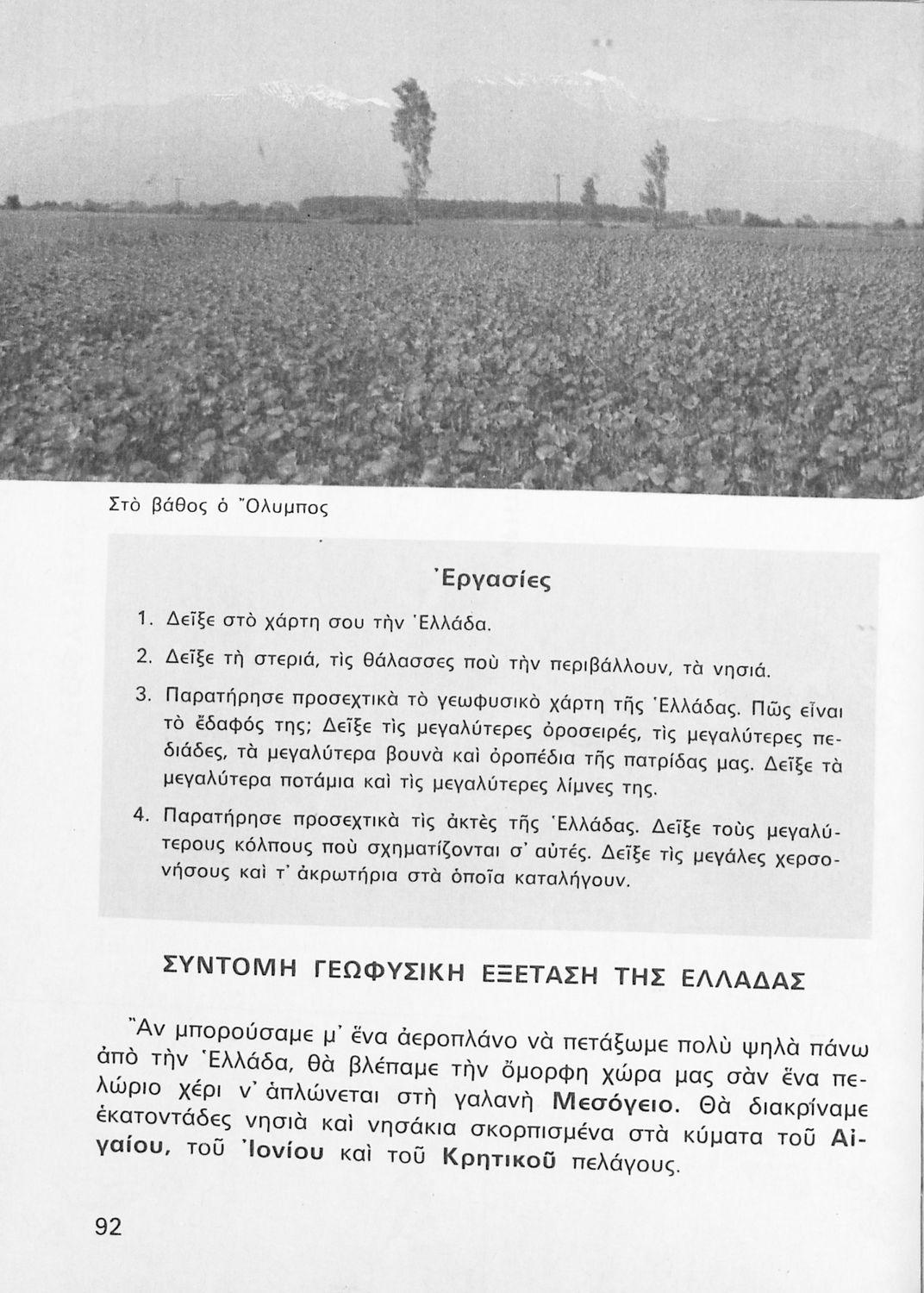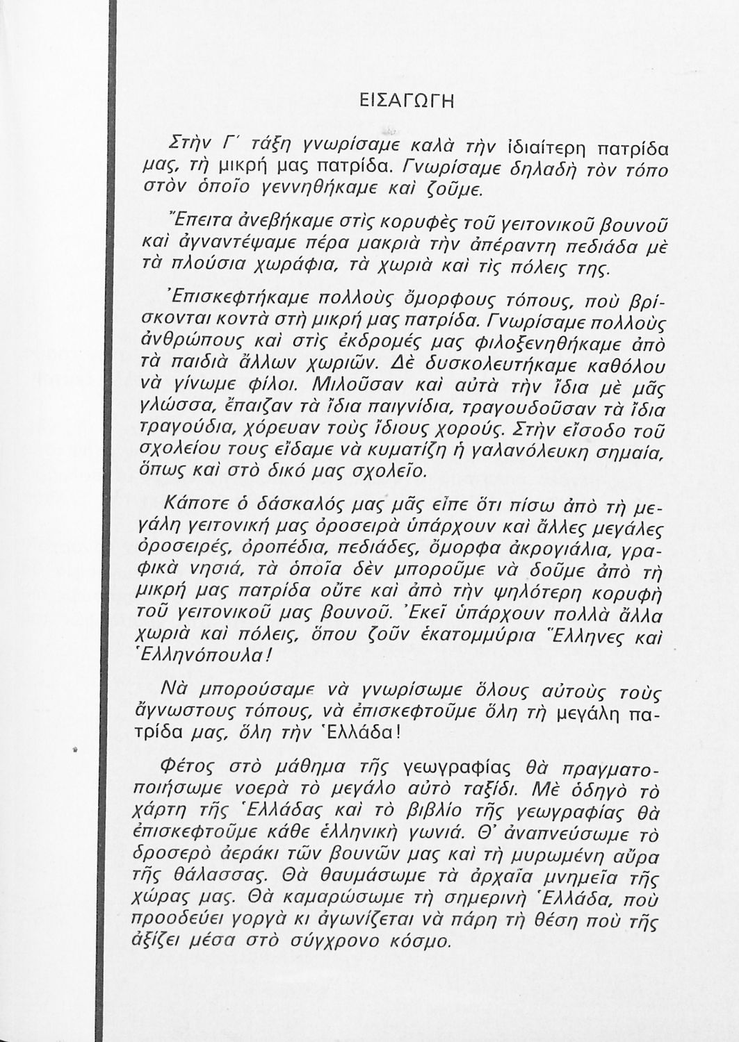 Παρουσίαση περιεχομένου: Σχολικό εγχειρίδιο Γεωγραφίας Γ ΄ και Δ' Δημοτικού. Το πρώτο μέρος του βιβλίου απευθύνεται σε μαθητές της Γ' Δημοτικού και αποτελεί μια εισαγωγή στην πατριδογνωσία με έμφαση στις παραδόσεις της ελληνικής επαρχίας. Το δεύτερο μέρος αφορά την Δ' Δημοτικού και εξετάζει την οικονομική, πολιτική και γεωφυσική γεωγραφία της Ελλάδας.