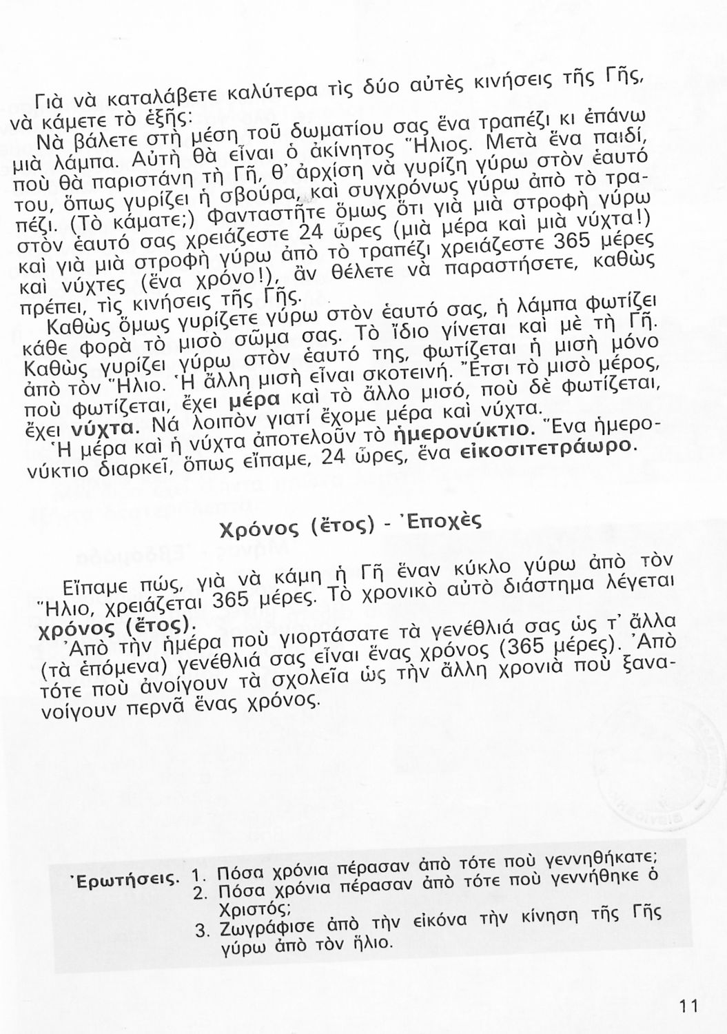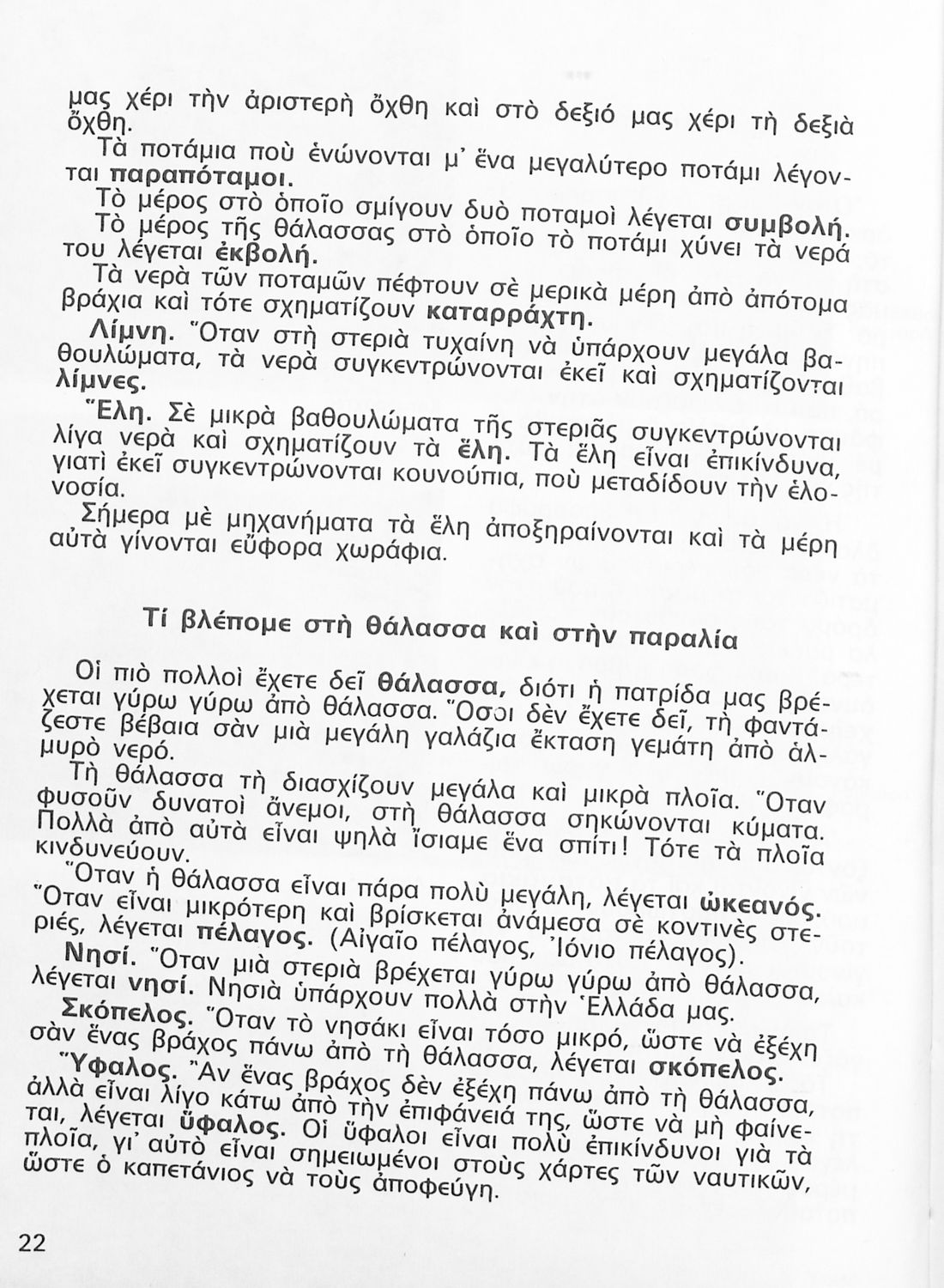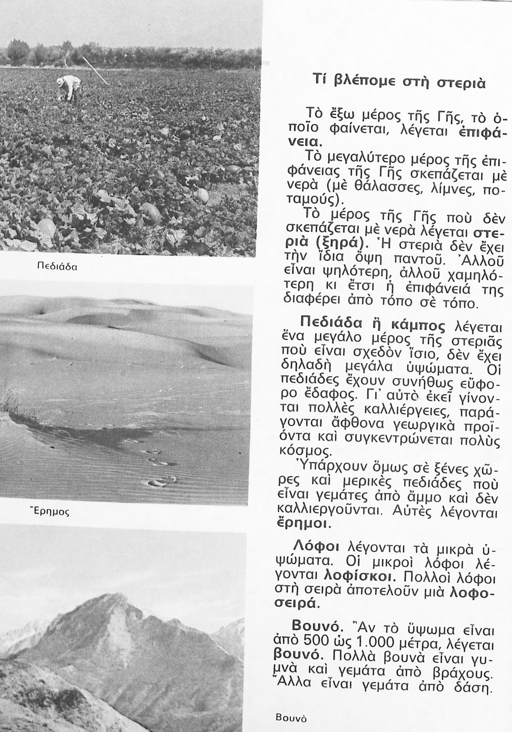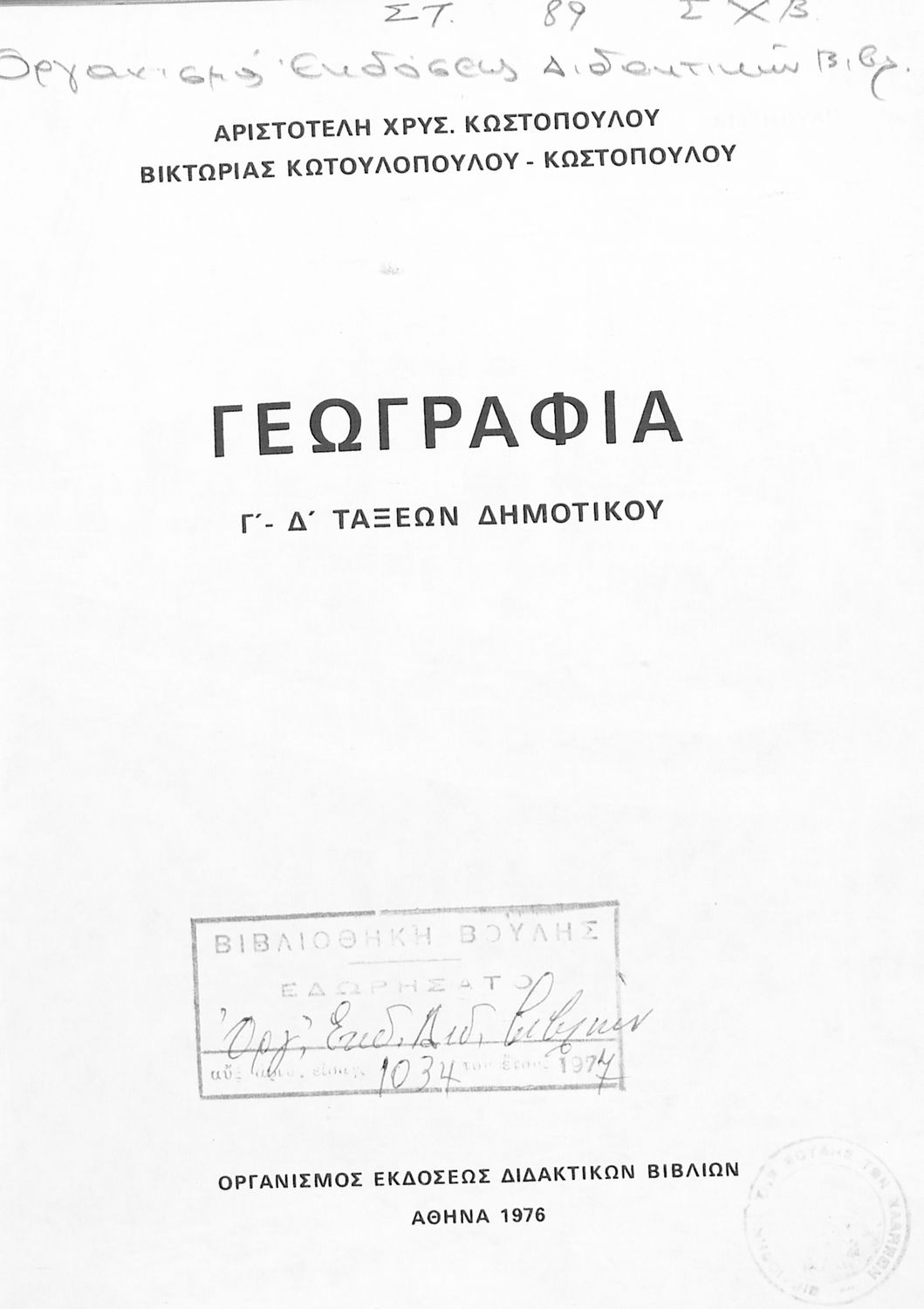 Βαθμίδα εκπαίδευσης: Πρωτοβάθμια Τάξη: Γ' Δημοτικού / Δ' Δημοτικού Μάθημα: Γεωγραφία Γλώσσα: Δημοτική Παρουσίαση περιεχομένου: Σχολικό εγχειρίδιο Γεωγραφίας Γ ΄ και Δ' Δημοτικού. Το πρώτο μέρος του βιβλίου απευθύνεται σε μαθητές της Γ' Δημοτικού και αποτελεί μια εισαγωγή στην πατριδογνωσία με έμφαση στις παραδόσεις της ελληνικής επαρχίας. Το δεύτερο μέρος αφορά την Δ' Δημοτικού και εξετάζει την οικονομική, πολιτική και γεωφυσική γεωγραφία της Ελλάδας. |