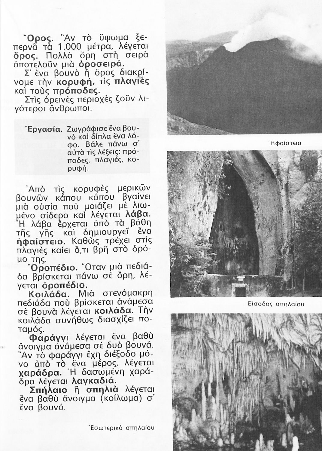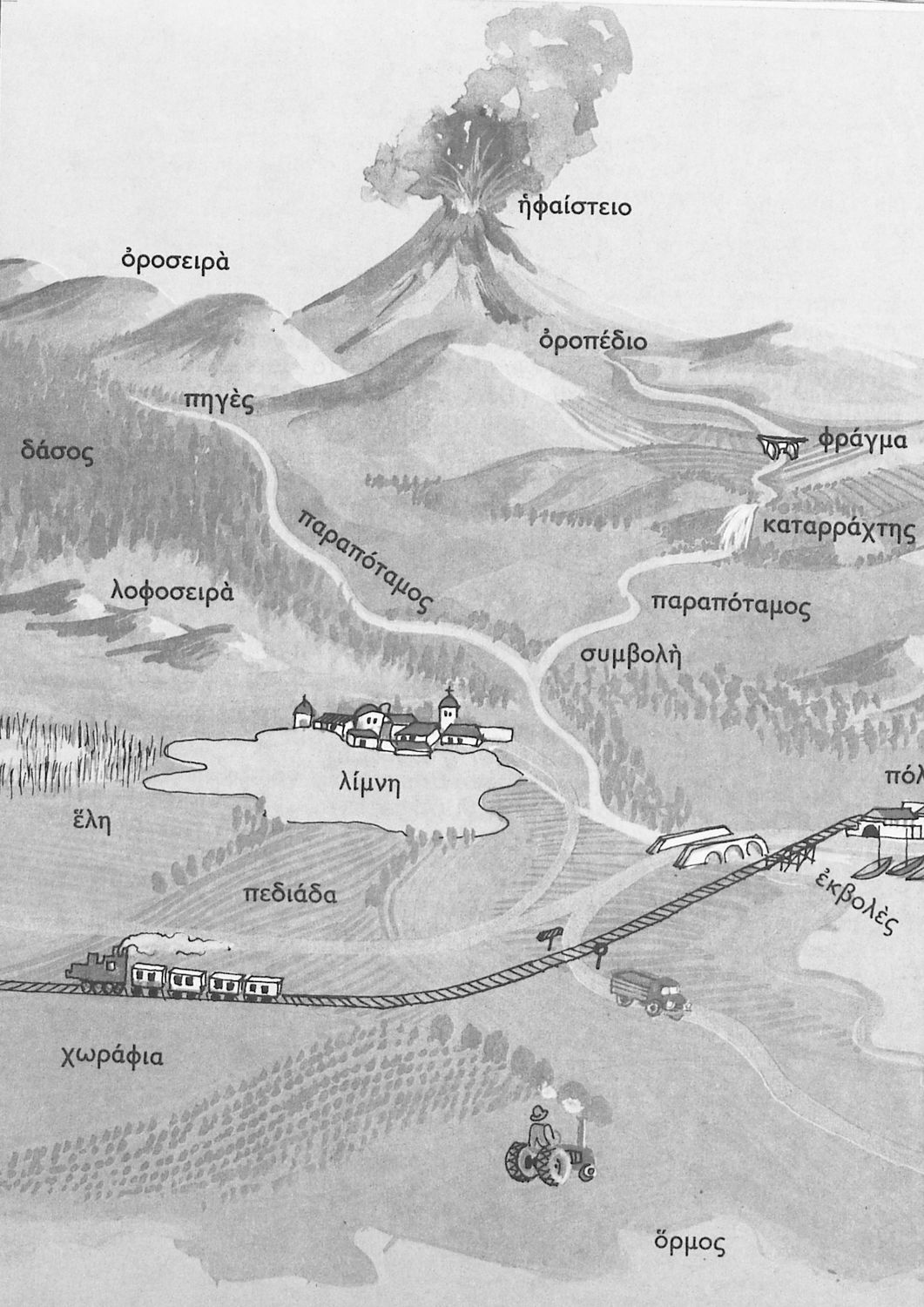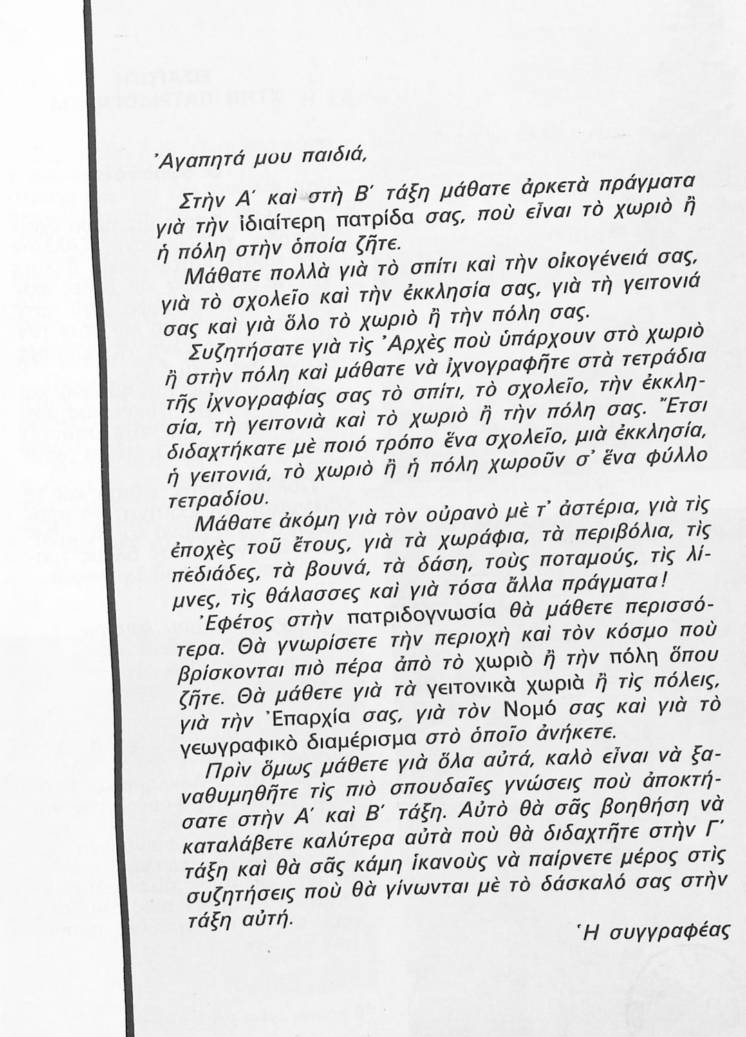 Σχολικό εγχειρίδιο Γεωγραφίας Γ ΄ και Δ' Δημοτικού. Το πρώτο μέρος του βιβλίου απευθύνεται σε μαθητές της Γ' Δημοτικού και αποτελεί μια εισαγωγή στην πατριδογνωσία με έμφαση στις παραδόσεις της ελληνικής επαρχίας. Το δεύτερο μέρος αφορά την Δ' Δημοτικού και εξετάζει την οικονομική, πολιτική και γεωφυσική γεωγραφία της Ελλάδας.