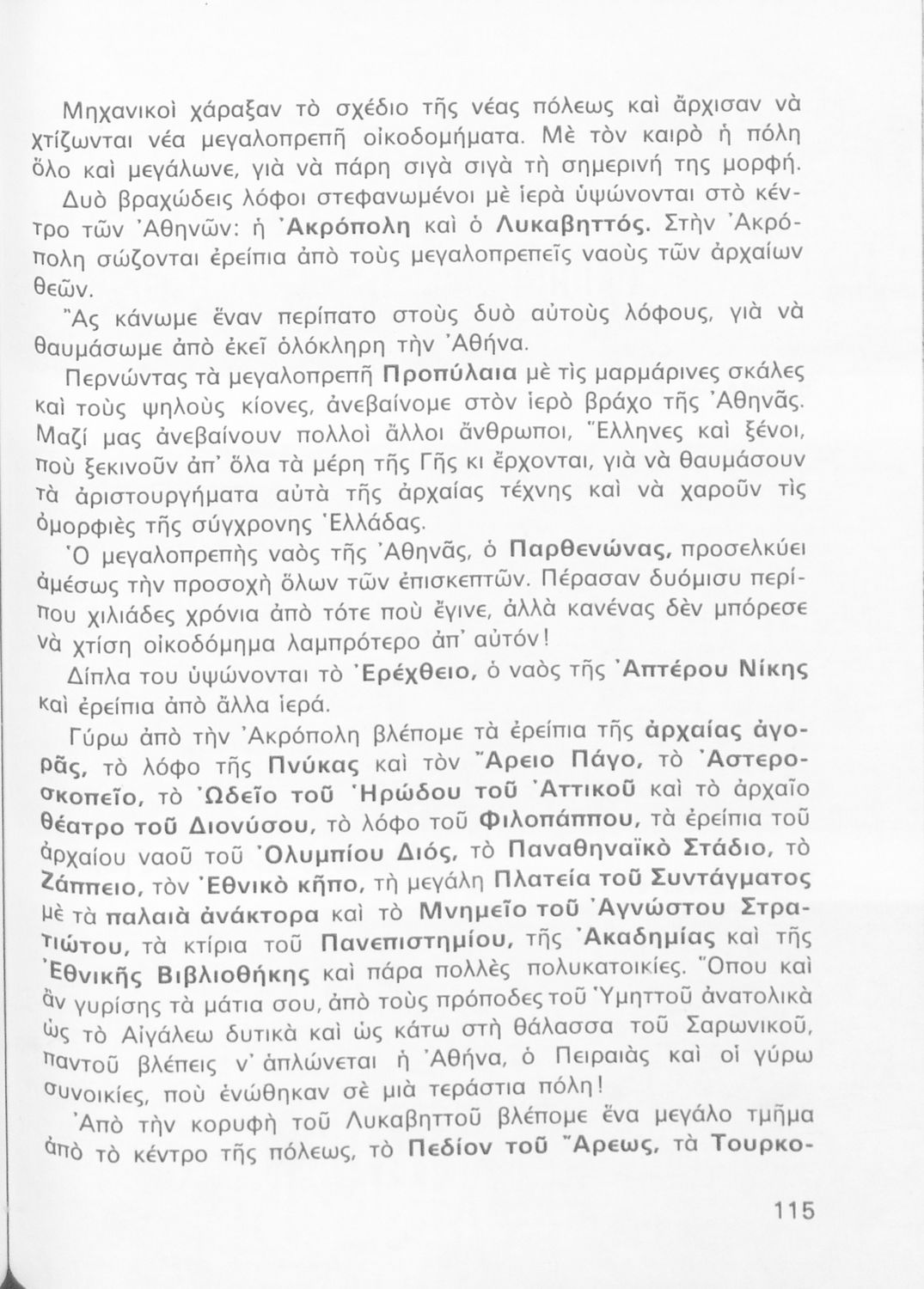 Παρουσίαση περιεχομένου: Σχολικό εγχειρίδιο Γεωγραφίας Γ ΄ και Δ' Δημοτικού. Το πρώτο μέρος του βιβλίου απευθύνεται σε μαθητές της Γ' Δημοτικού και αποτελεί μια εισαγωγή στην πατριδογνωσία με έμφαση στις παραδόσεις της ελληνικής επαρχίας. Το δεύτερο μέρος αφορά την Δ' Δημοτικού και εξετάζει την οικονομική, πολιτική και γεωφυσική γεωγραφία της Ελλάδας.
