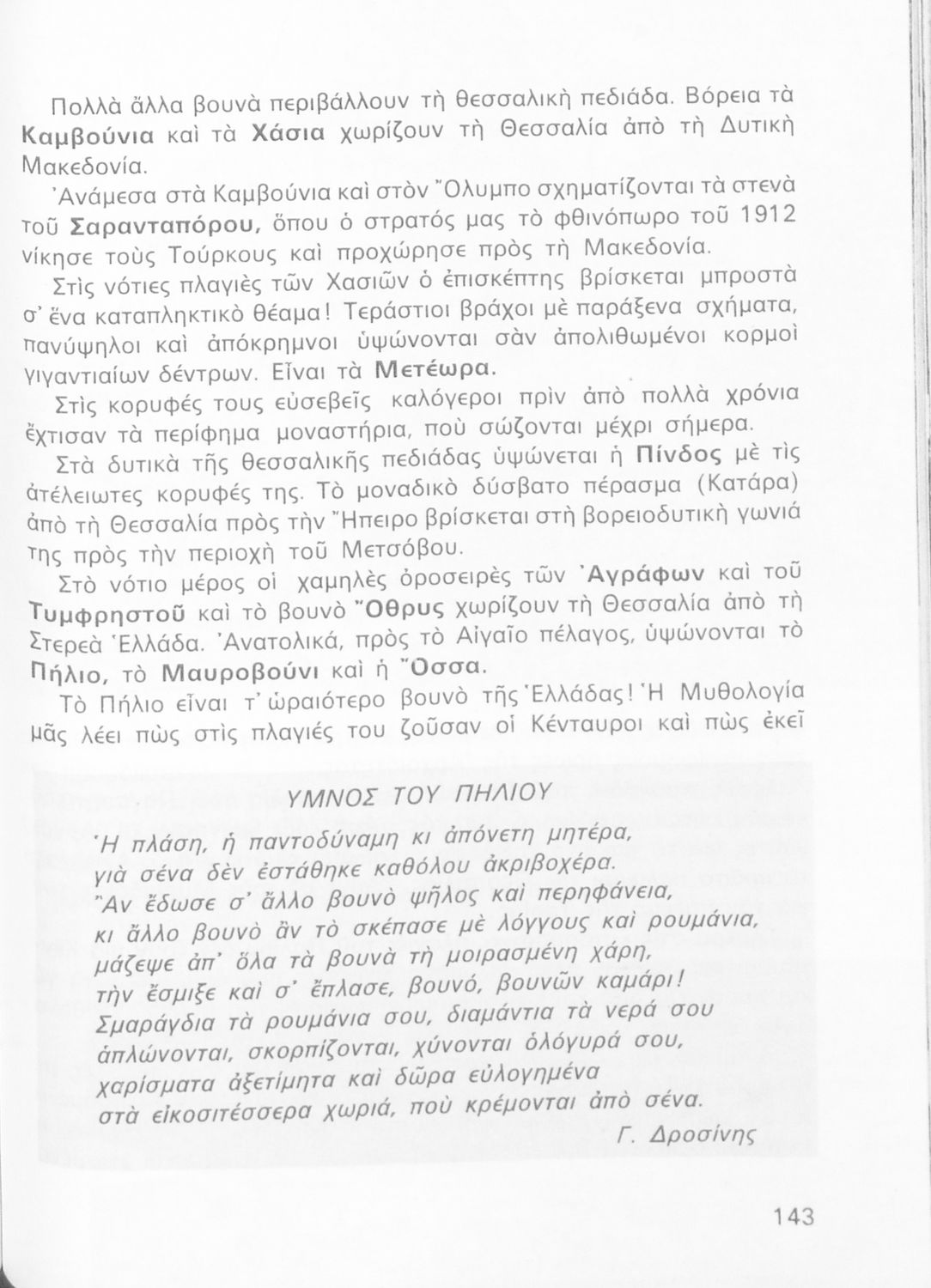 Σχολικό εγχειρίδιο Γεωγραφίας Γ ΄ και Δ' Δημοτικού. Το πρώτο μέρος του βιβλίου απευθύνεται σε μαθητές της Γ' Δημοτικού και αποτελεί μια εισαγωγή στην πατριδογνωσία με έμφαση στις παραδόσεις της ελληνικής επαρχίας. Το δεύτερο μέρος αφορά την Δ' Δημοτικού και εξετάζει την οικονομική, πολιτική και γεωφυσική γεωγραφία της Ελλάδας.