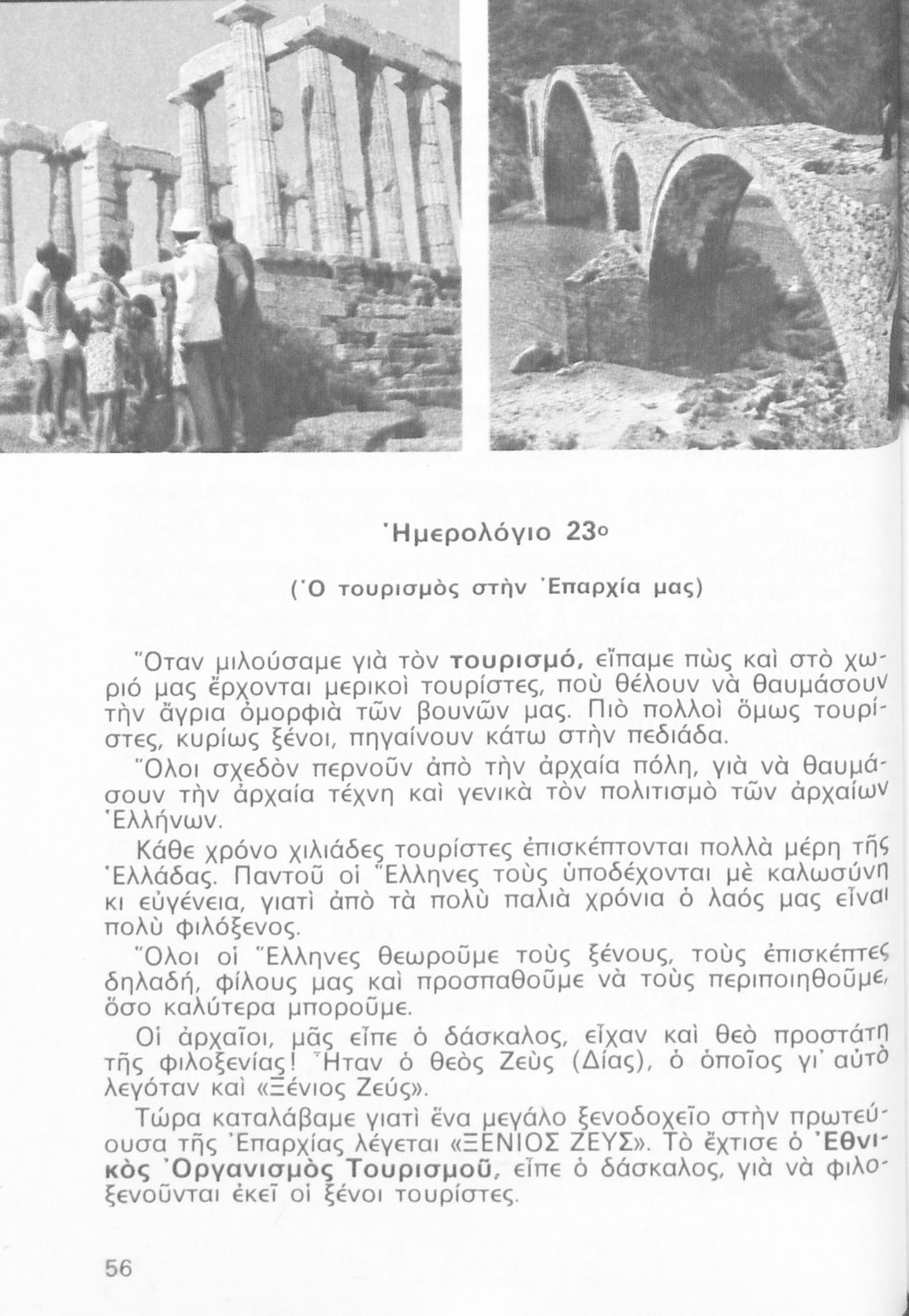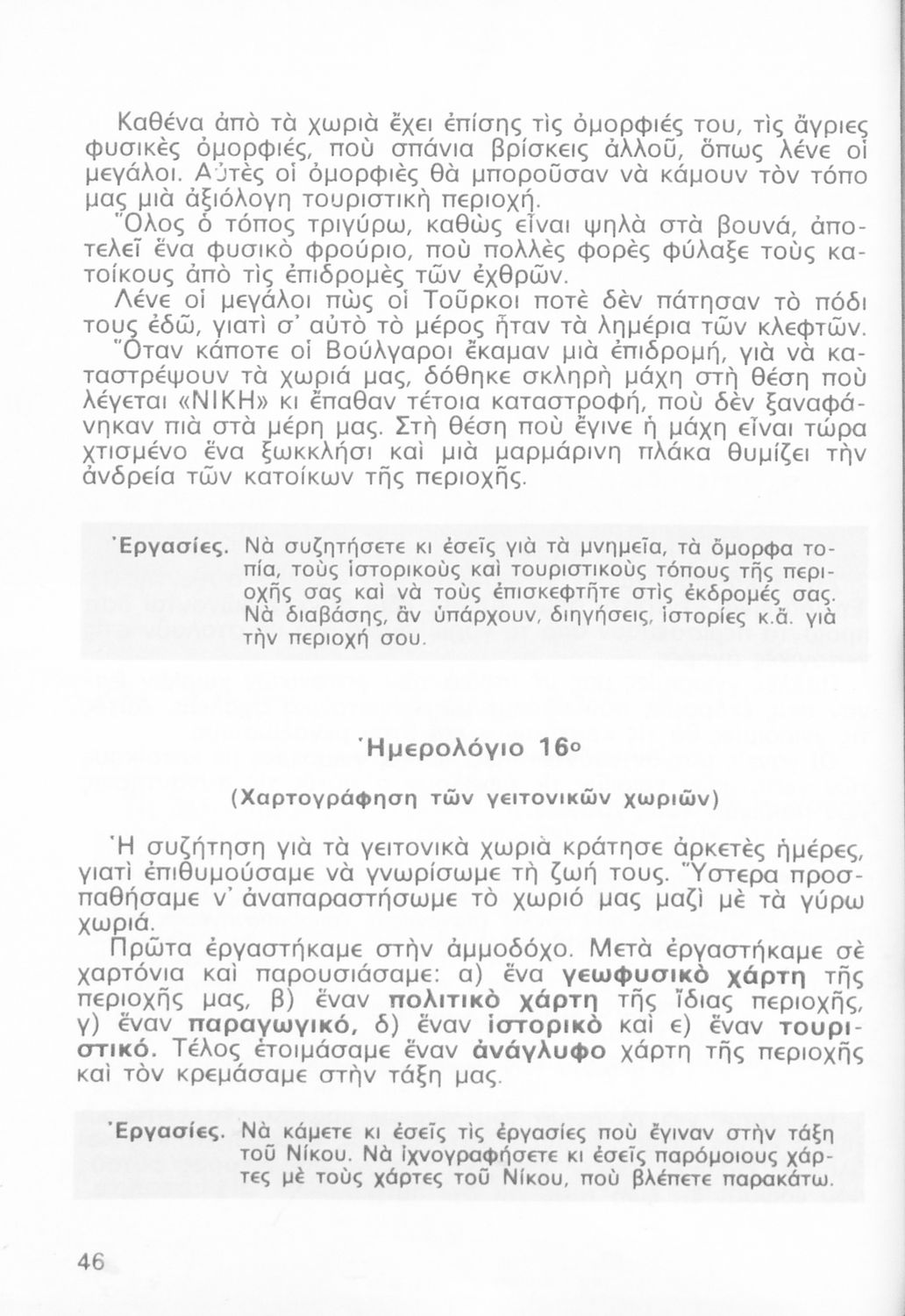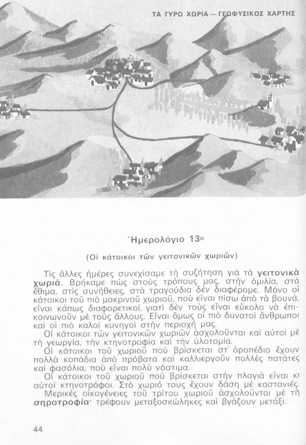 Παρουσίαση περιεχομένου: Σχολικό εγχειρίδιο Γεωγραφίας Γ ΄ και Δ' Δημοτικού. Το πρώτο μέρος του βιβλίου απευθύνεται σε μαθητές της Γ' Δημοτικού και αποτελεί μια εισαγωγή στην πατριδογνωσία με έμφαση στις παραδόσεις της ελληνικής επαρχίας. Το δεύτερο μέρος αφορά την Δ' Δημοτικού και εξετάζει την οικονομική, πολιτική και γεωφυσική γεωγραφία της Ελλάδας.
