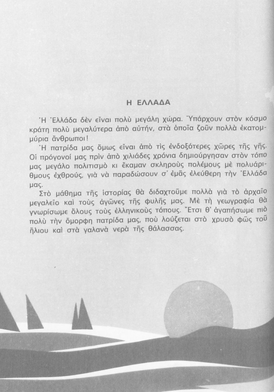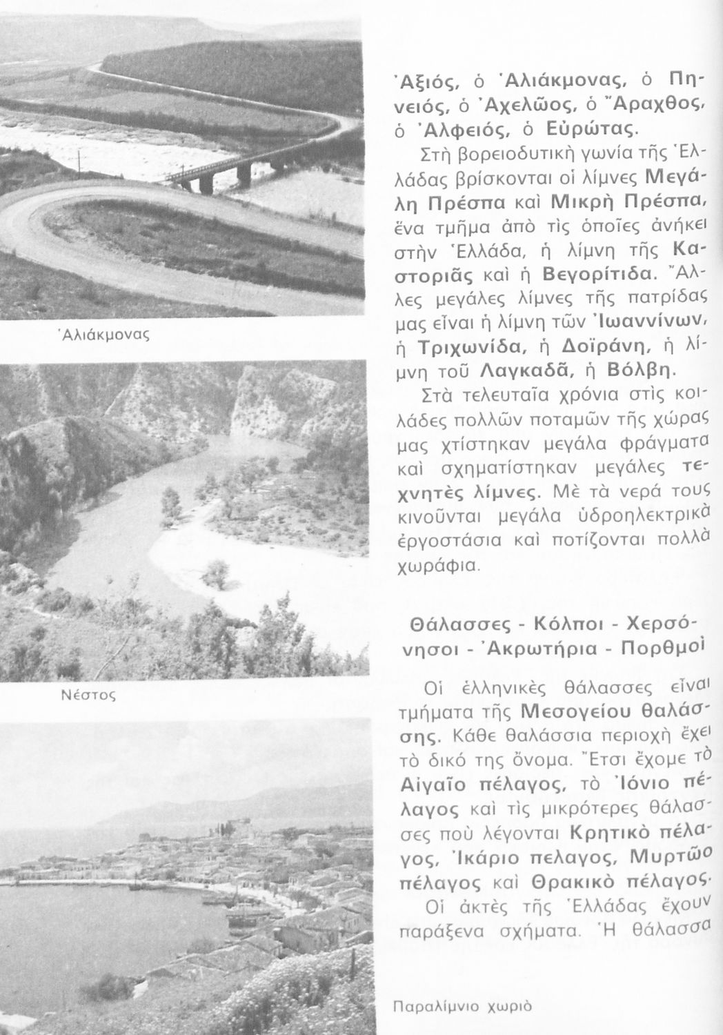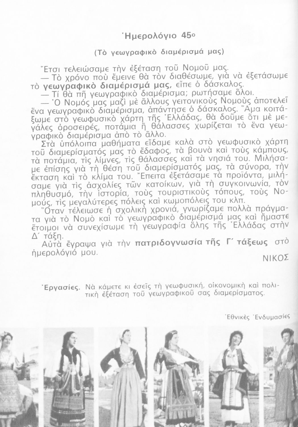 Σχολικό εγχειρίδιο Γεωγραφίας Γ ΄ και Δ' Δημοτικού. Το πρώτο μέρος του βιβλίου απευθύνεται σε μαθητές της Γ' Δημοτικού και αποτελεί μια εισαγωγή στην πατριδογνωσία με έμφαση στις παραδόσεις της ελληνικής επαρχίας. Το δεύτερο μέρος αφορά την Δ' Δημοτικού και εξετάζει την οικονομική, πολιτική και γεωφυσική γεωγραφία της Ελλάδας.