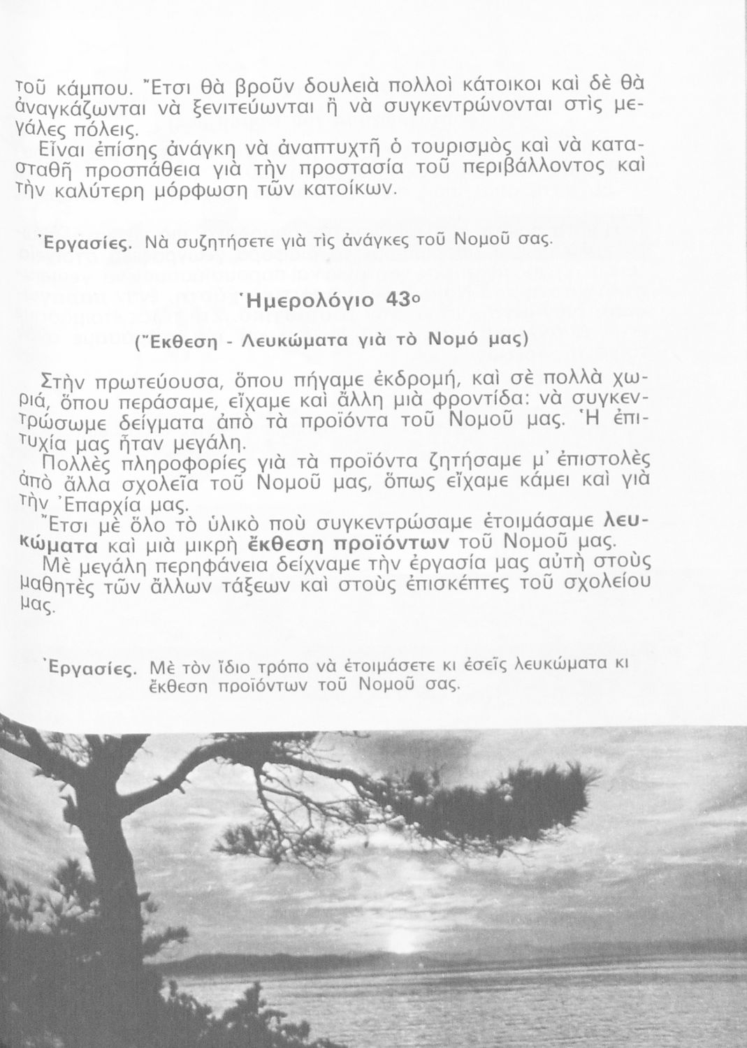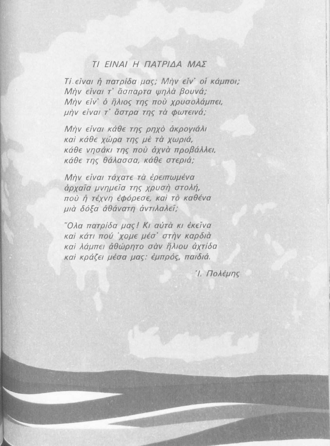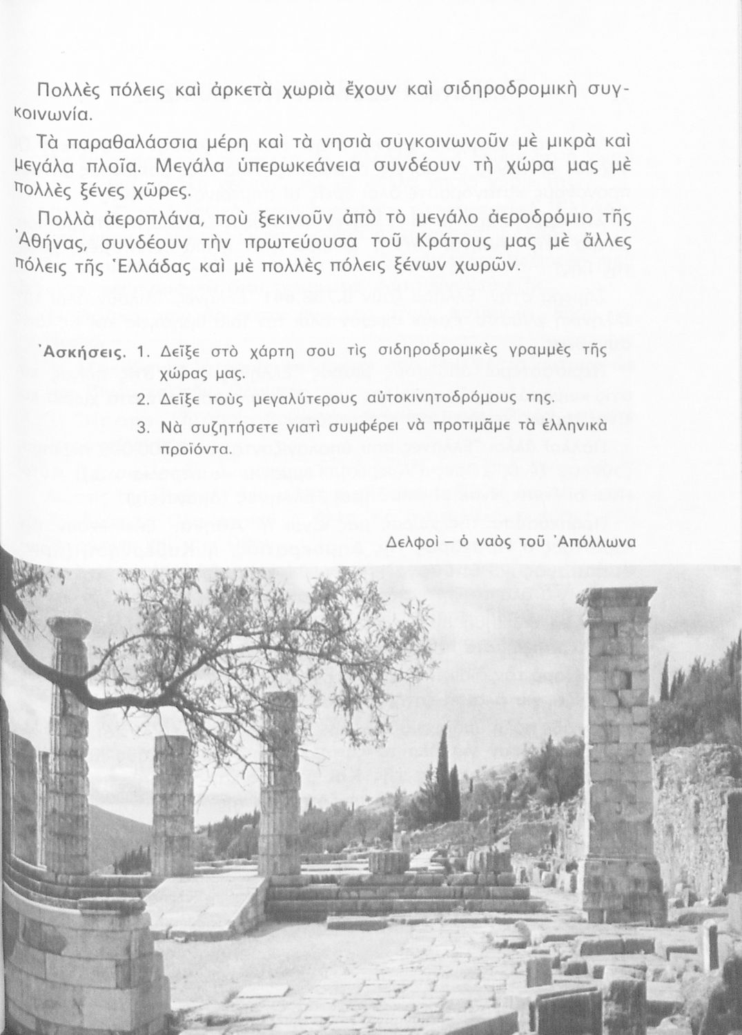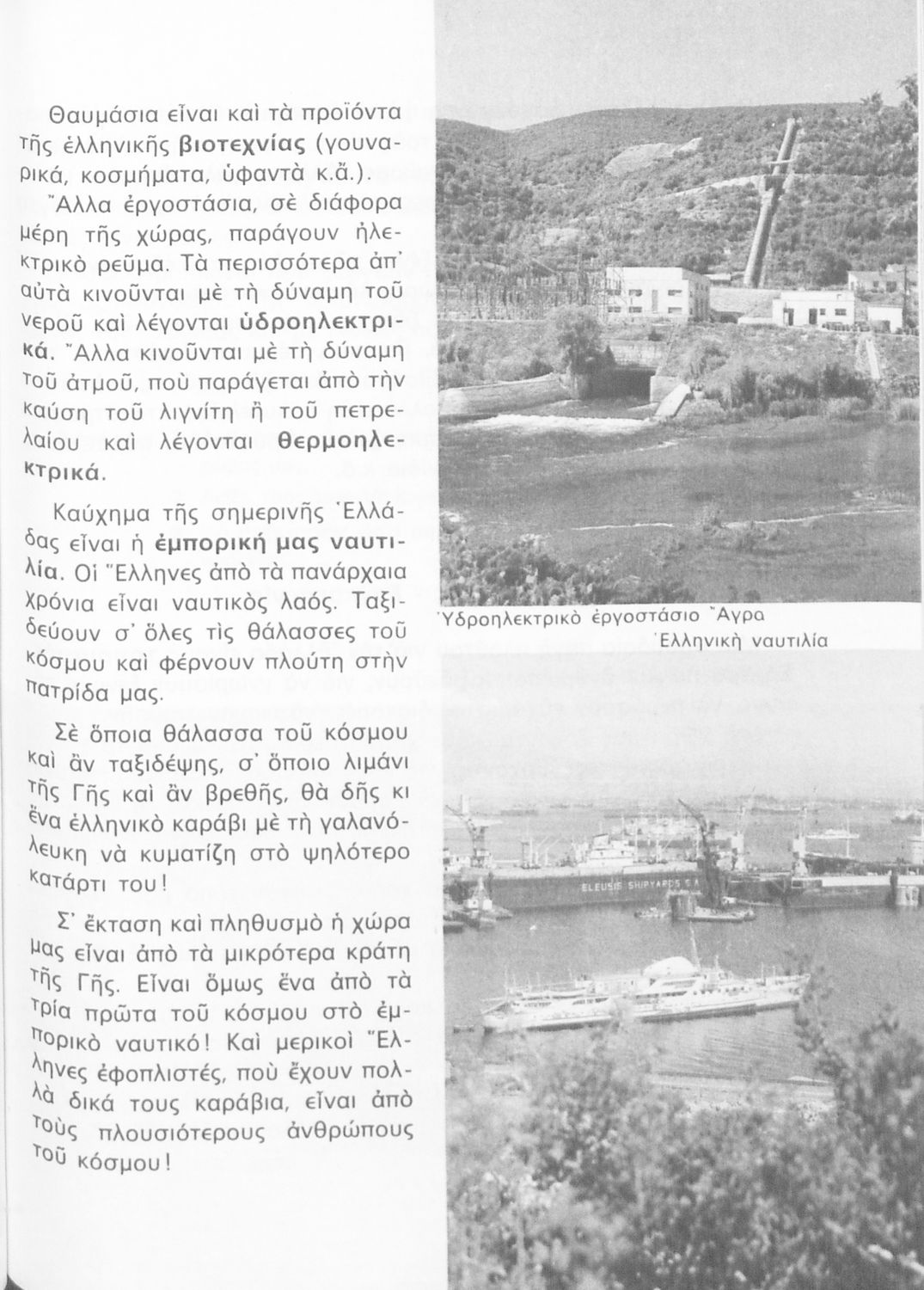 Σχολικό εγχειρίδιο Γεωγραφίας Γ ΄ και Δ' Δημοτικού. Το πρώτο μέρος του βιβλίου απευθύνεται σε μαθητές της Γ' Δημοτικού και αποτελεί μια εισαγωγή στην πατριδογνωσία με έμφαση στις παραδόσεις της ελληνικής επαρχίας. Το δεύτερο μέρος αφορά την Δ' Δημοτικού και εξετάζει την οικονομική, πολιτική και γεωφυσική γεωγραφία της Ελλάδας.